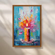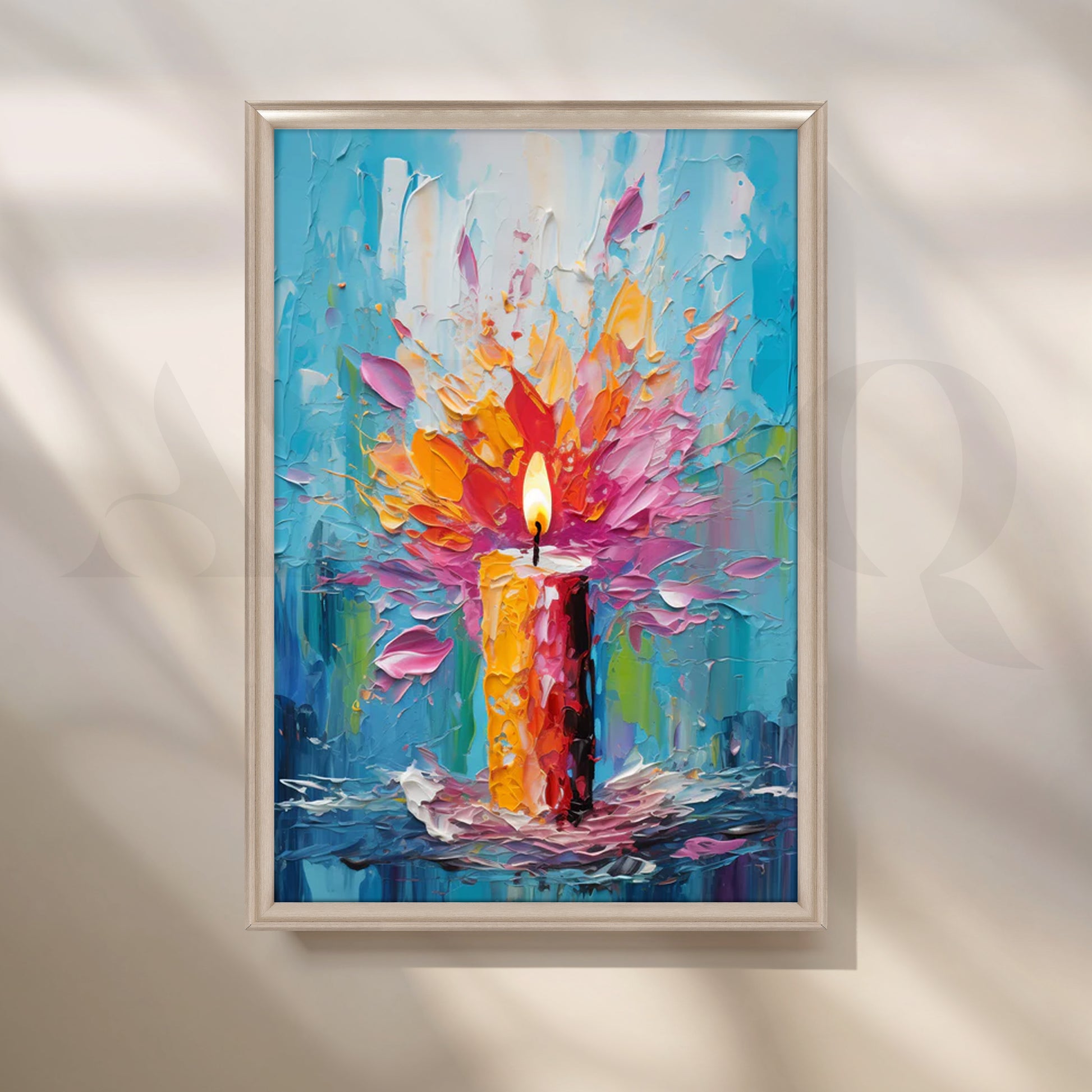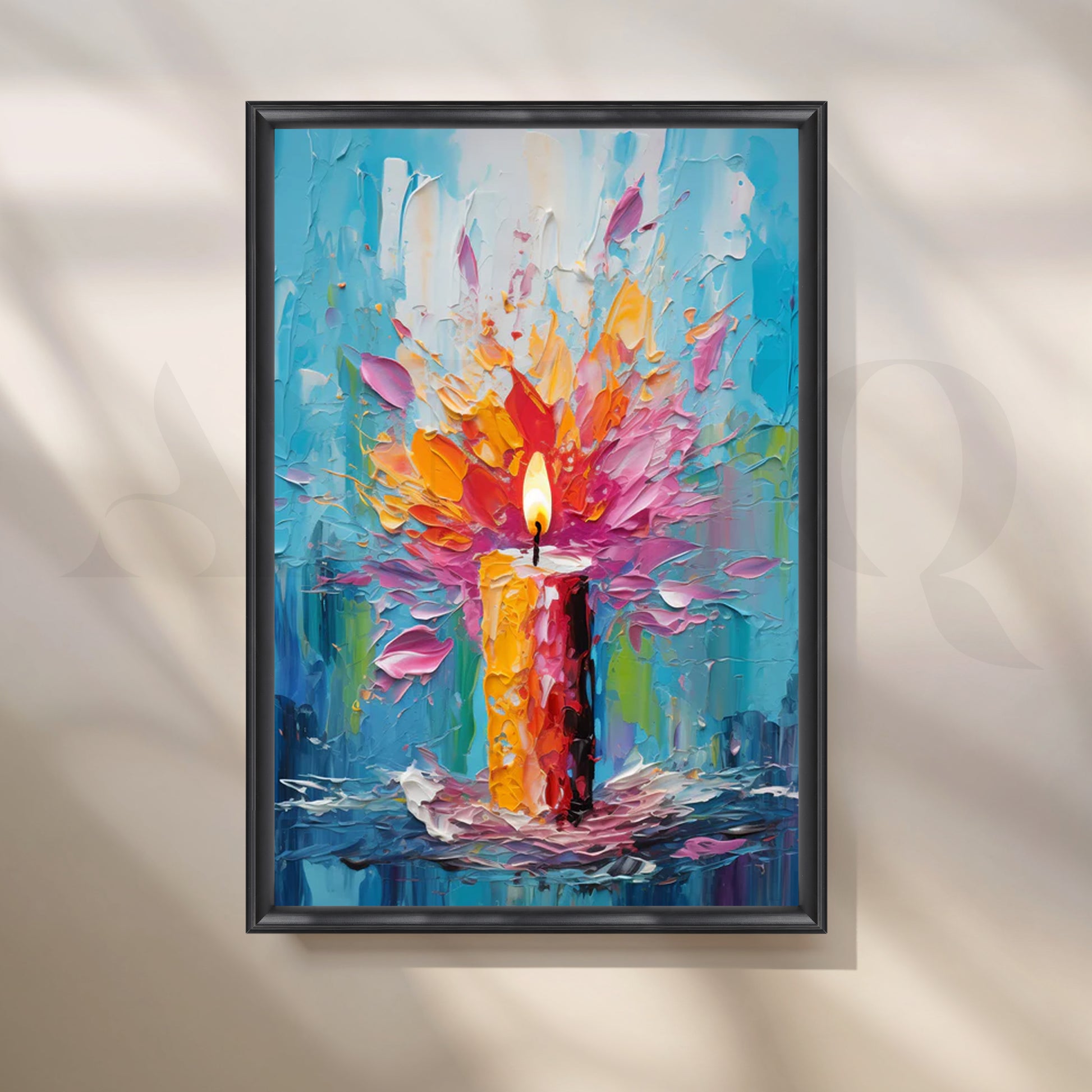 “Luminous Bloom” ignites the room with a single glowing candle bursting into petals of magenta, coral, and sunny yellow against a tranquil turquoise ground. Thick palette-knife strokes and impasto texture make this abstract canvas painting read like gallery-worthy modern wall art, perfect as large living room art, calm bedroom décor, or a welcoming entryway statement. Its uplifting color palette pairs beautifully with neutral sofas and warm wood accents, adding cozy ambiance to contemporary, boho, or minimalist interiors. Ideal for shoppers seeking colorful wall art, textured canvas art, and modern home décor that brings warmth, light, and hope to everyday spaces.