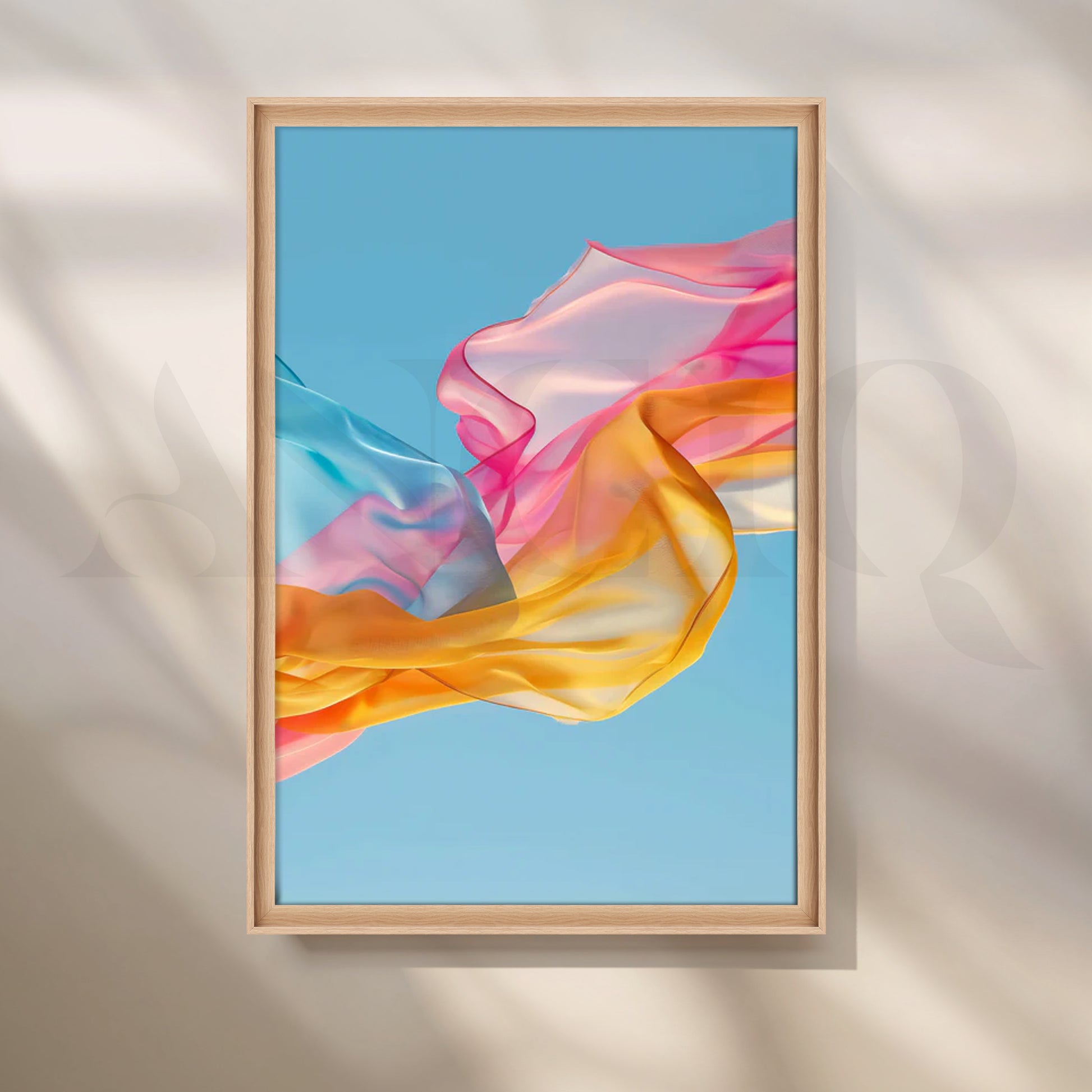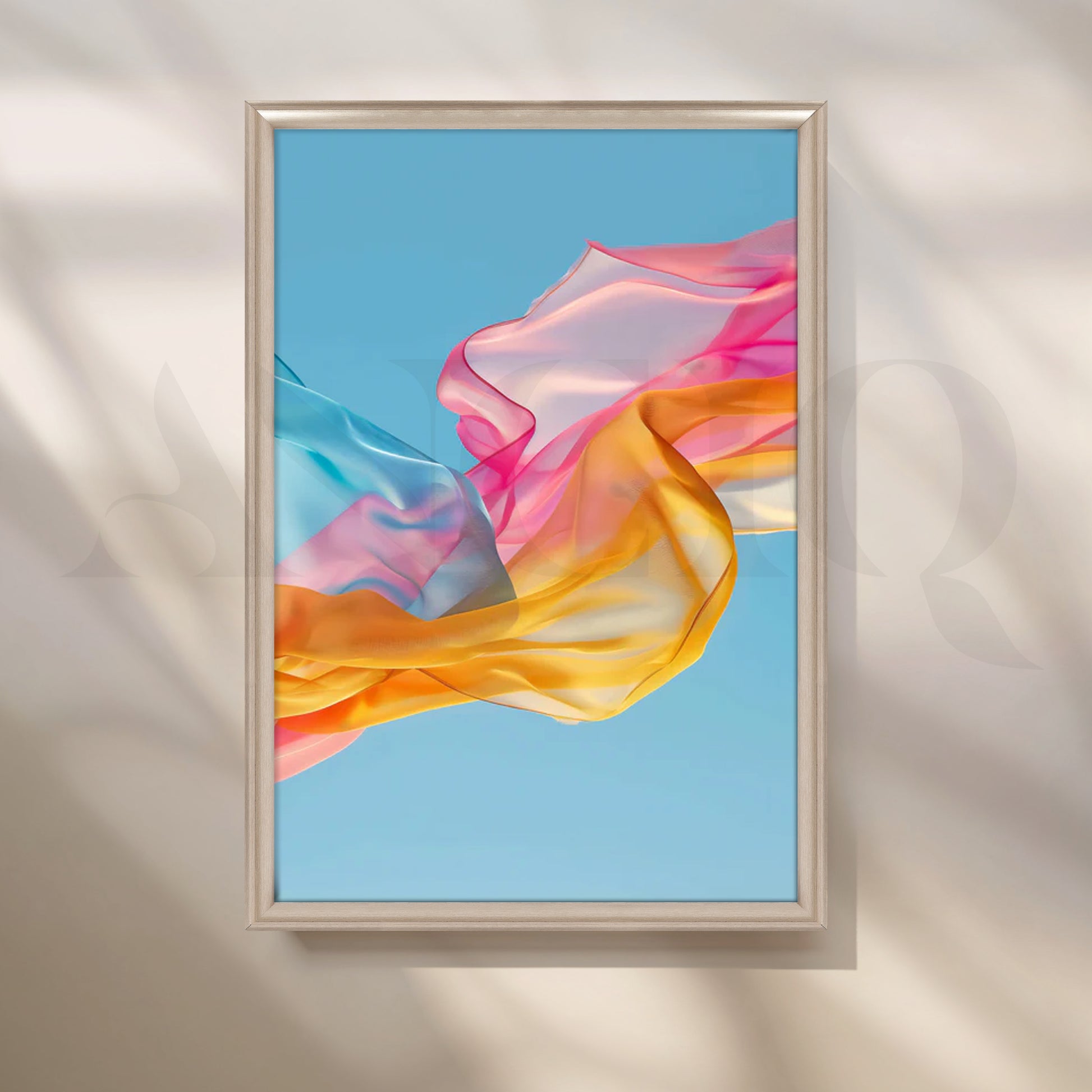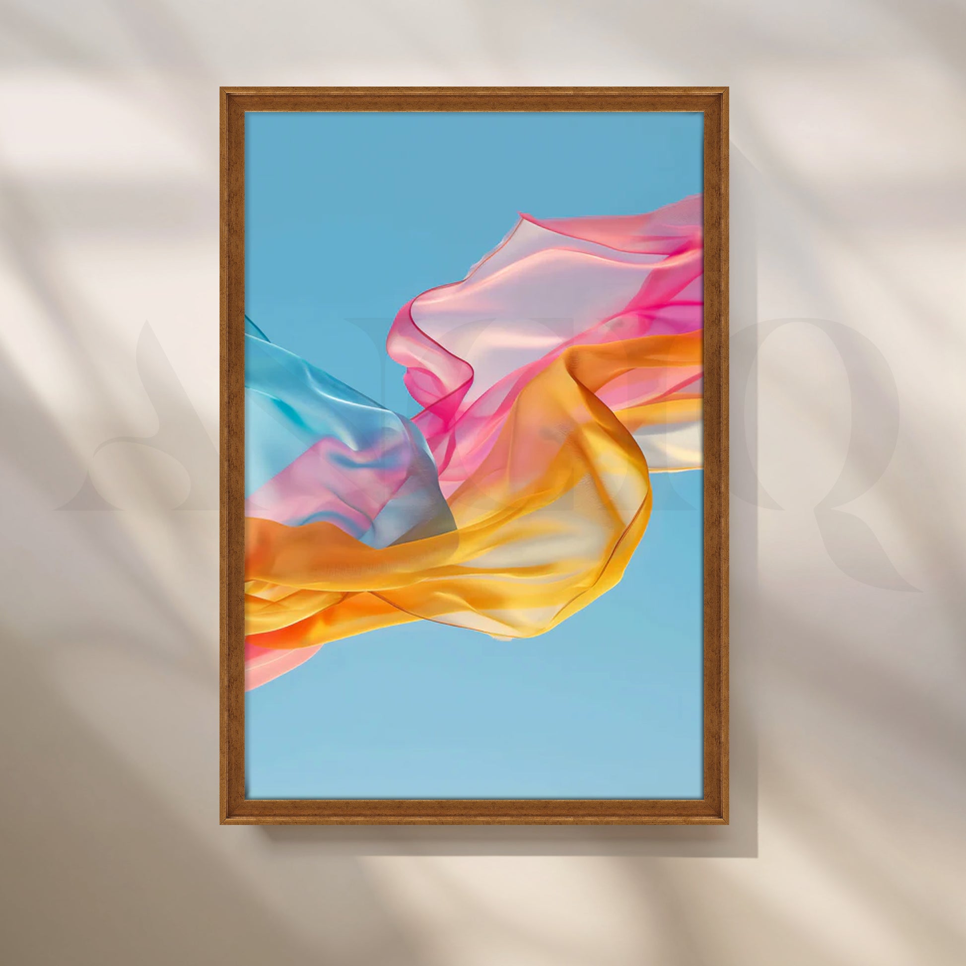 Breezy ribbons of translucent fabric drift across a clear blue sky in pink, gold, and aqua—perfect for modern wall art lovers. This airy abstract canvas painting brings light, movement, and a summer vibe to a large living room, open-plan space, or bright hallway. Soft pastels and clean minimal composition make it easy to style with contemporary décor, coastal interiors, or boho bedroom décor while adding a fresh pop of color as large living room art.