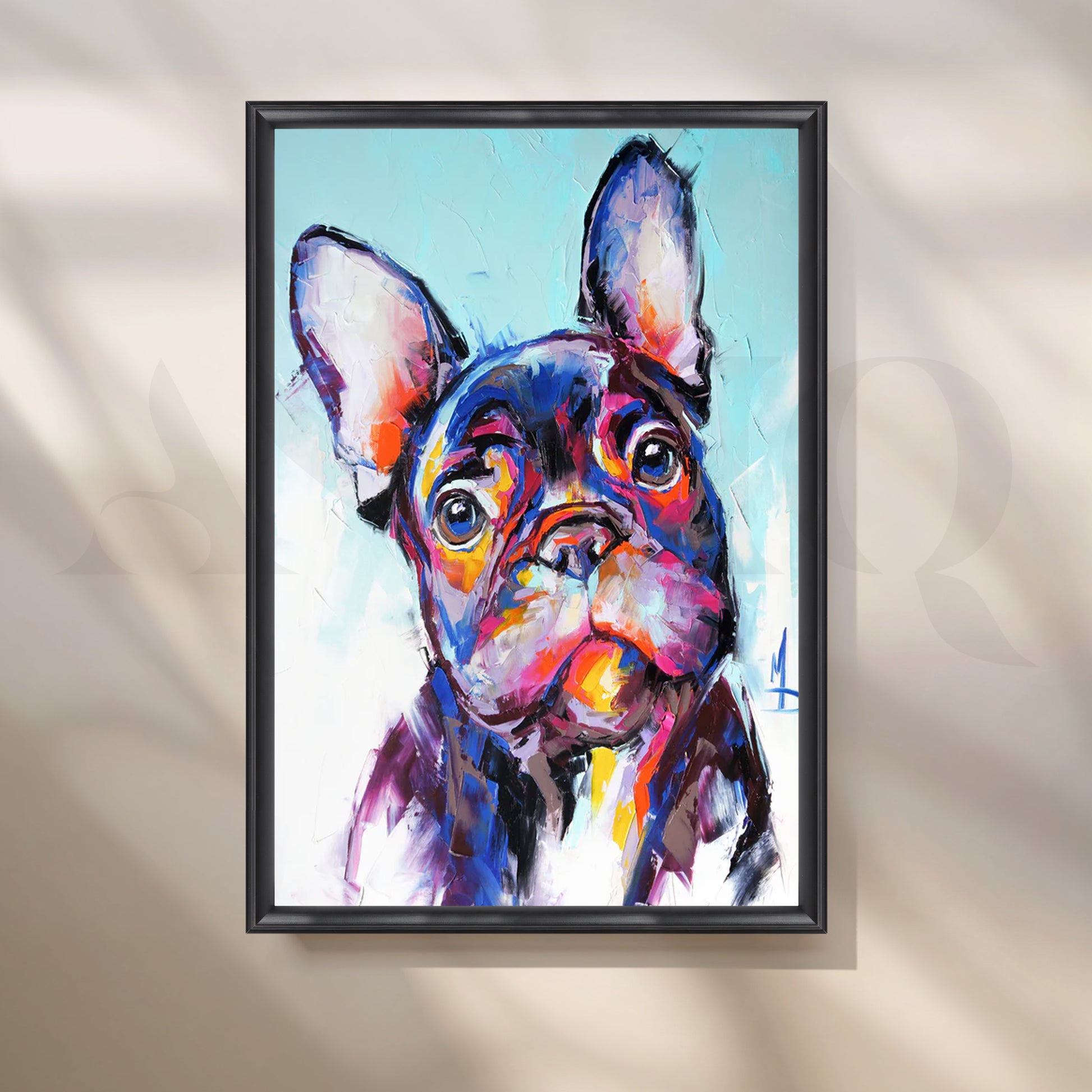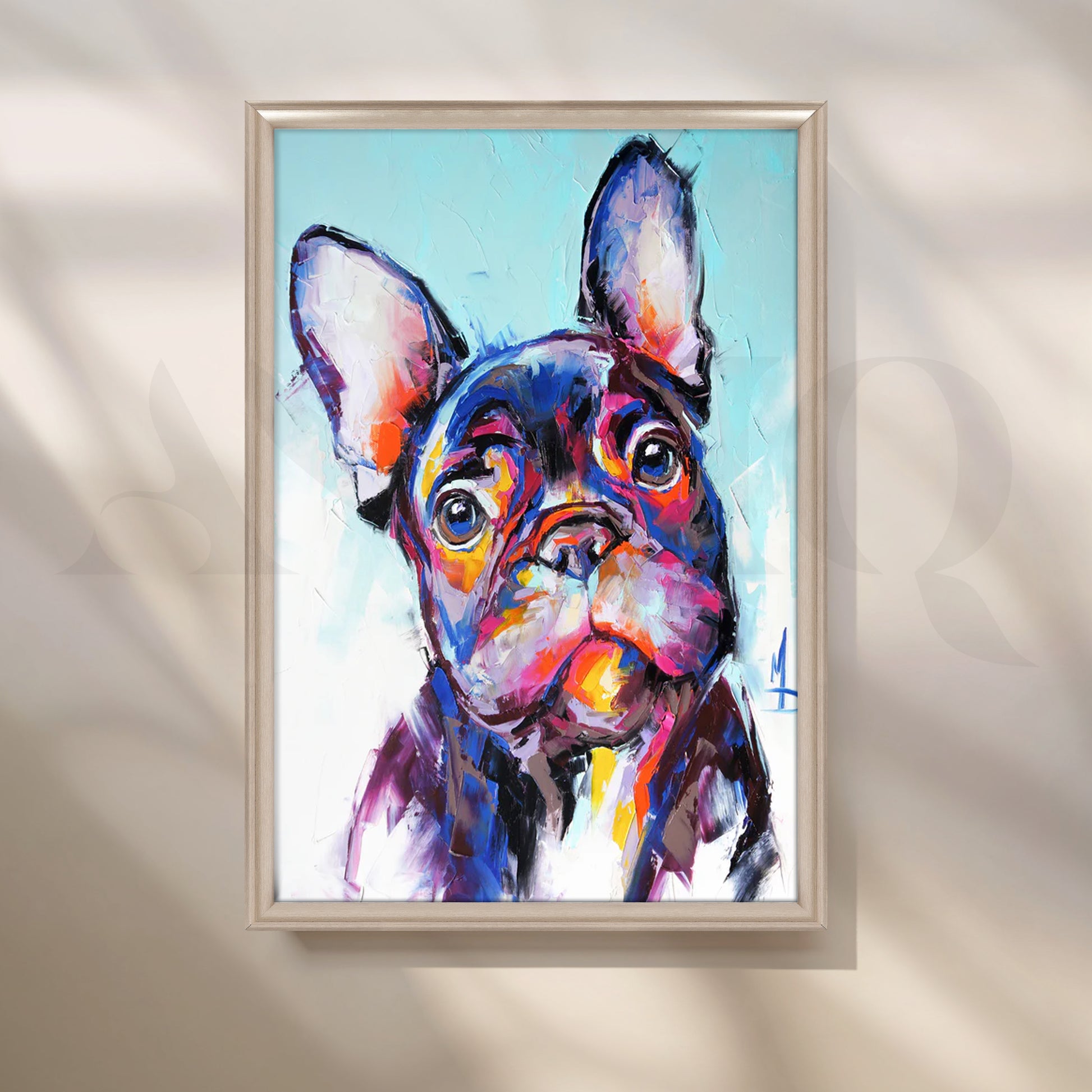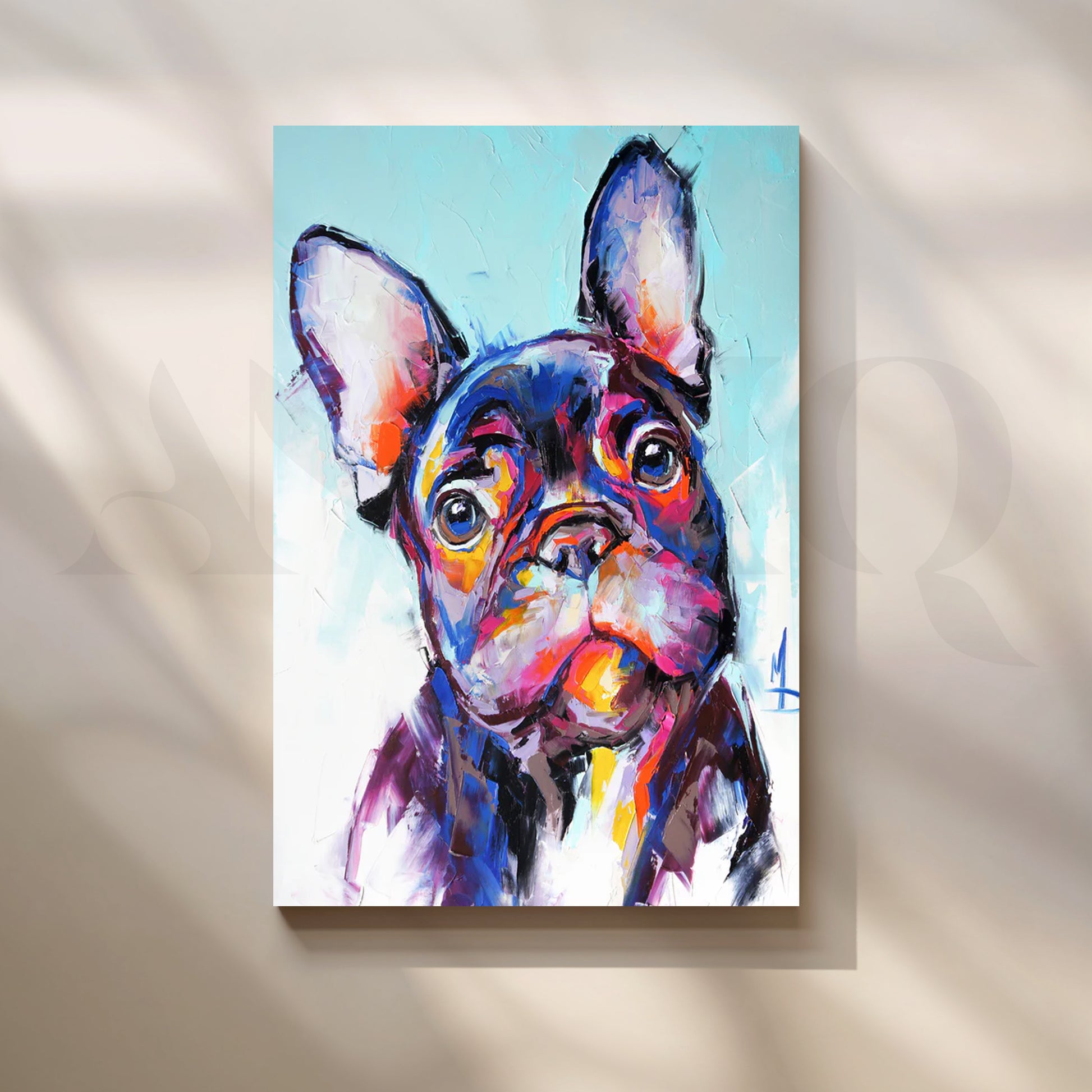 Playful French bulldog portrait in bold pop-art colors—turquoise, magenta, orange and violet—with palette-knife texture and expressive eyes. Perfect for kids rooms, living rooms and pet-friendly homes. Keywords: French bulldog wall art, Frenchie canvas painting, colorful dog art, pop art pet portrait, nursery/kids room décor, modern animal artwork, vibrant wall decor.