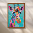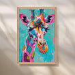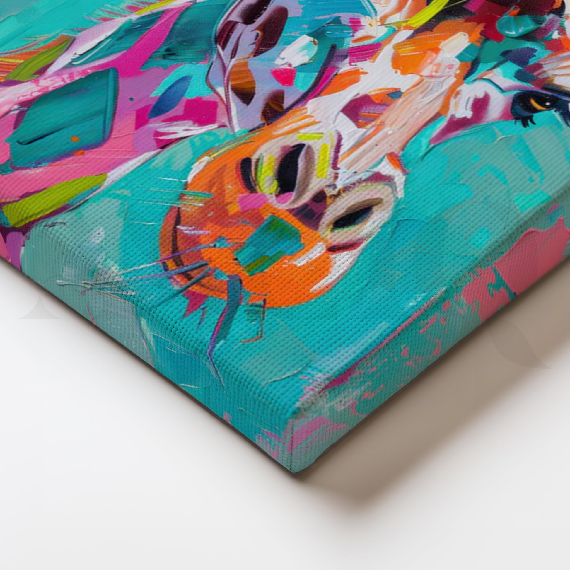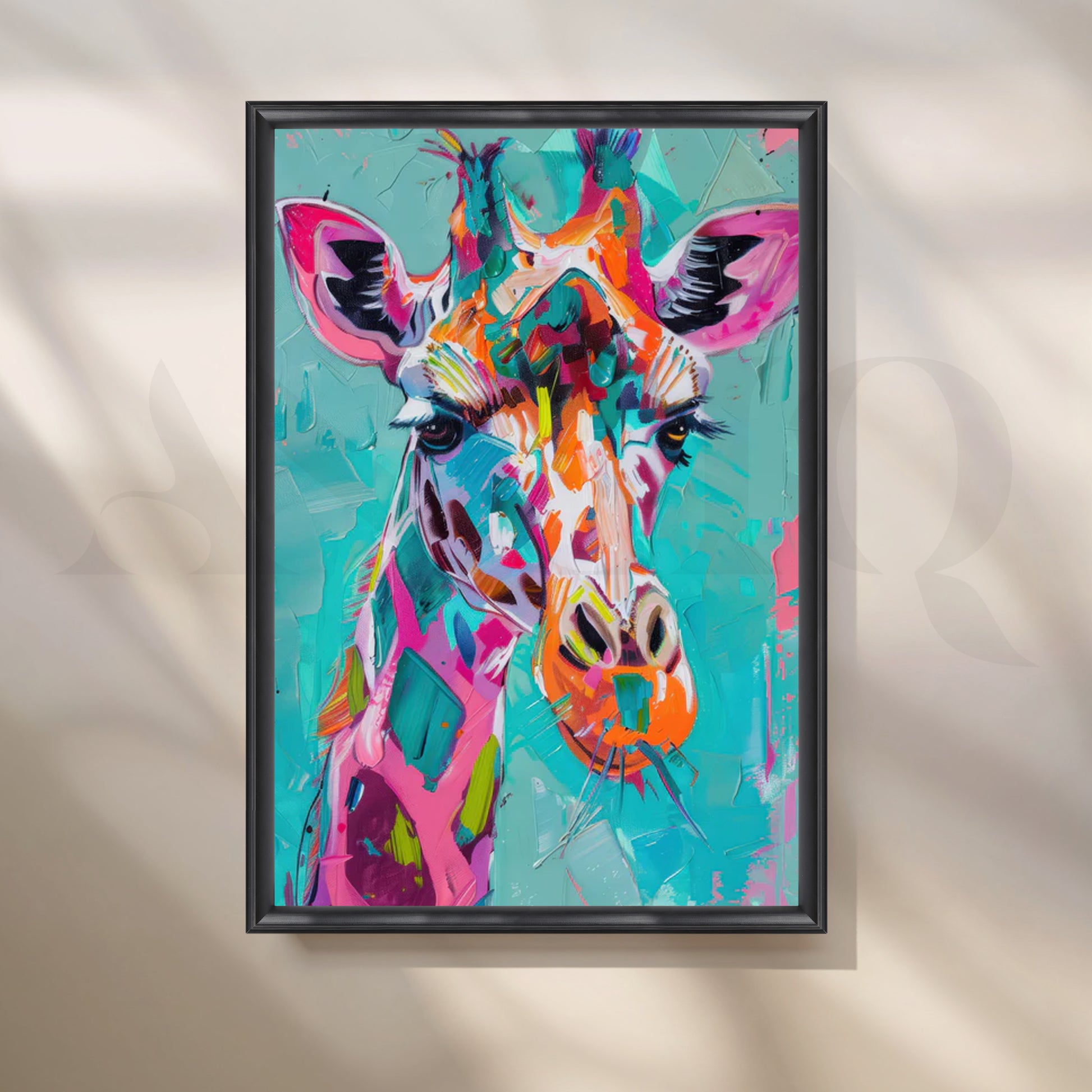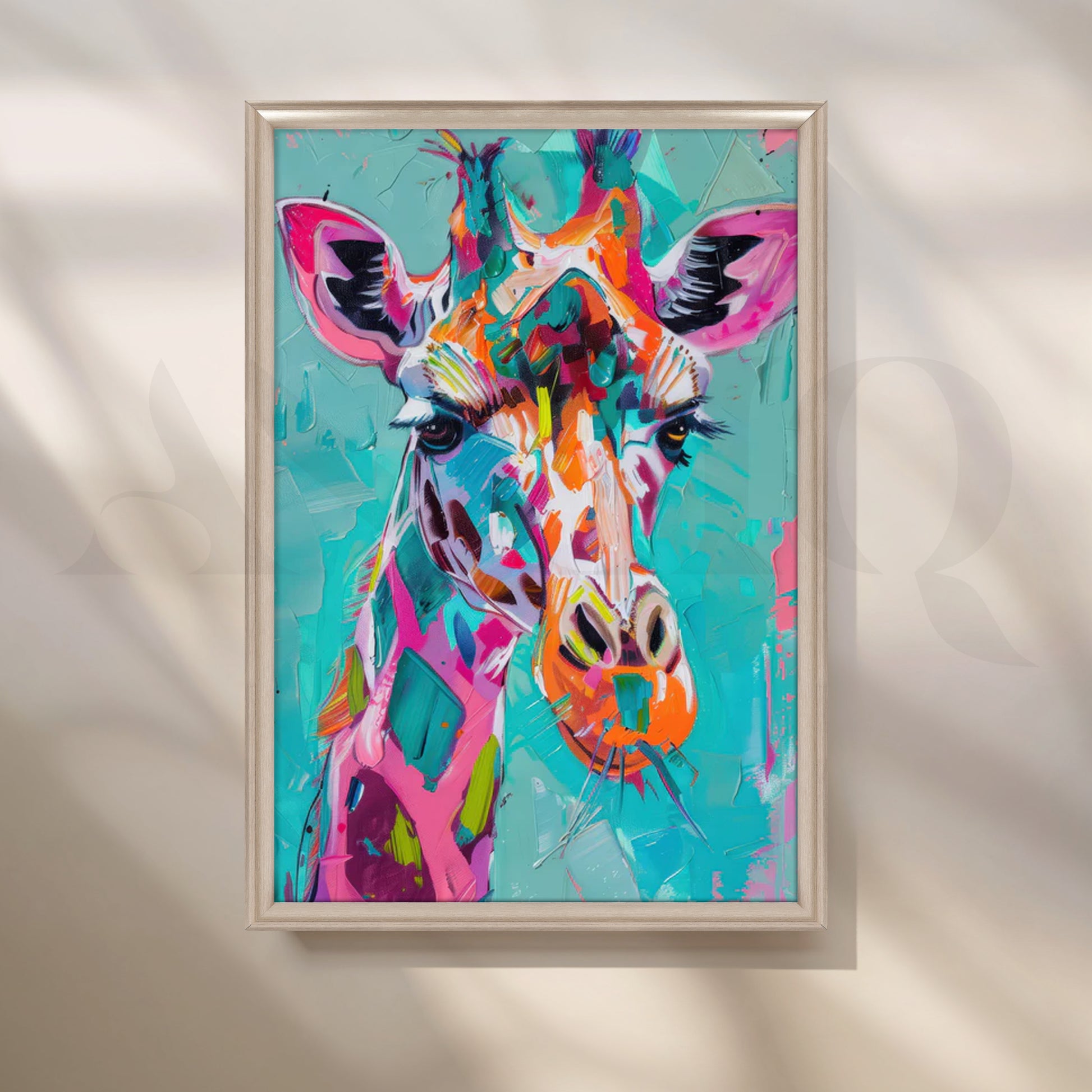 A vibrant giraffe portrait painted in bold teal, pink, orange and lime with energetic palette-knife strokes and expressive eyes. This colorful animal wall art adds fun, personality and instant pop to kids rooms, playrooms and creative corners. Keywords: giraffe wall art, animal pop art canvas, colorful giraffe painting, kids room wall decor, nursery artwork, teal and pink wall art, modern living room décor, quirky animal poster, vibrant canvas print.
