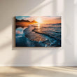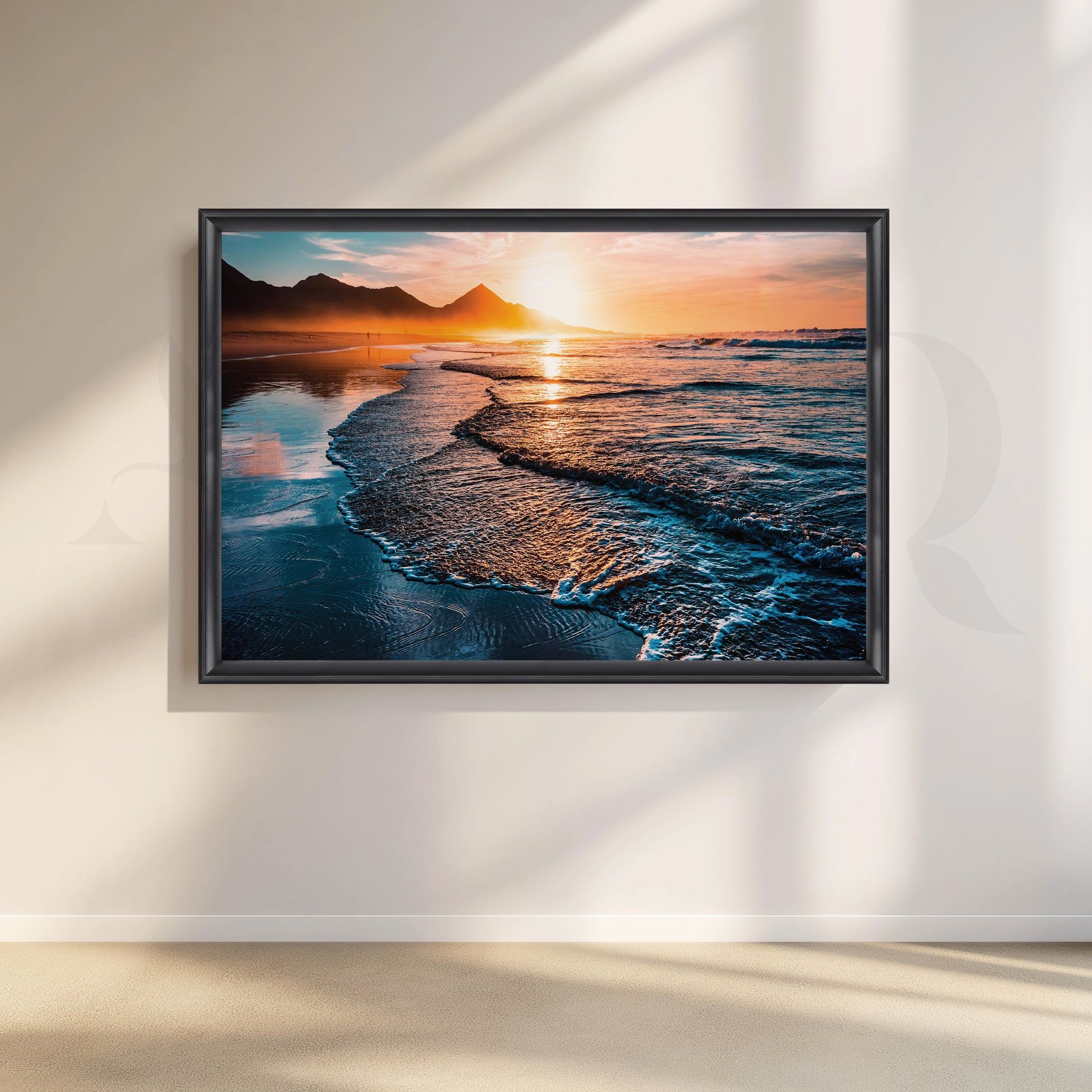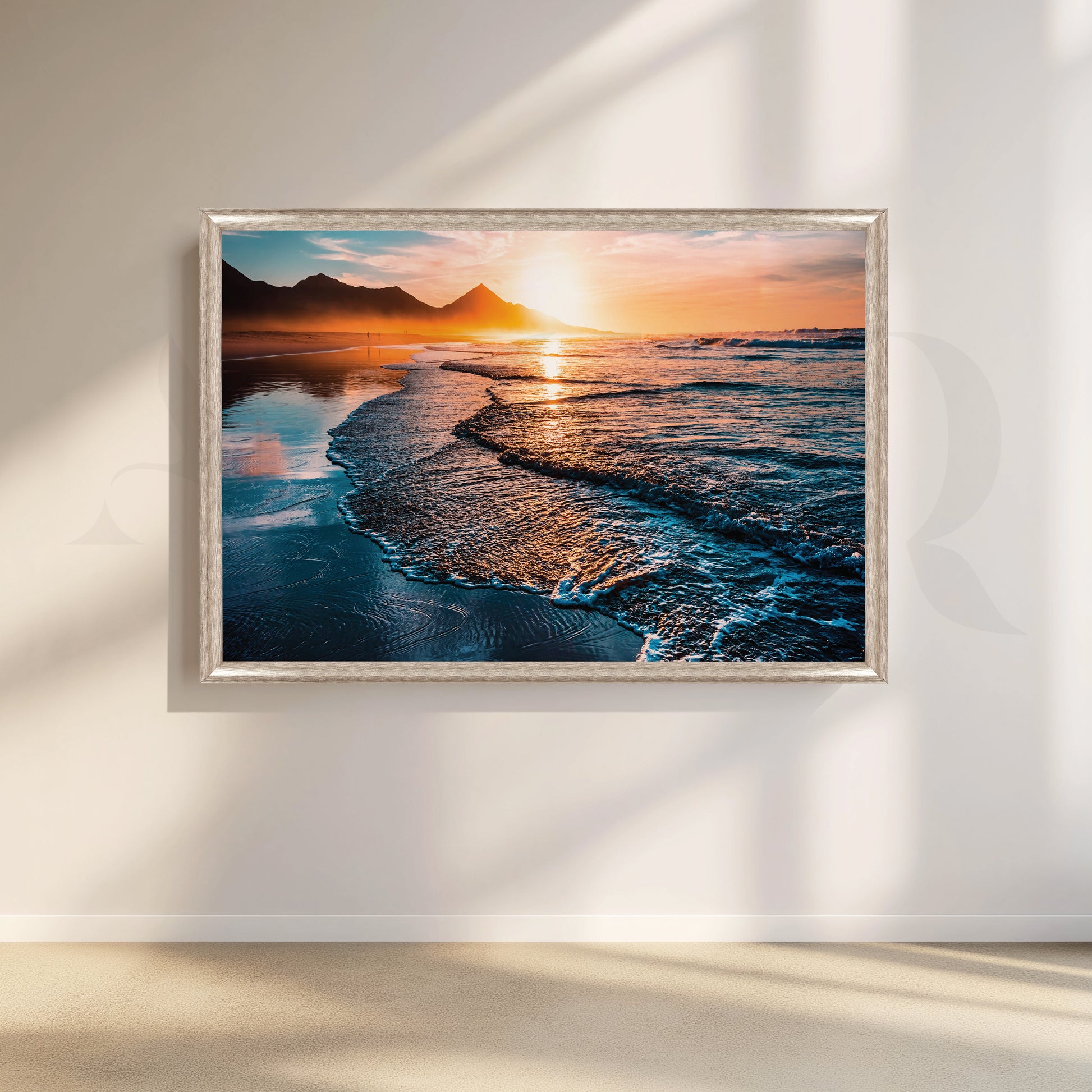 Capture the breathtaking drama of a fiery sunset. This captivating painting depicts a vibrant sky ablaze with orange and red hues, bleeding into a deep, rolling ocean. Imagine the warmth on your face and the sound of crashing waves as you bring a touch of coastal majesty to your home.