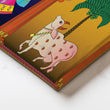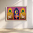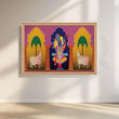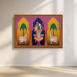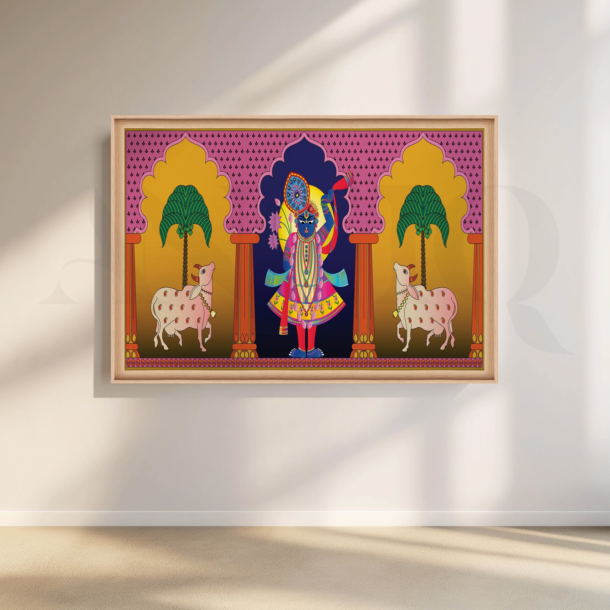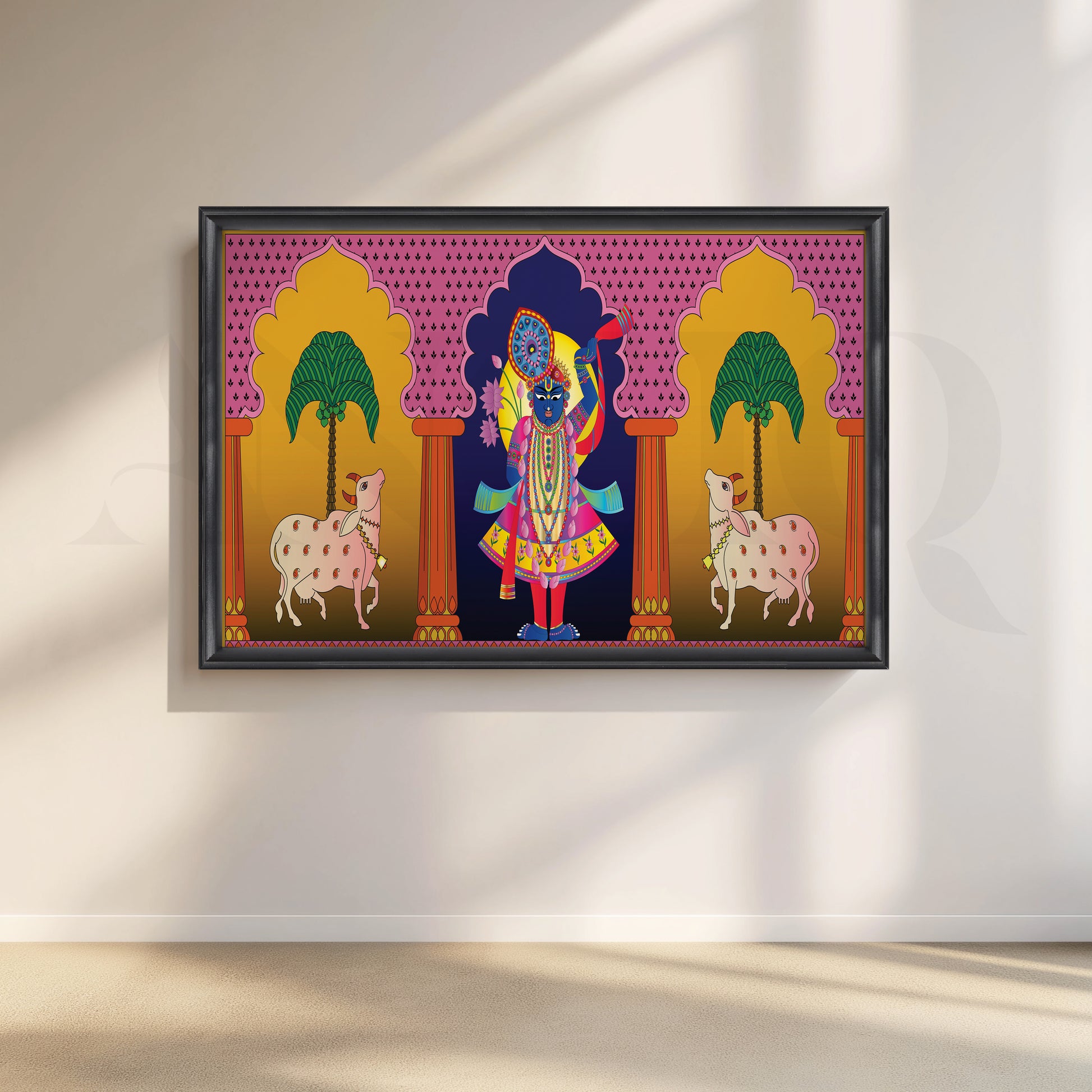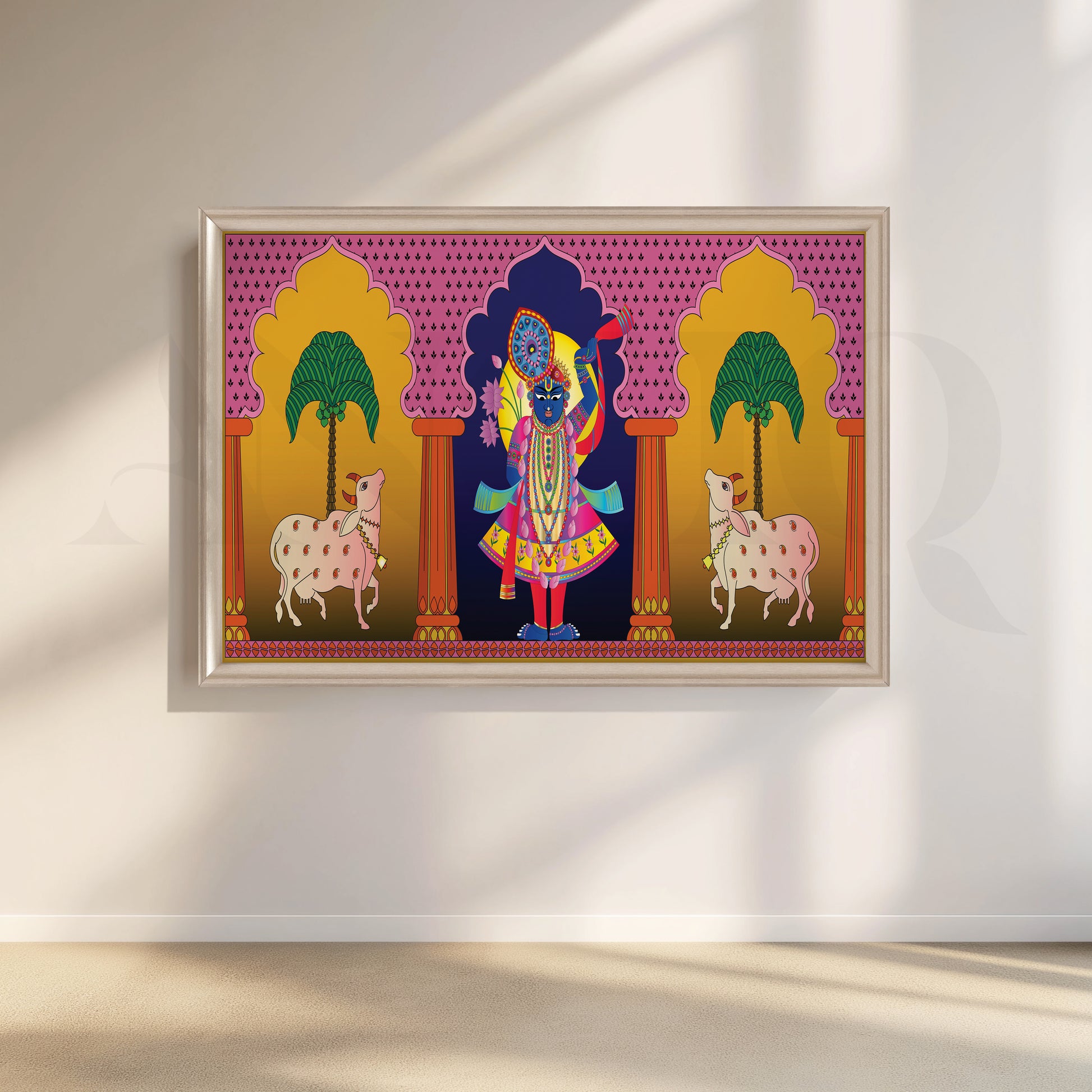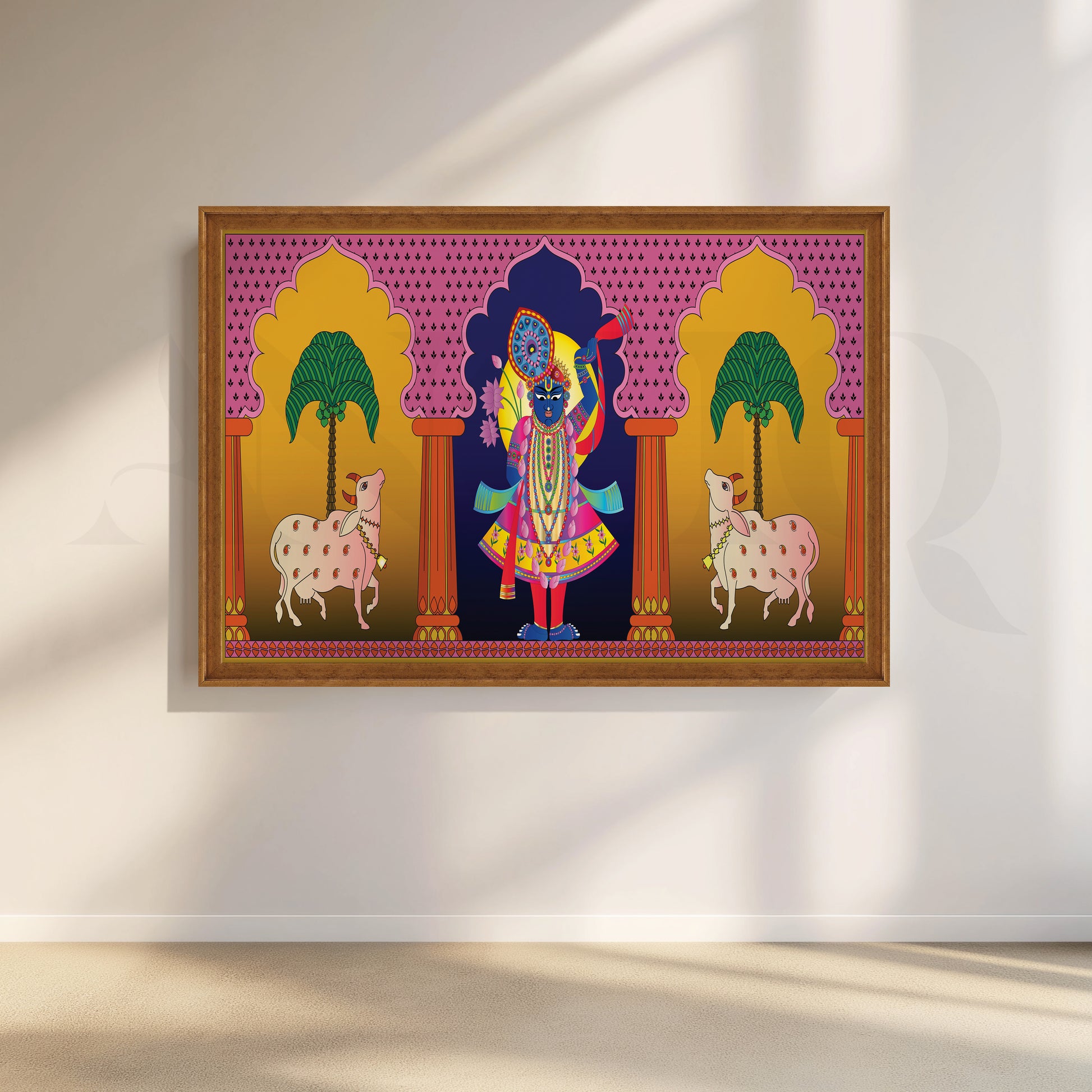 This is an attractive picture that depicts a religious painting of Krishna in colorful dresses, sacred cows together with palm trees in their natural environment showing classical Indian arts which is full of life. These colorful hues, exquisite designs represent the cultural and spiritual heritage of Indian mythologies. A must-see for art lovers and explorers of cultures.