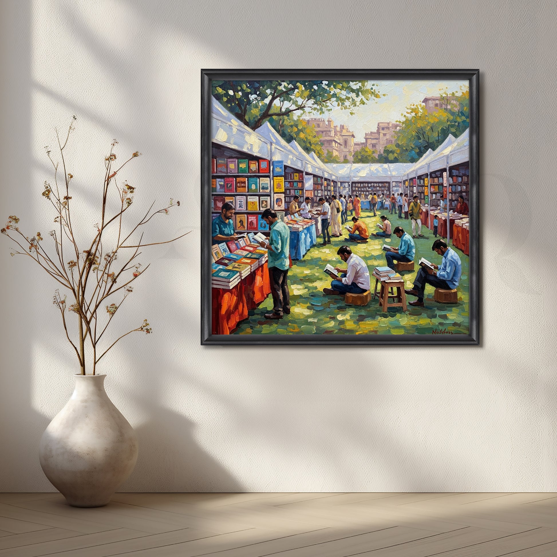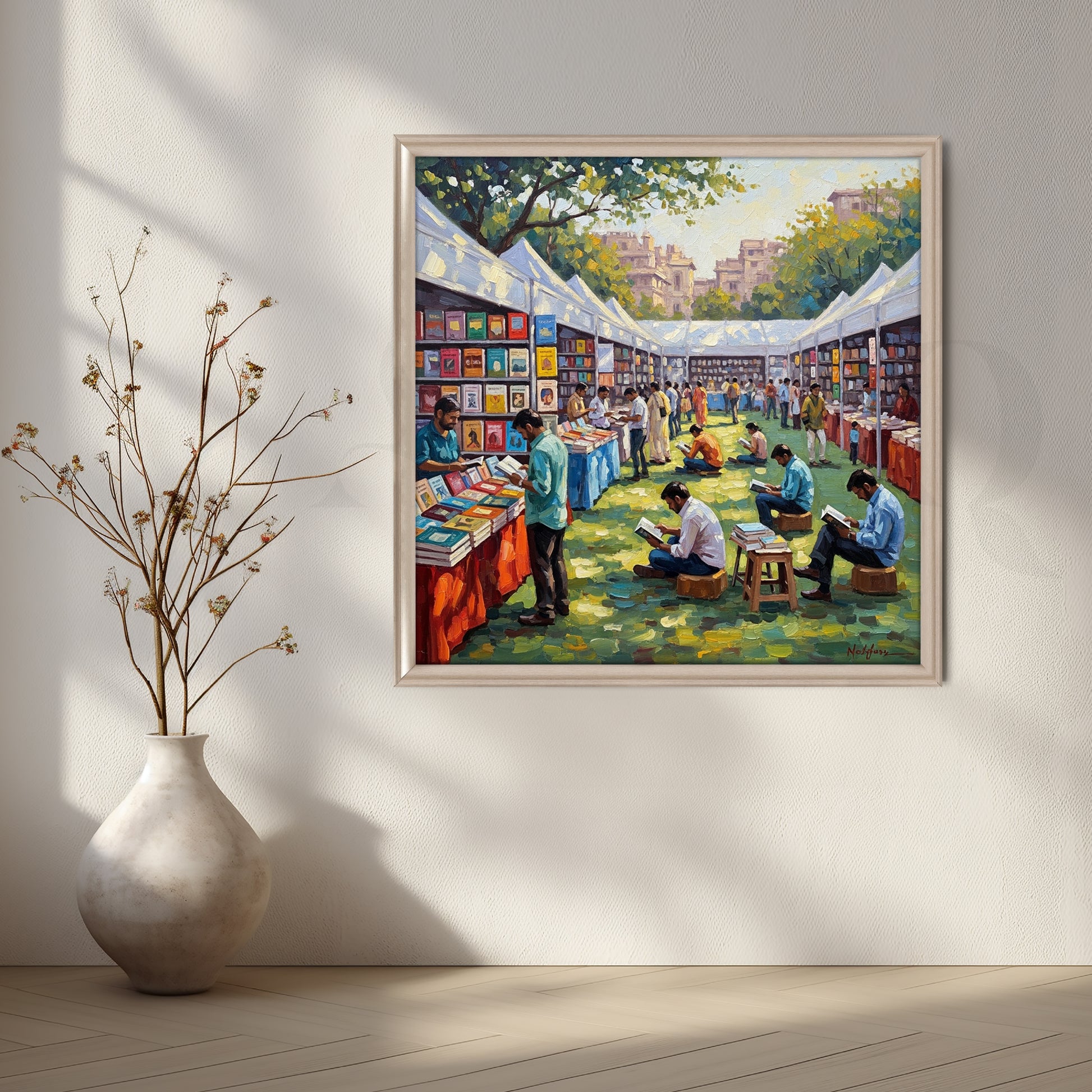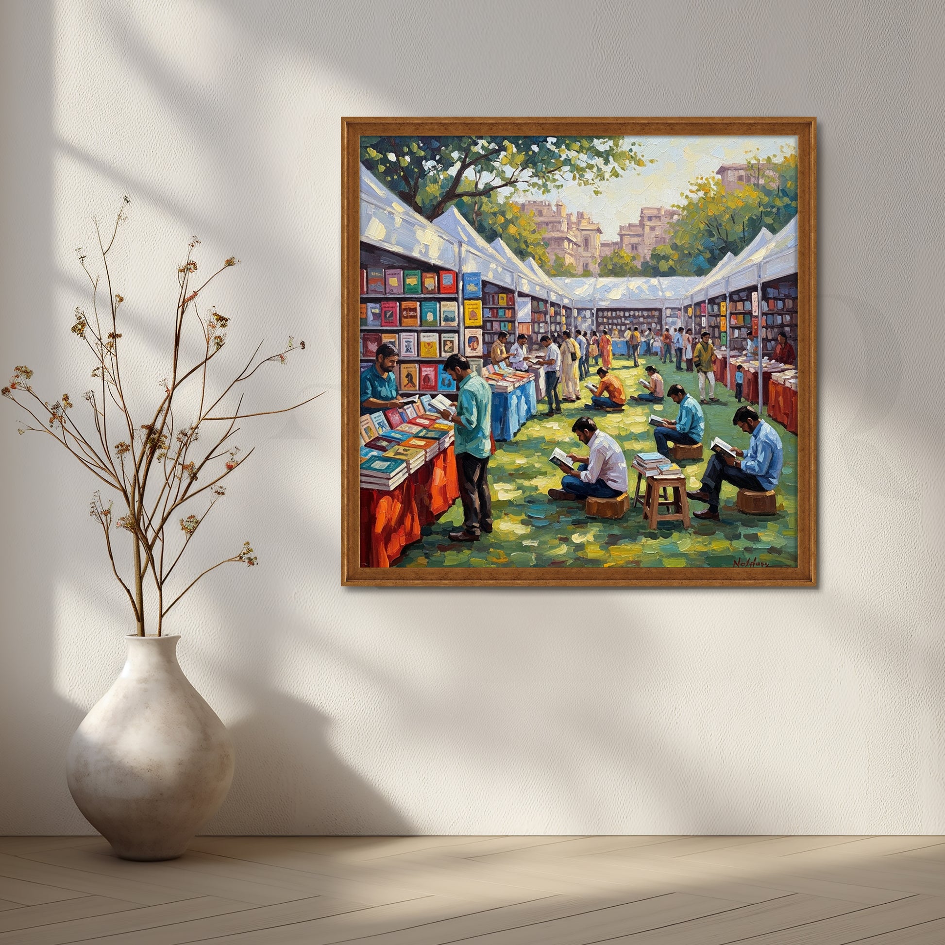 Vibrant Indian Book Fair Canvas Artwork – Reading Culture Wall Art for Living Room