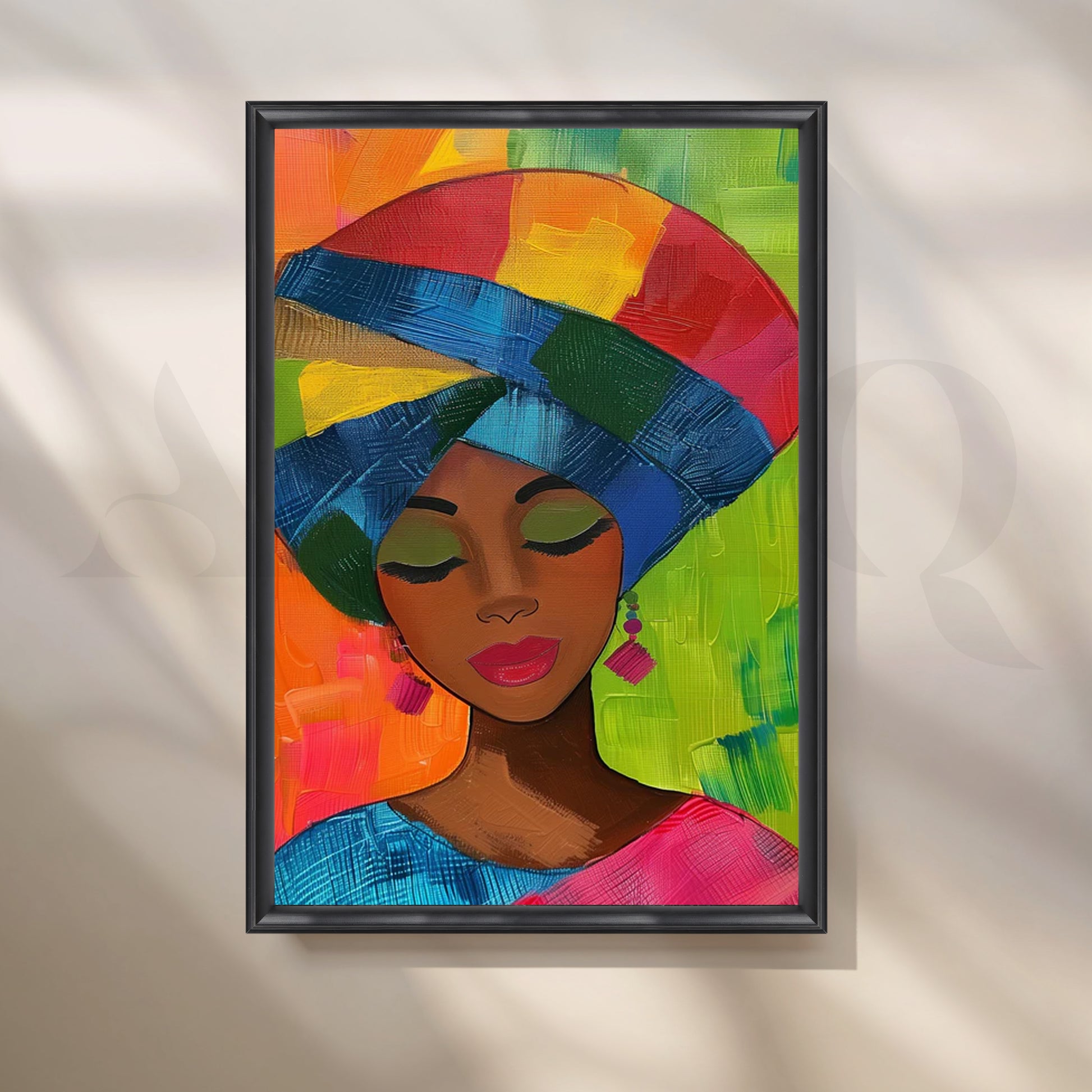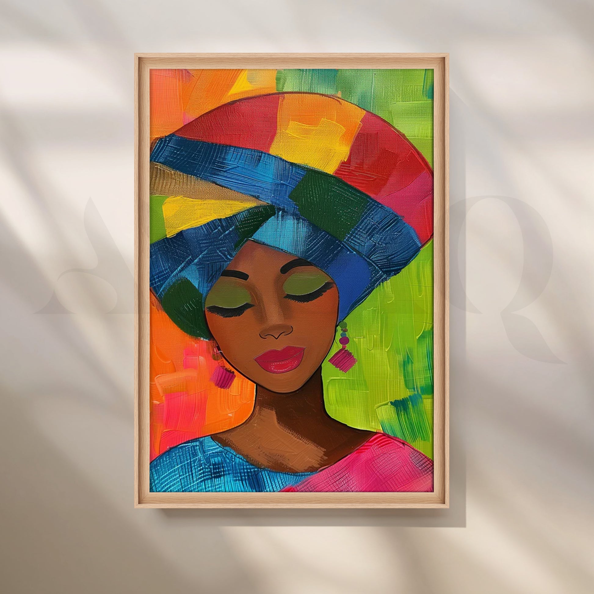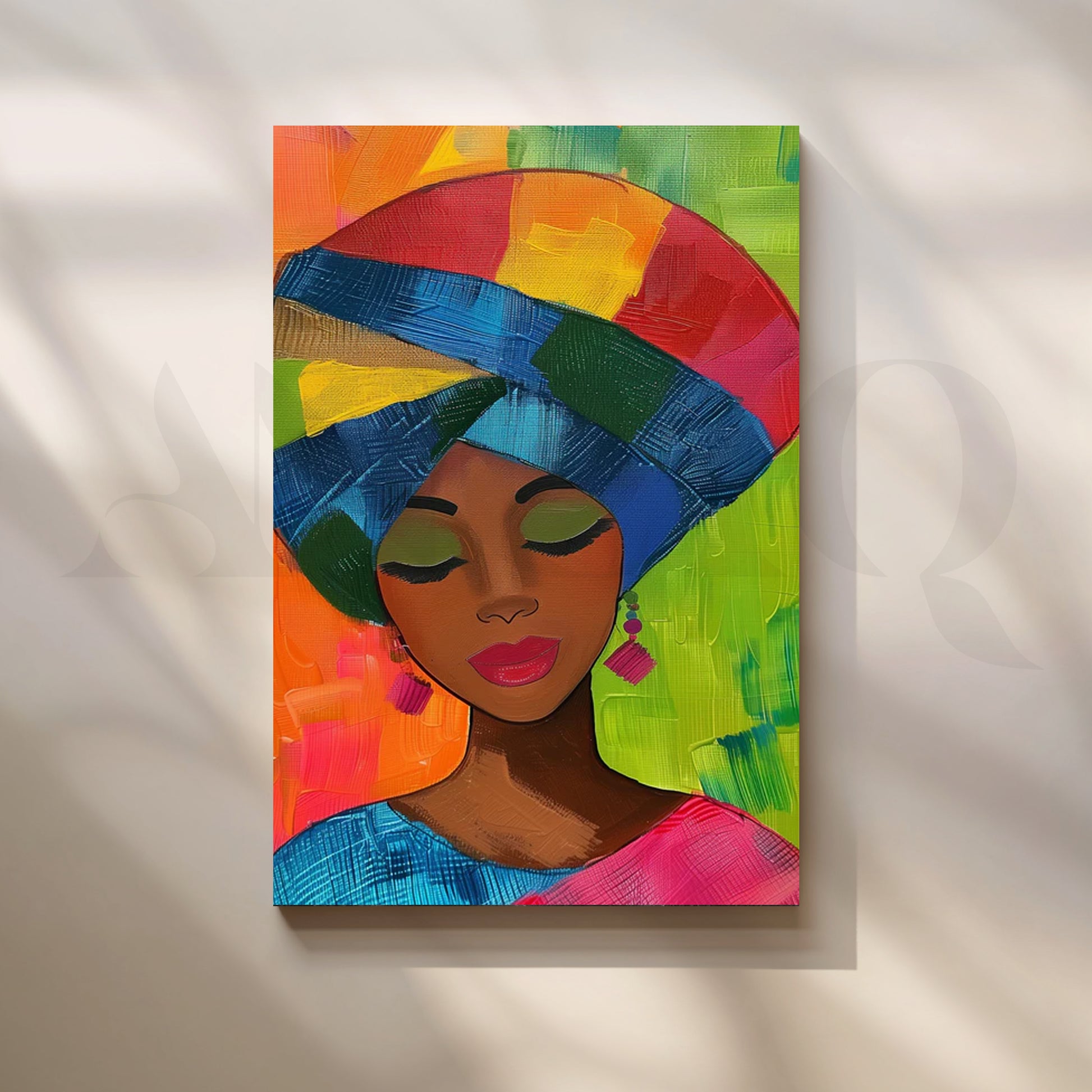Playful pop-art portrait with a colorful headwrap and soft closed-eye expression, layered in bright greens, oranges, and pinks. This cheerful abstract portrait canvas lights up a bedroom, beauty room, or dressing area with feel-good color. Great for modern wall art lovers seeking bold, boho bedroom décor or a vibrant gallery wall accent.