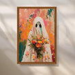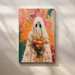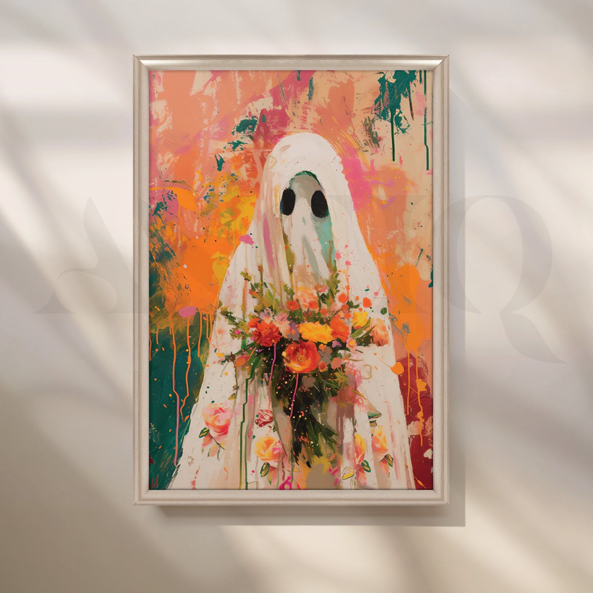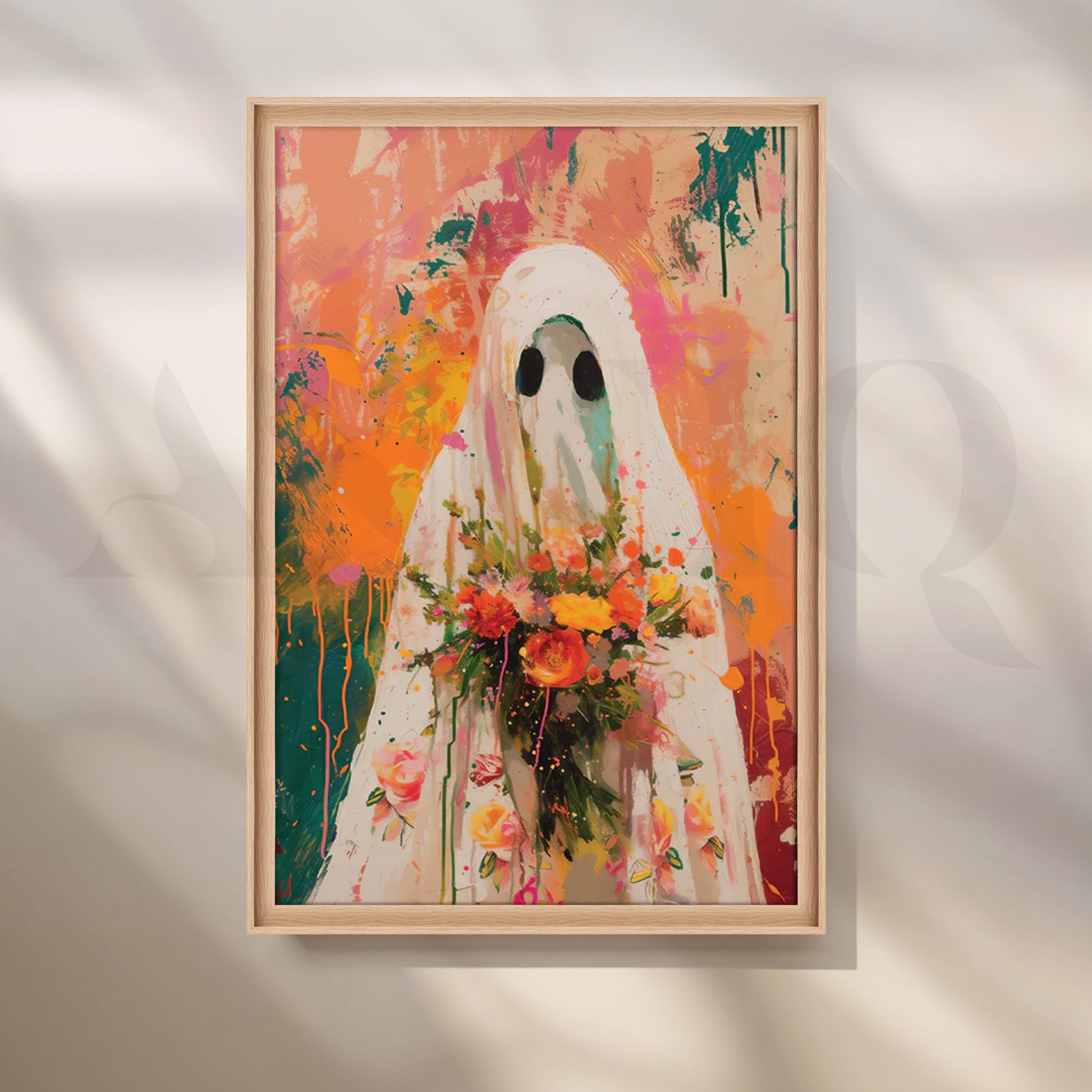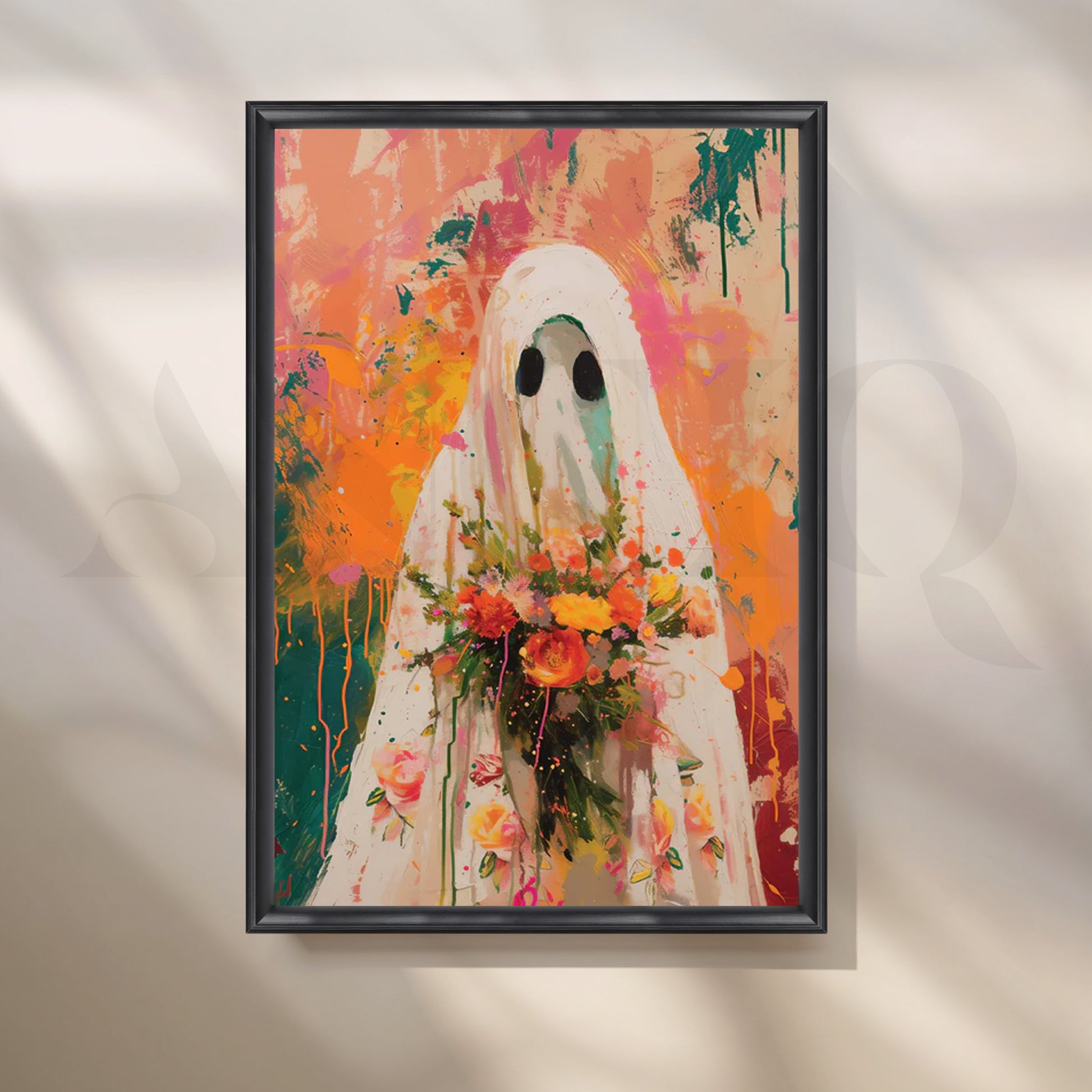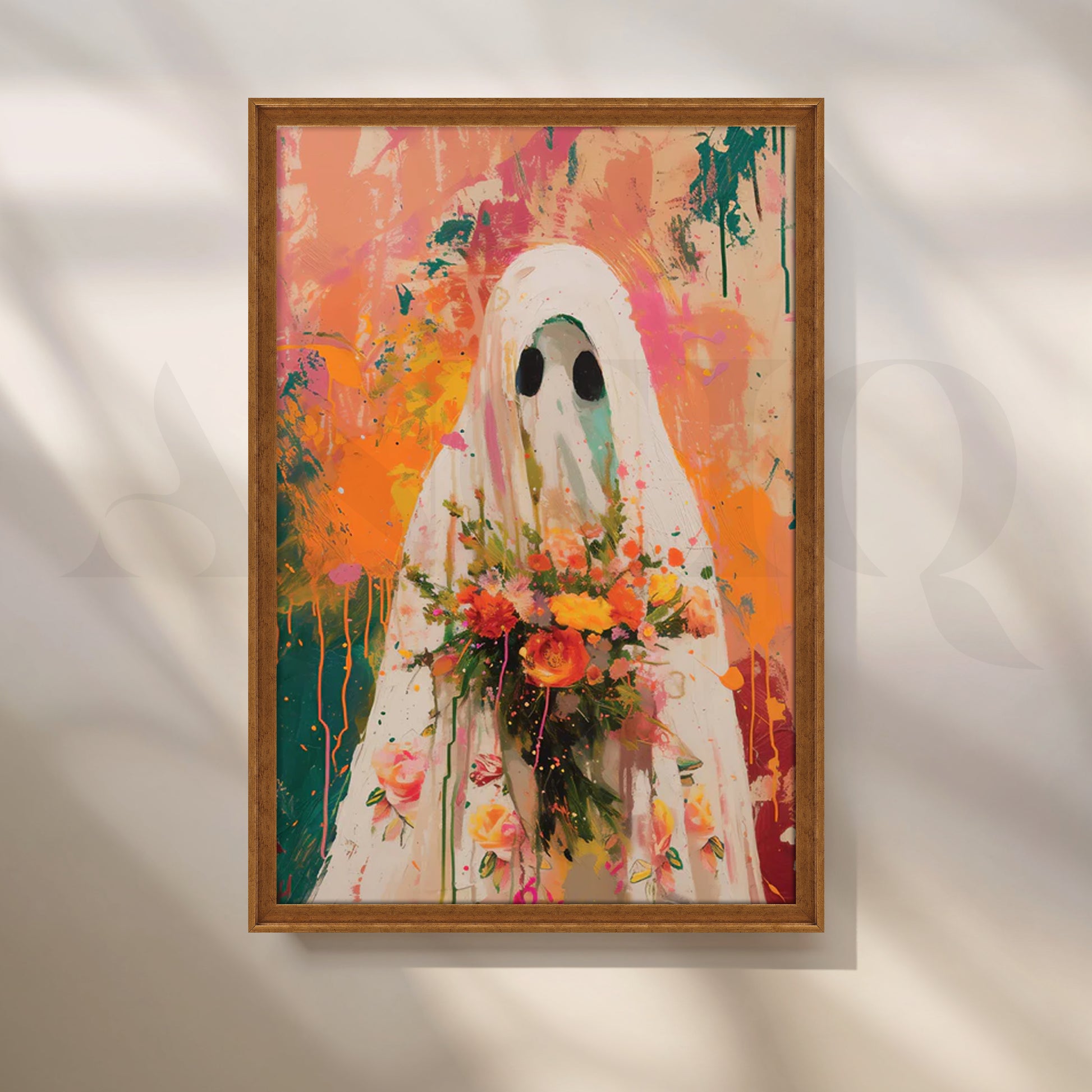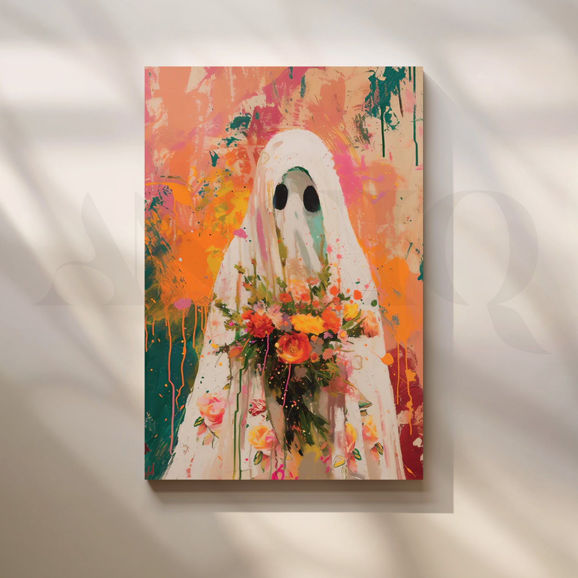 A whimsigoth take on romance and mystery, this “Floral Phantom” shows a sheet-ghost bride cradling a lush bouquet against an abstract splash of tangerine, blush pink, and teal. The expressive paint drips and floral details create colorful modern wall art that feels both playful and haunting—perfect for an eclectic living room, cozy bedroom, entryway, or Halloween-to-fall display. Ideal search terms woven in: abstract canvas painting, gothic wall art, boho décor, colorful wall art, modern canvas print, large living room art, spooky chic home décor, ghost art.