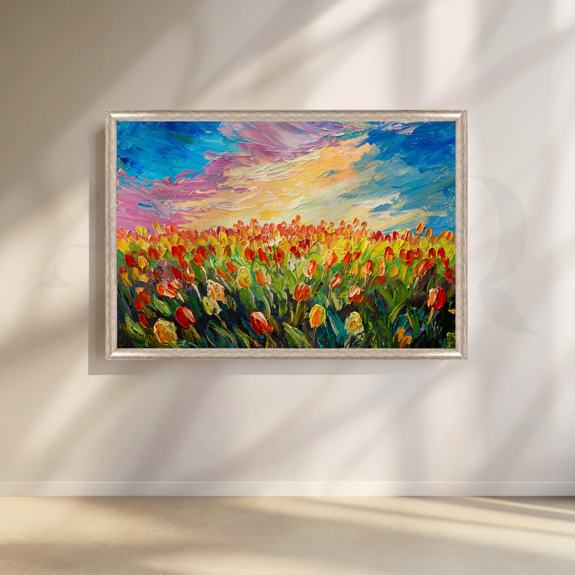 Add a burst of color to your space with this vibrant tulip field canvas painting. Featuring a stunning array of tulips under a vivid sky, this artwork brings life and energy to any room. Perfect for home or office decor.