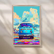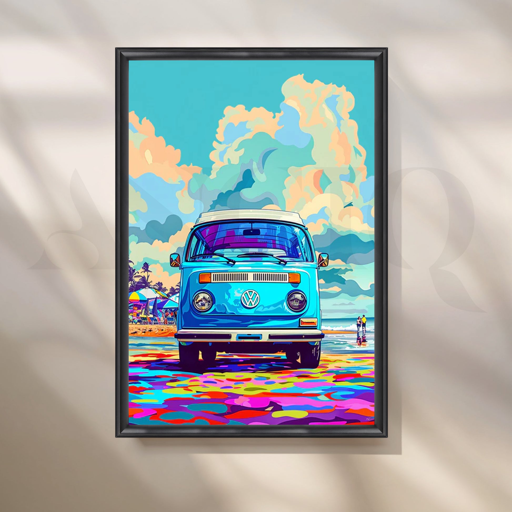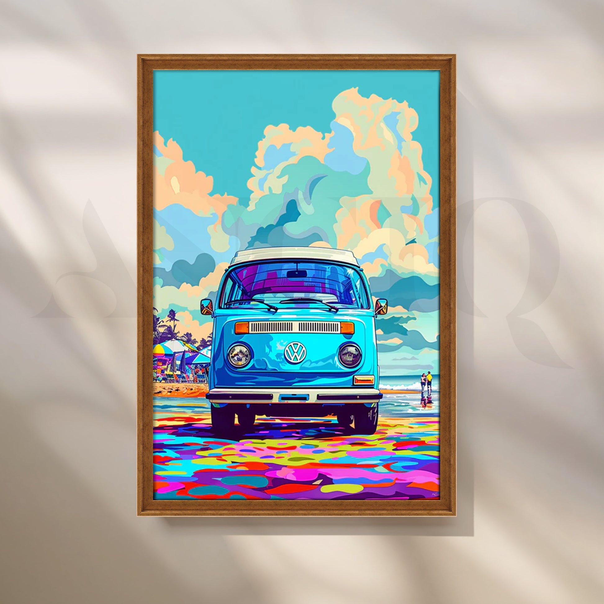 Vibrant pop-art beach scene with a retro blue camper van parked on colorful sand beneath cotton-candy clouds. This playful coastal artwork brings road-trip energy and summer mood to modern interiors. Keywords: VW van wall art, camper van canvas, beach wall art, retro pop art painting, colorful coastal décor, boho living room artwork, surf style print, road trip wall décor.