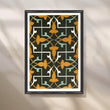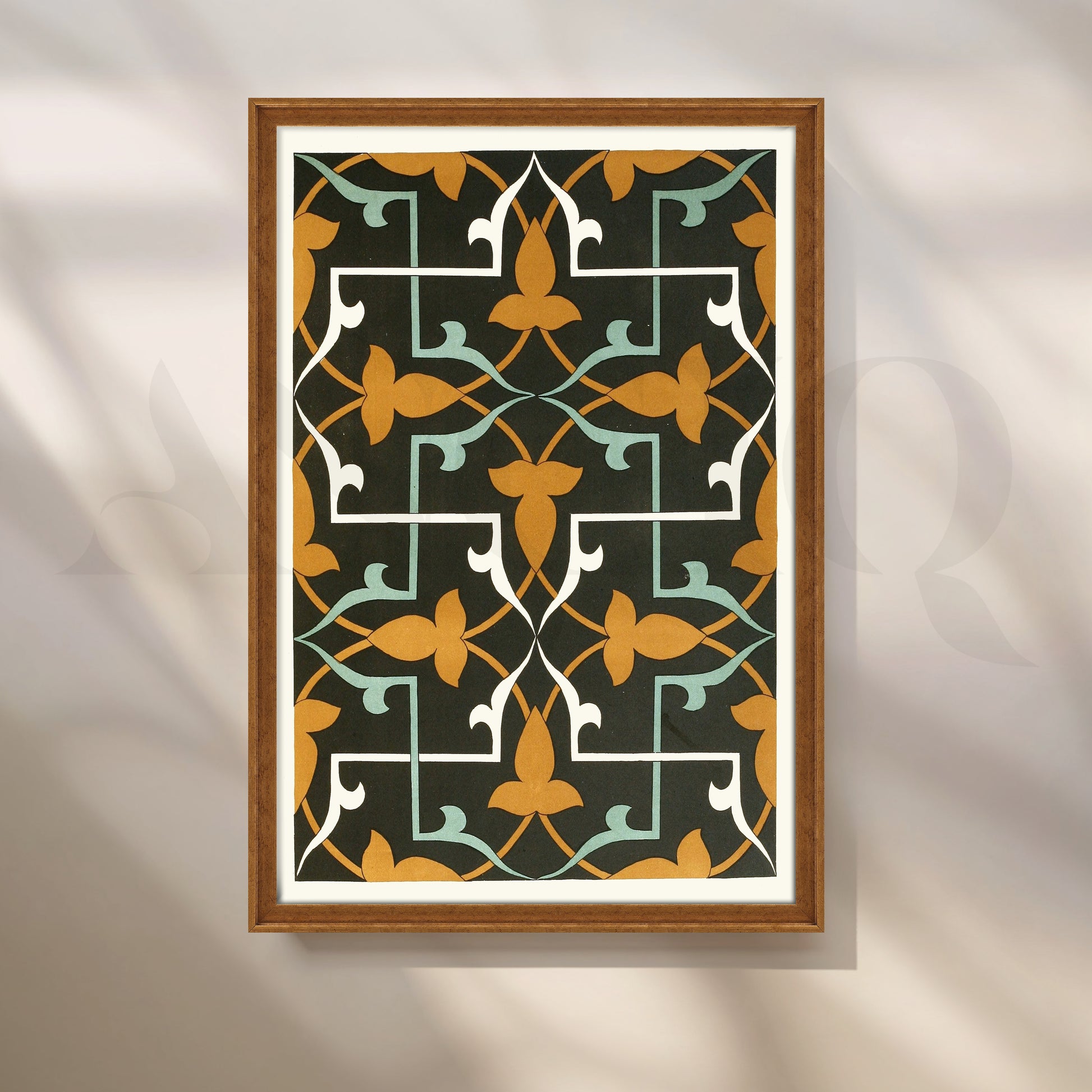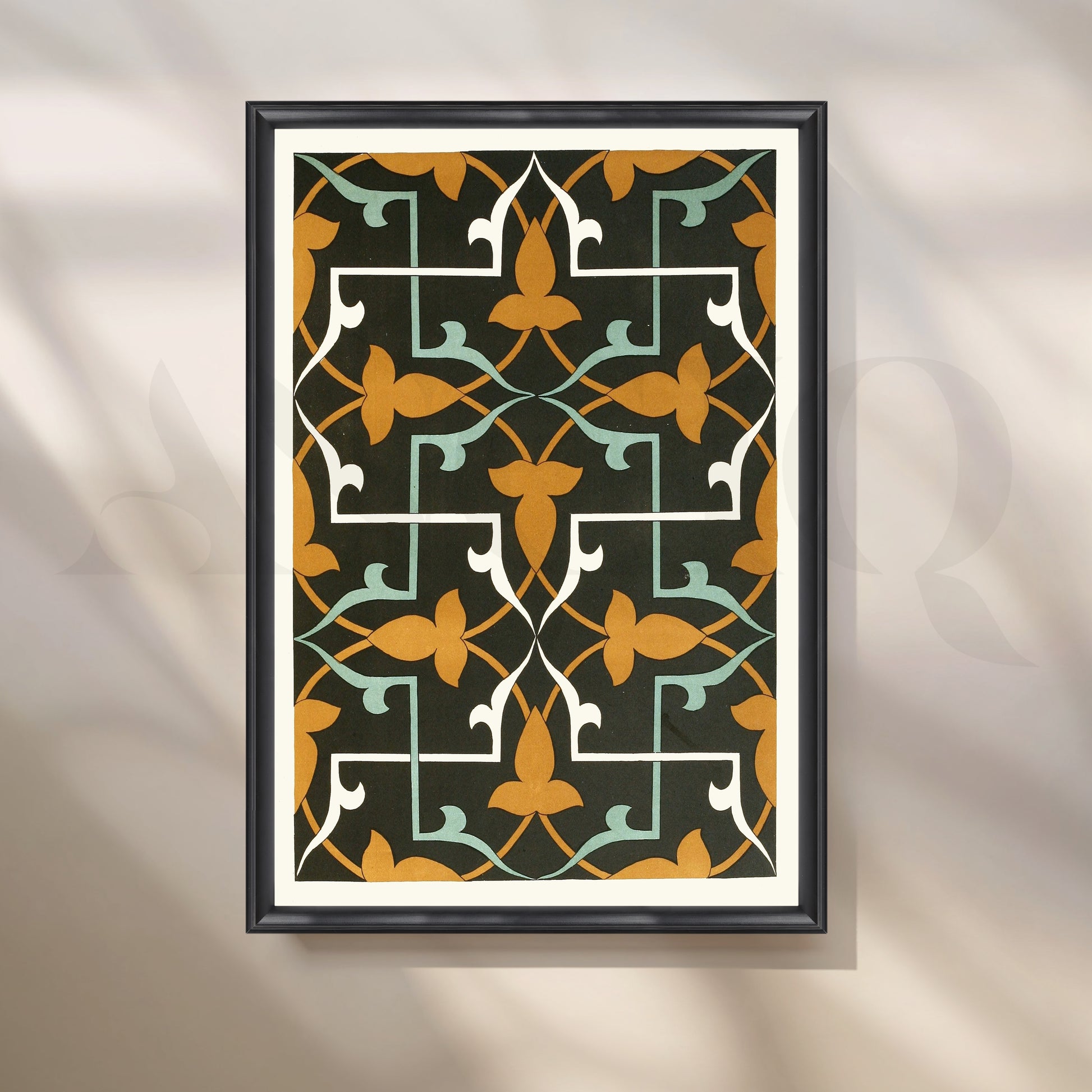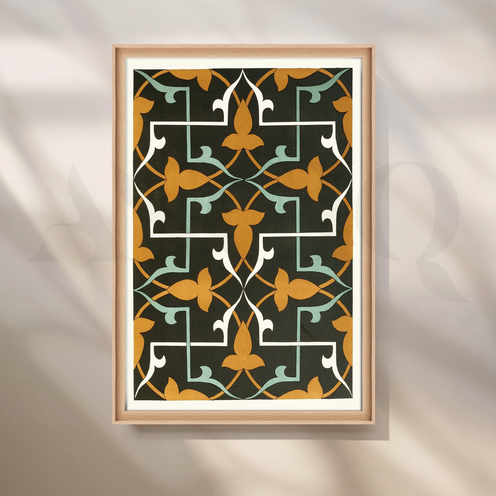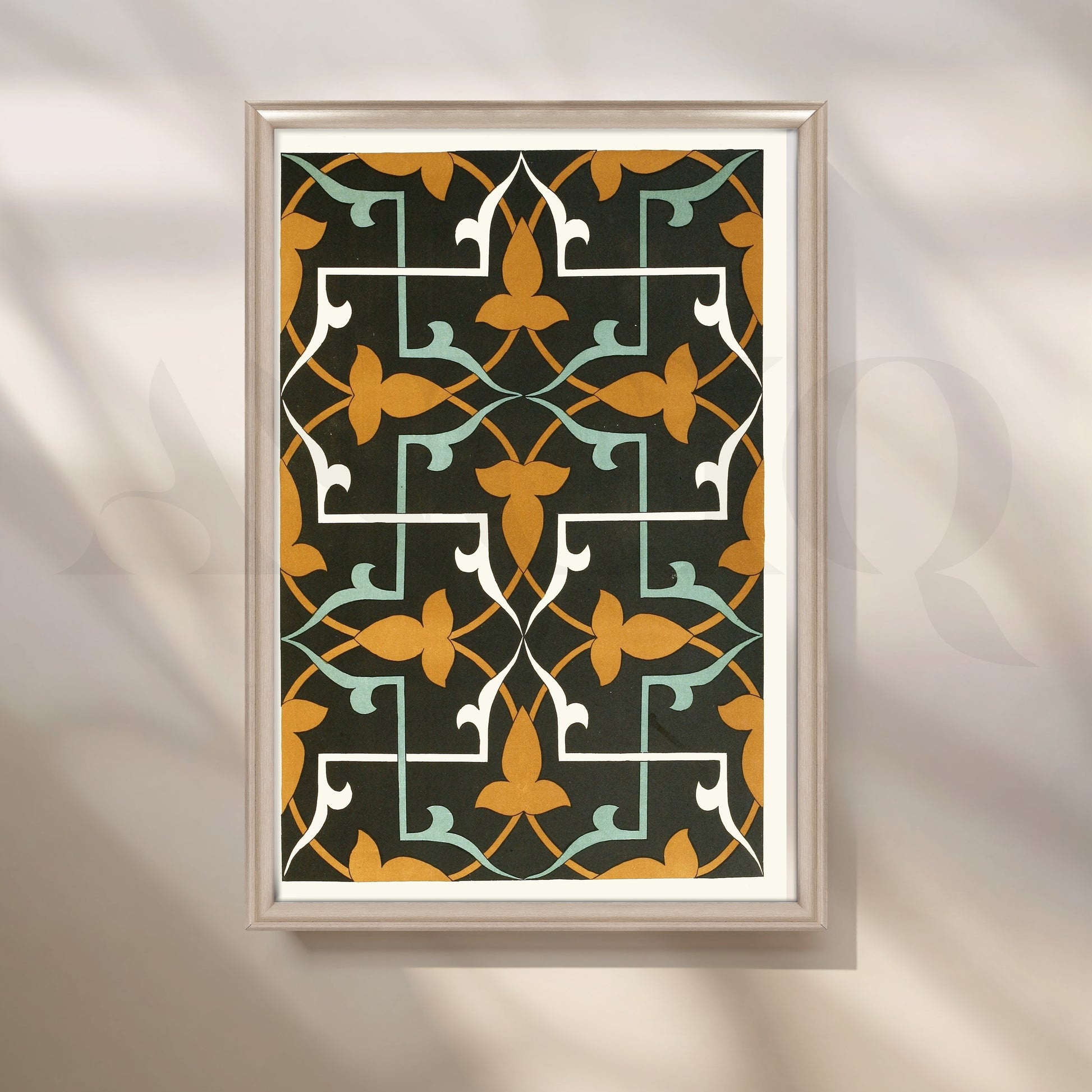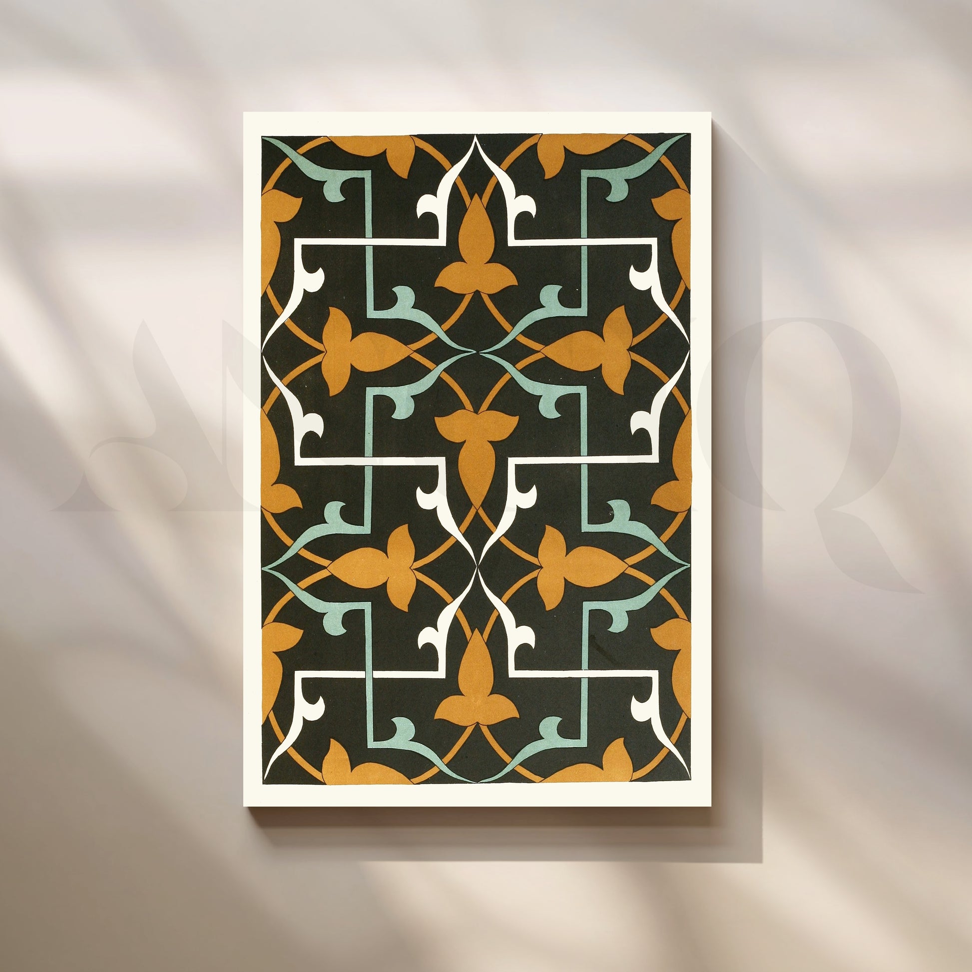This ornamental canvas artwork features a repeating tile-inspired pattern in mustard, teal and white on a deep black ground, framed with a crisp ivory border. Perfect for eclectic living rooms, dining spaces or entryways, it suits searches for Moroccan tile wall art, boho canvas prints and vintage pattern decor.