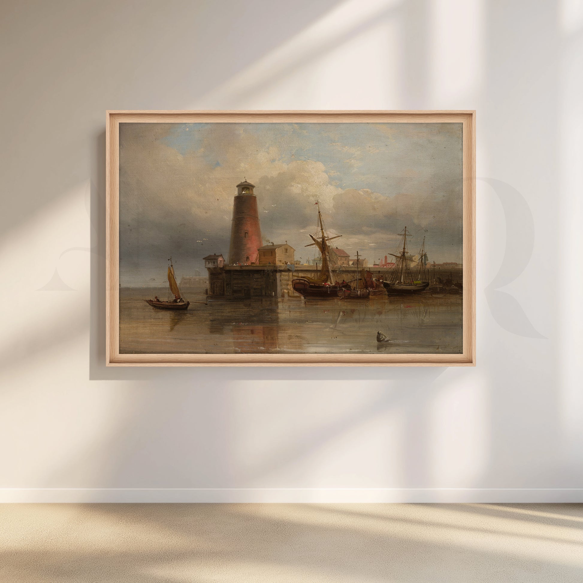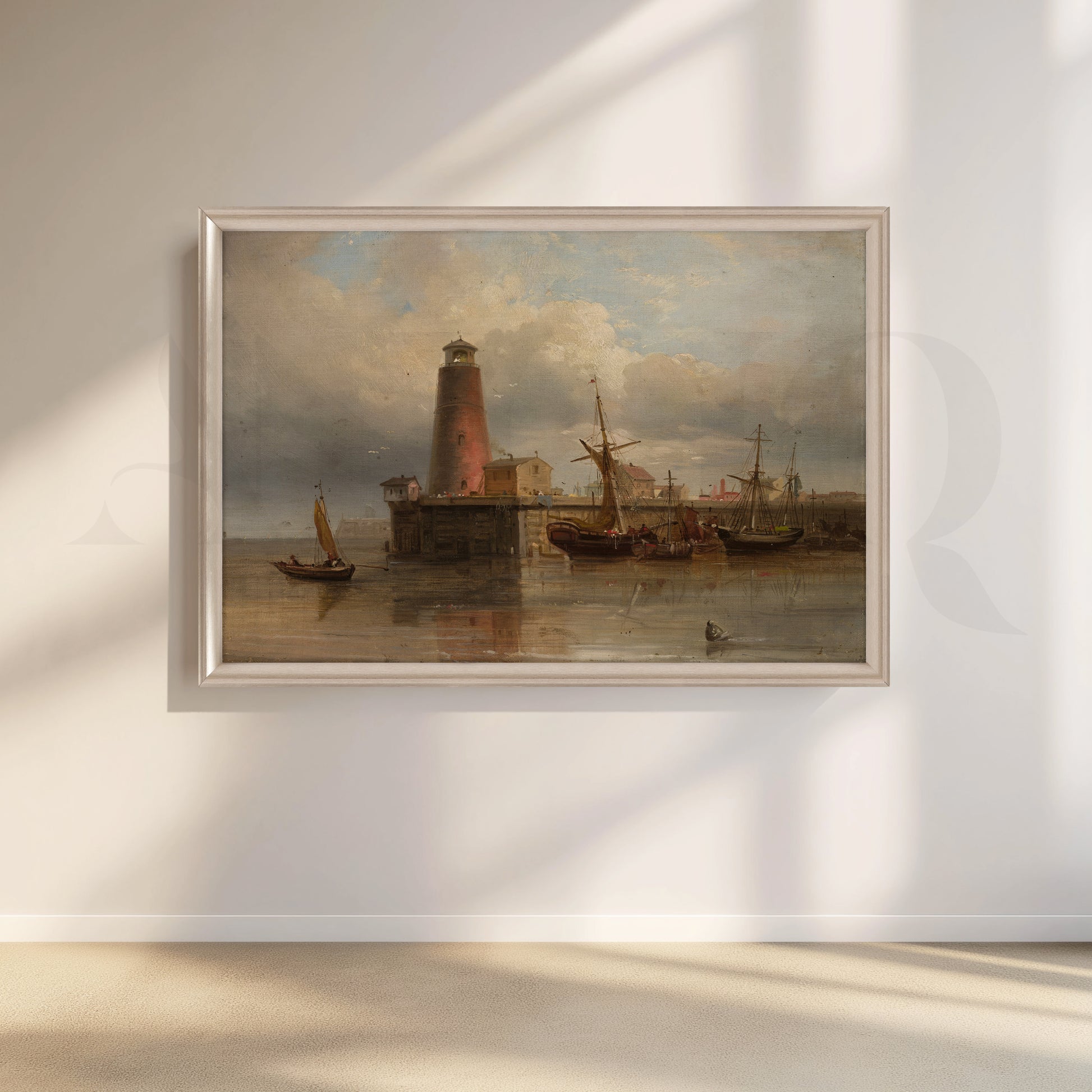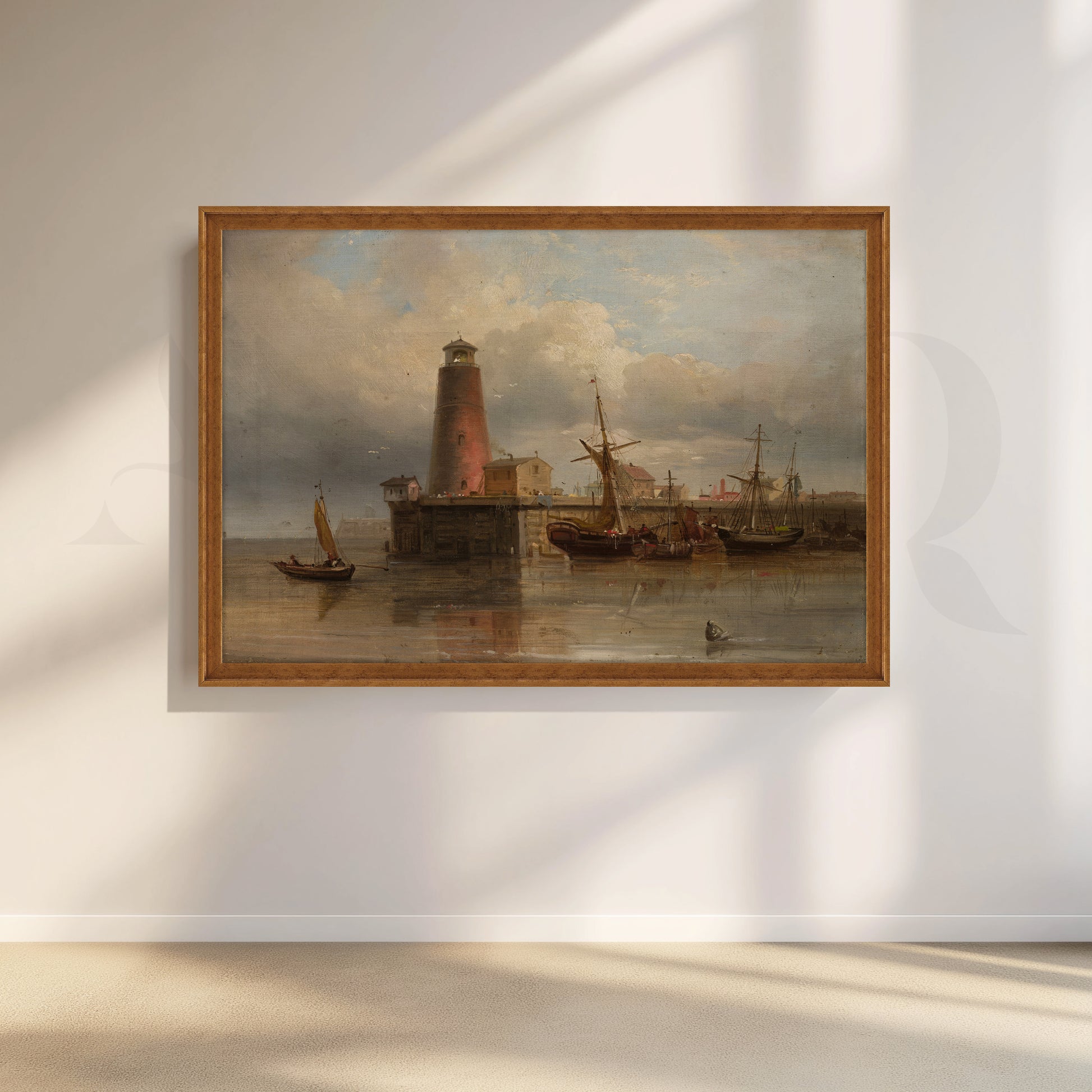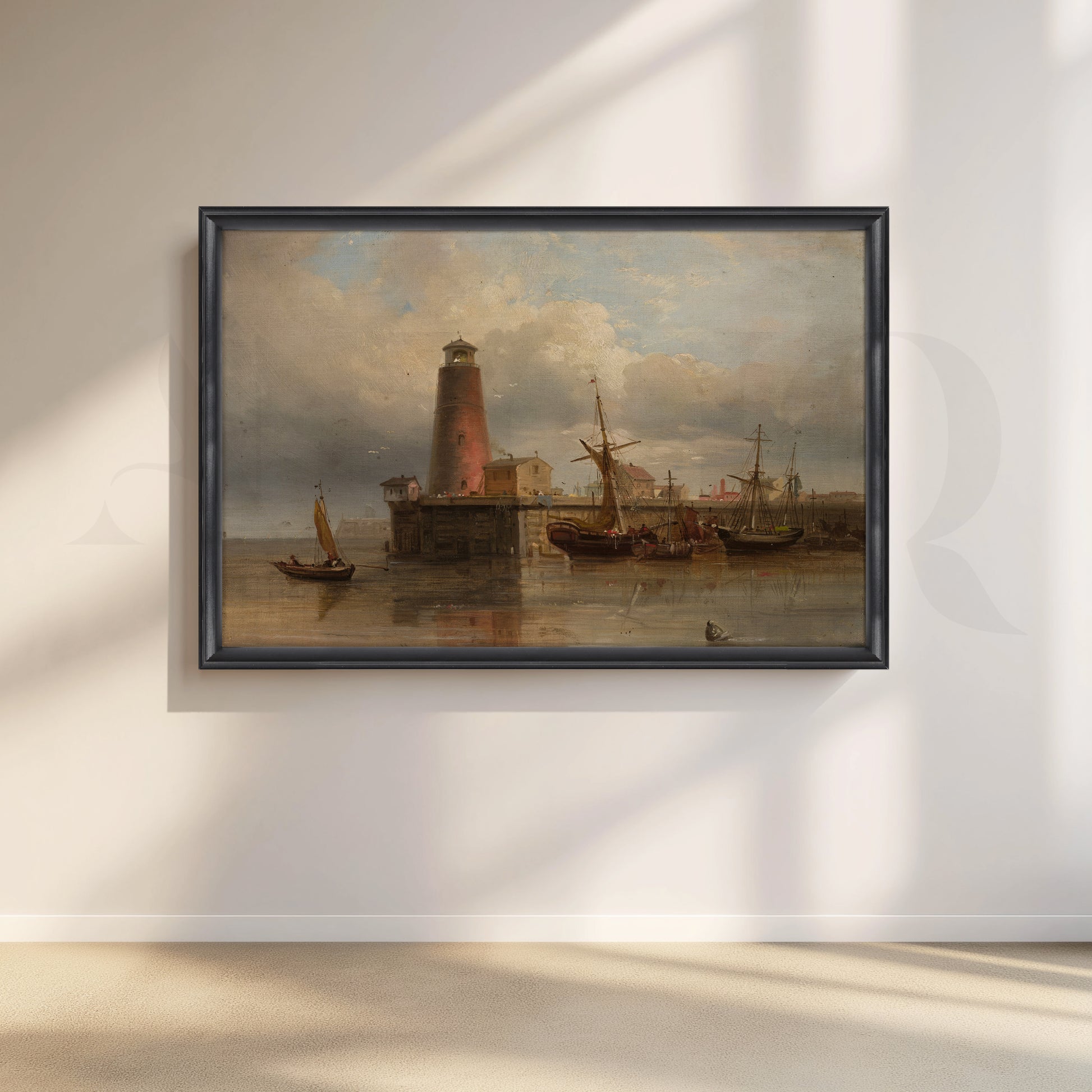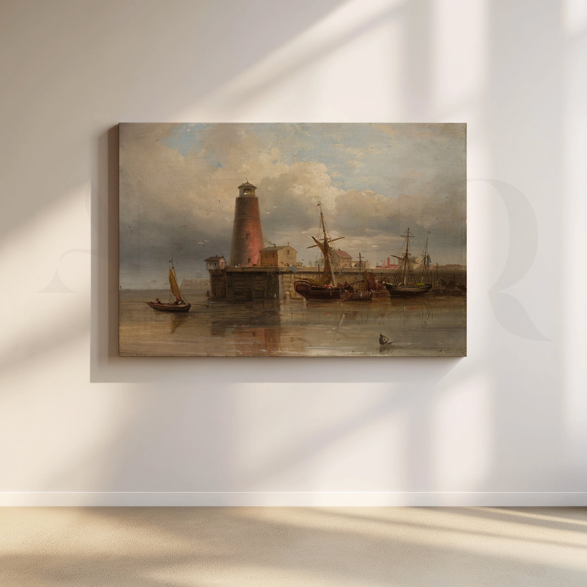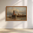 Featuring an old harbor with moored ships and a towering lighthouse reflected in still water, this vintage-style canvas artwork adds timeless character to any space. Warm browns, soft blues, and atmospheric clouds make it ideal as living room wall décor, study wall art, or office canvas art for lovers of classic nautical paintings.