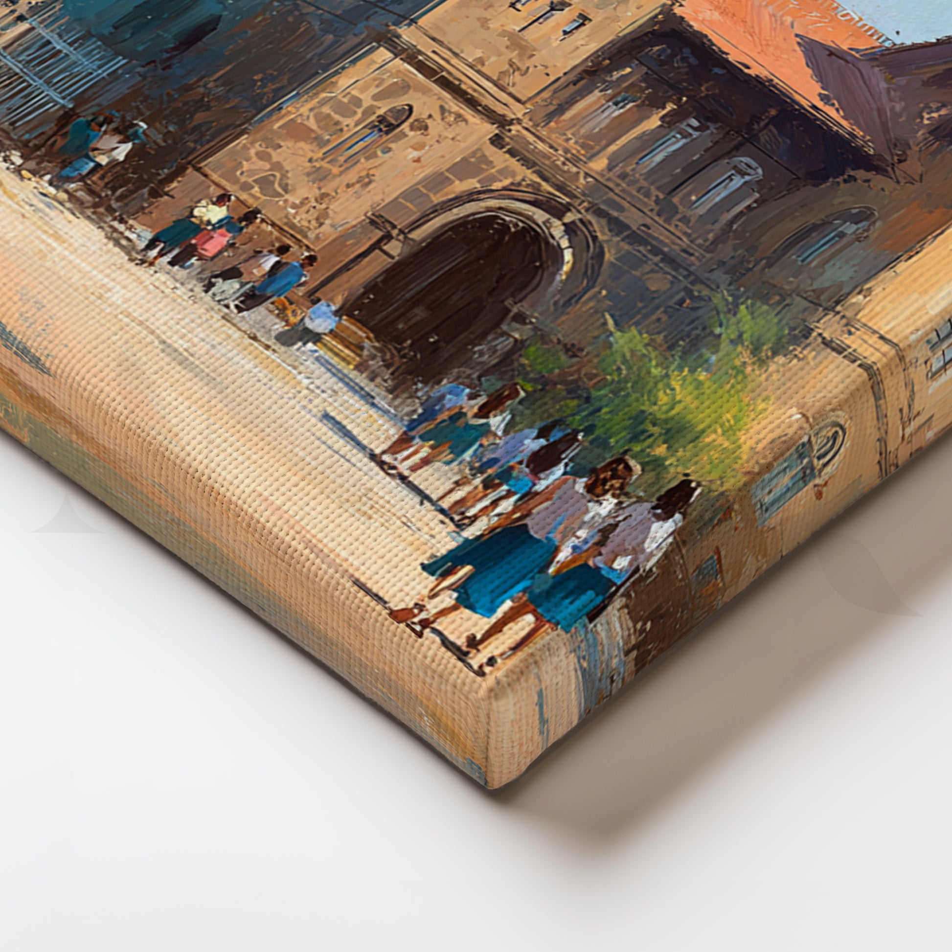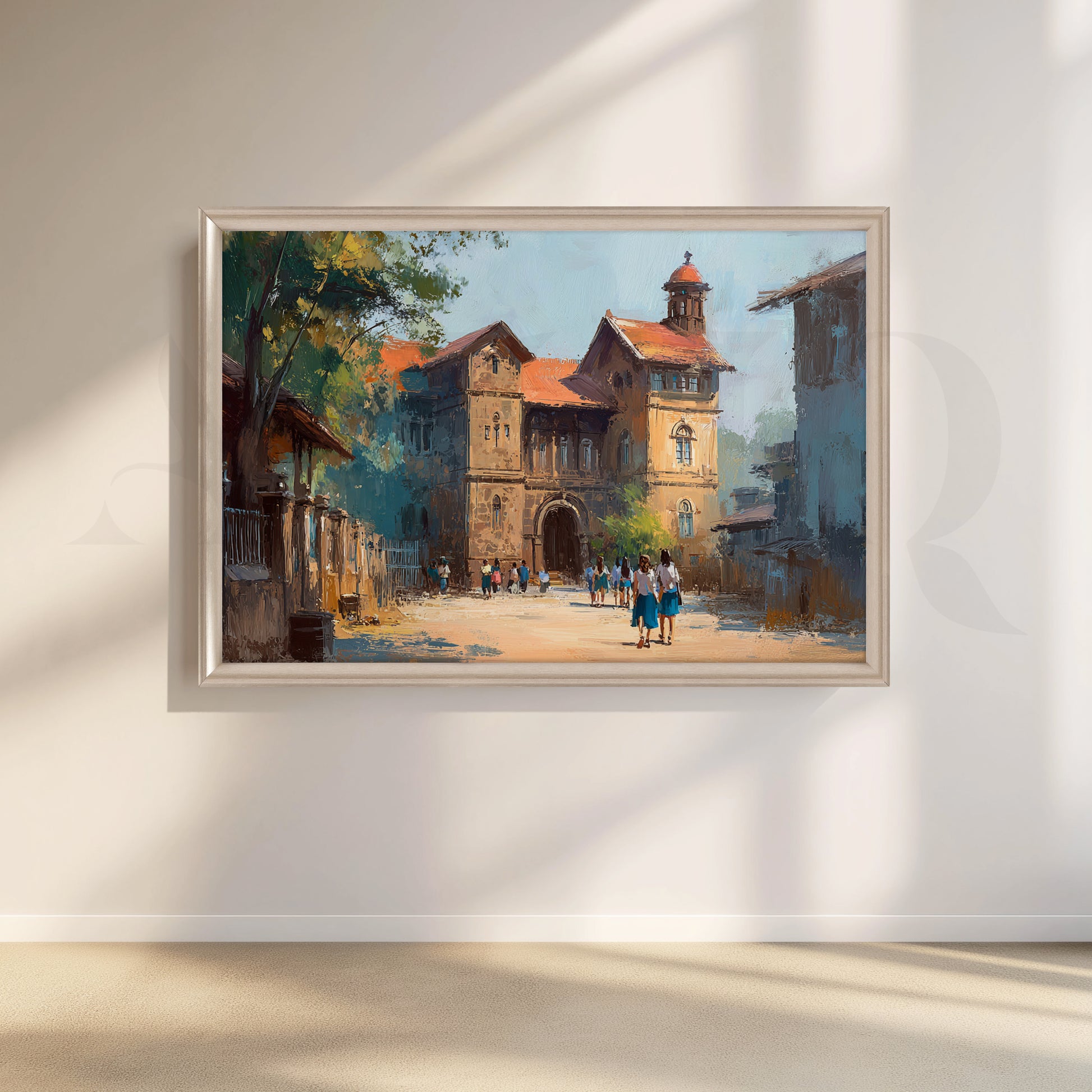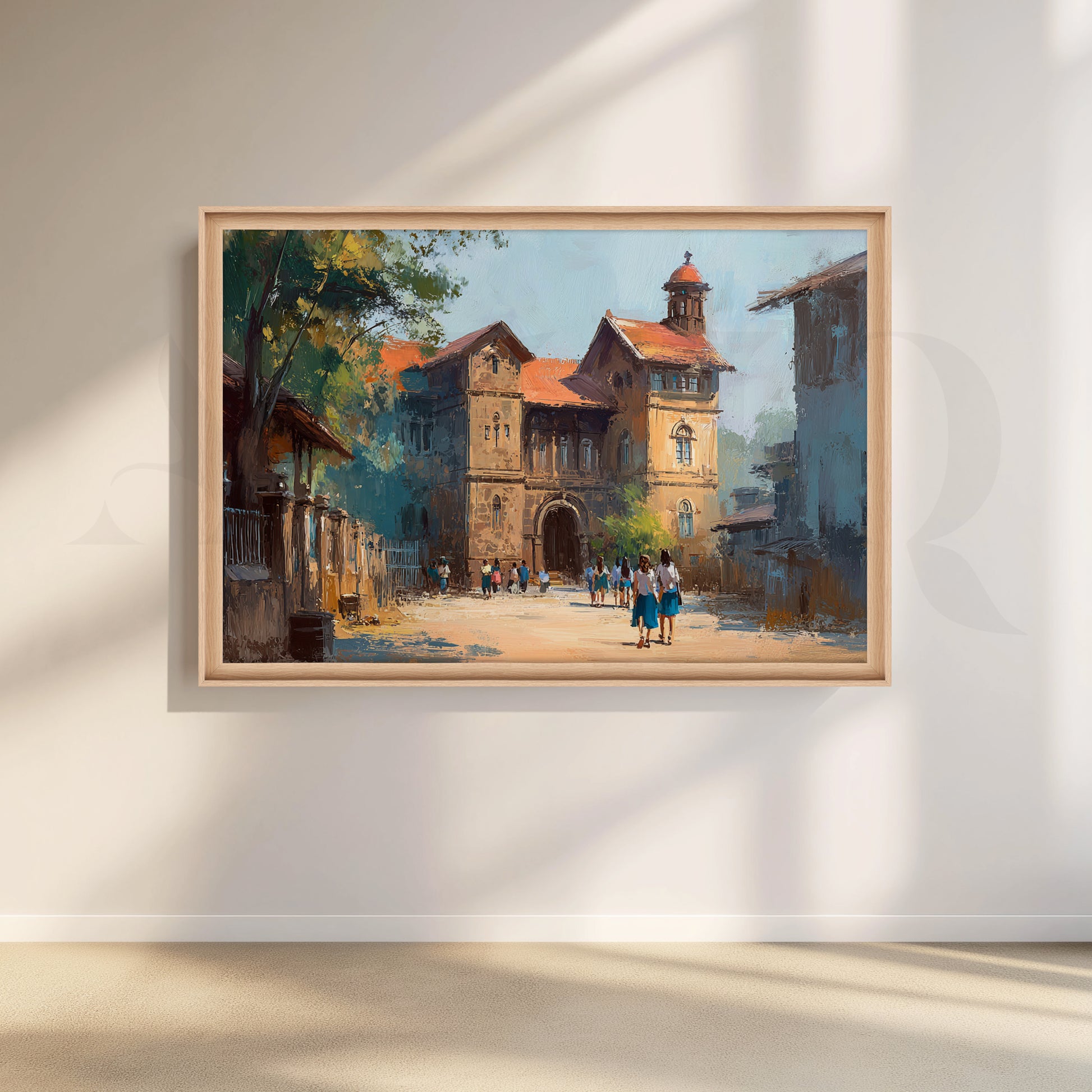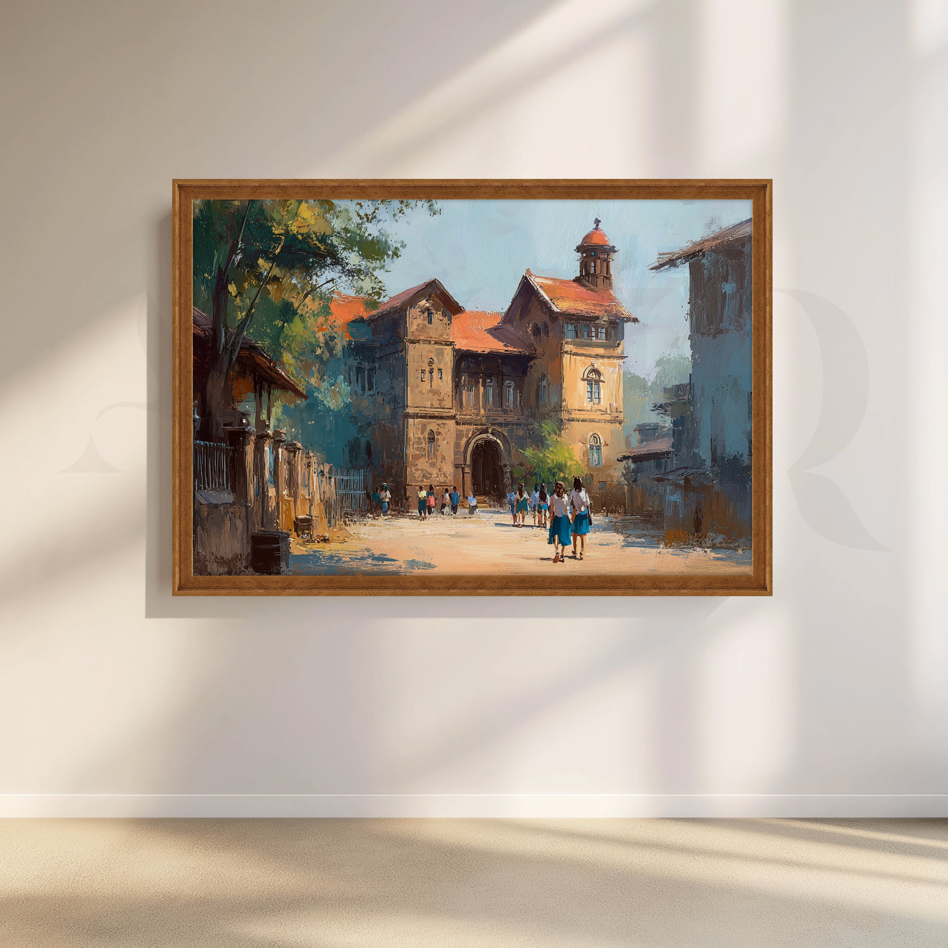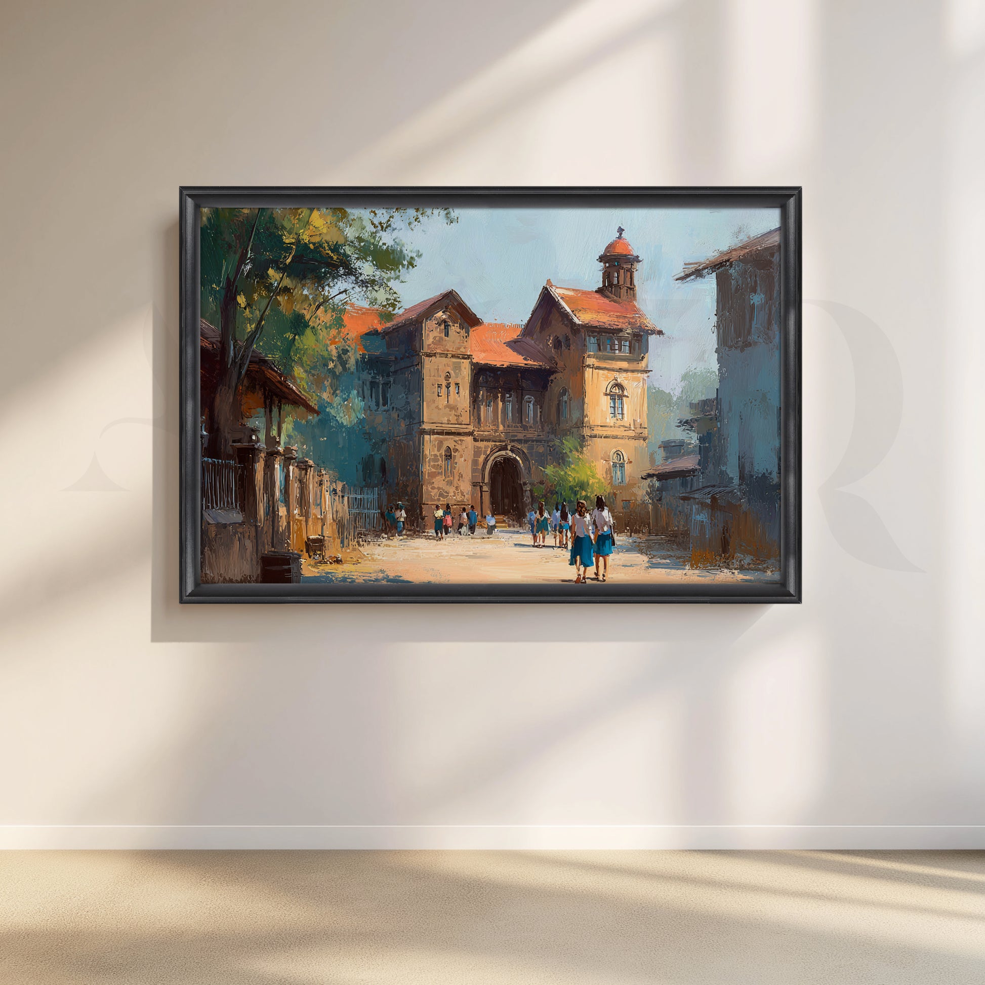 Step into nostalgia with Vintage School Courtyard Canvas Artwork. This captivating piece features a grand heritage building with students walking through sunlit pathways, blending history and warmth. Perfect for educational spaces, libraries, or traditional home interiors.