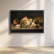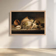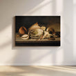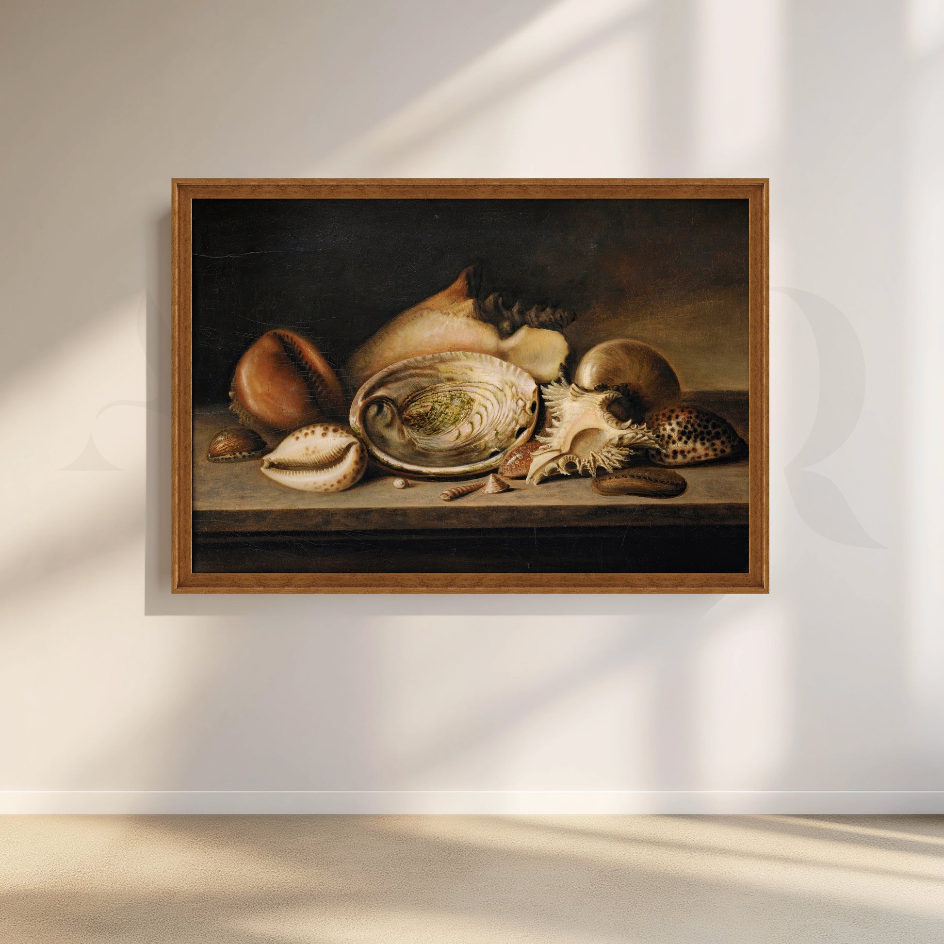 This canvas wall art presents an elegant still life of detailed seashells arranged on a dark tabletop, giving a classic, museum-style feel. Warm browns and creamy neutrals suit sophisticated living rooms, study walls, and coastal-inspired dining spaces. Ideal for those seeking seashell wall art, vintage still life canvas, and nautical home decor.