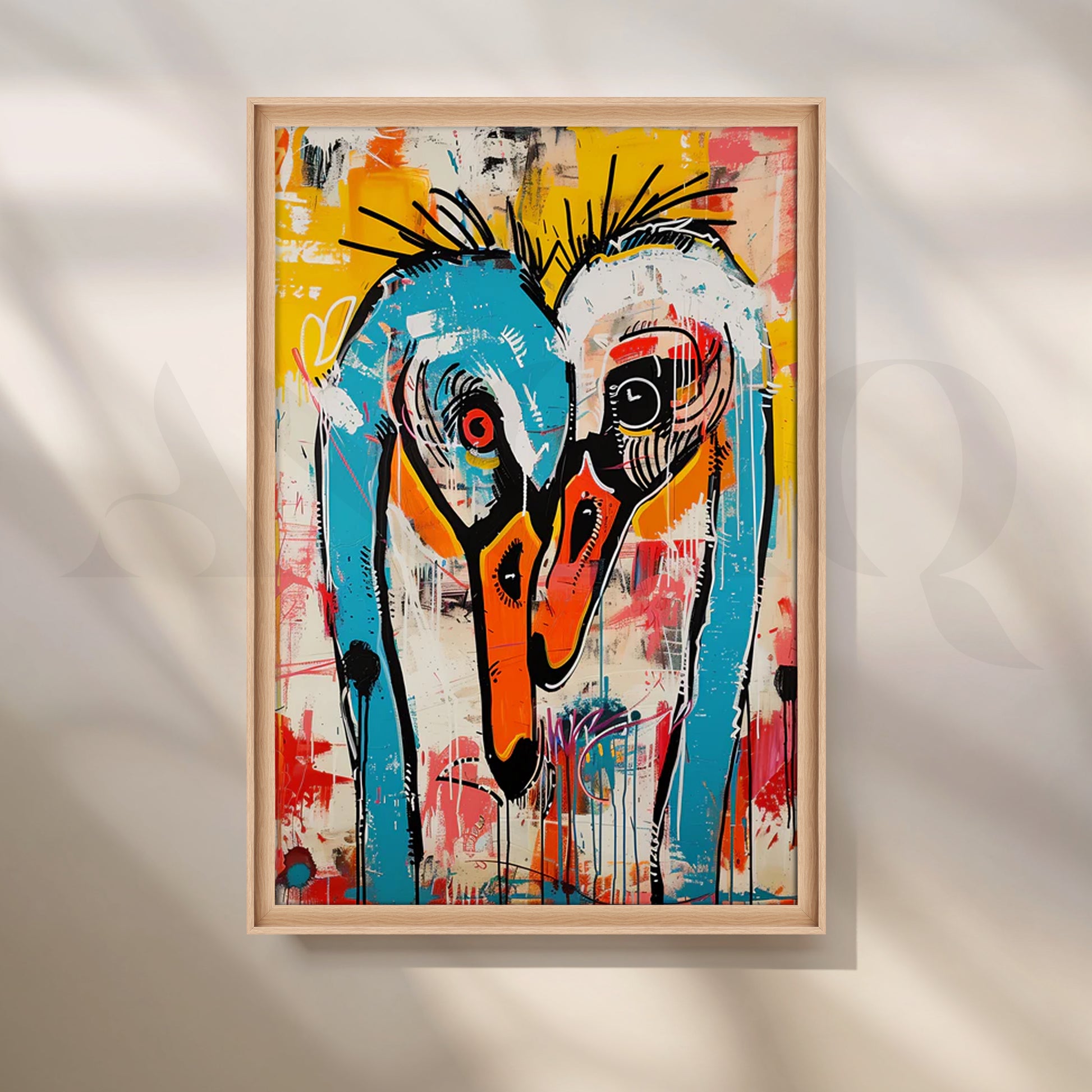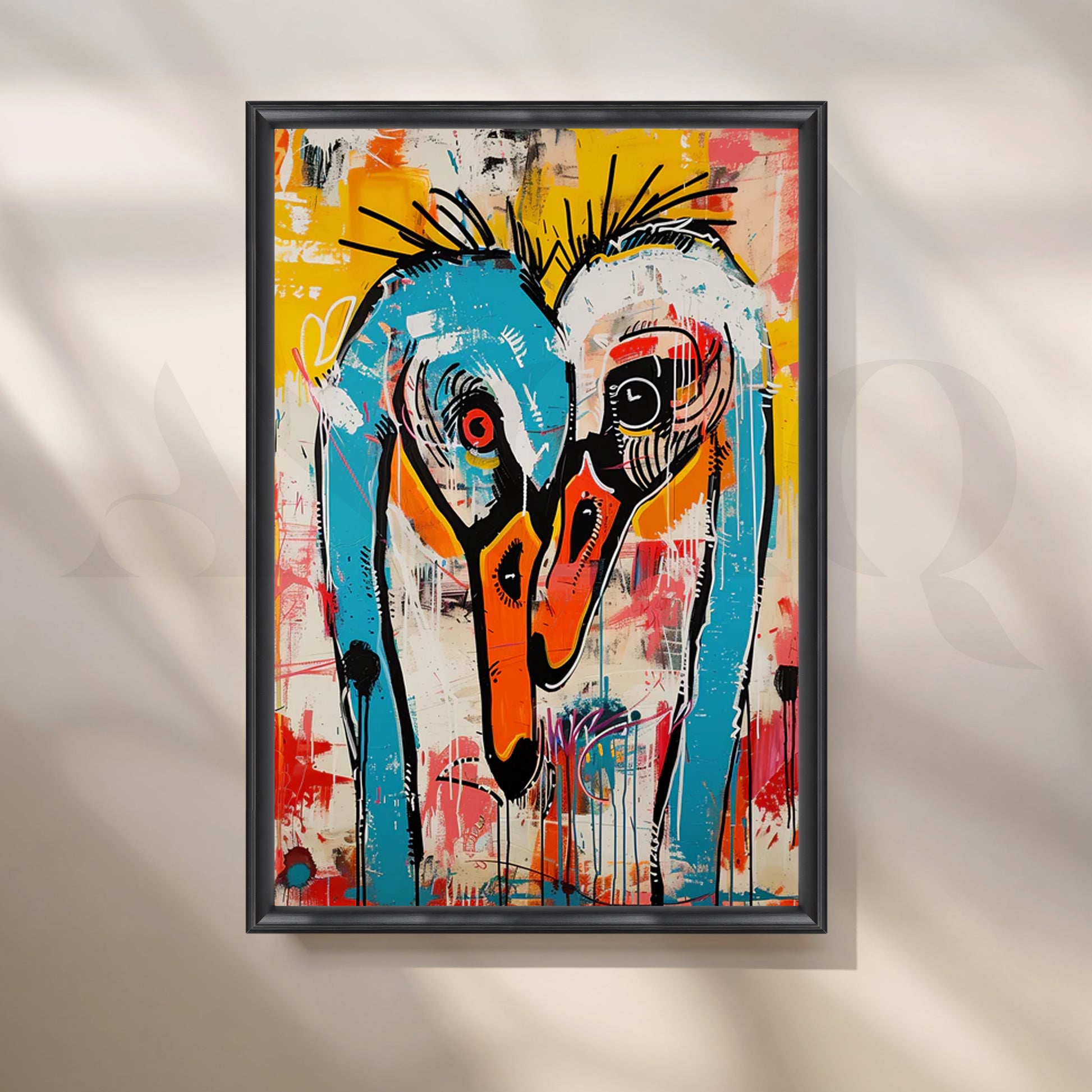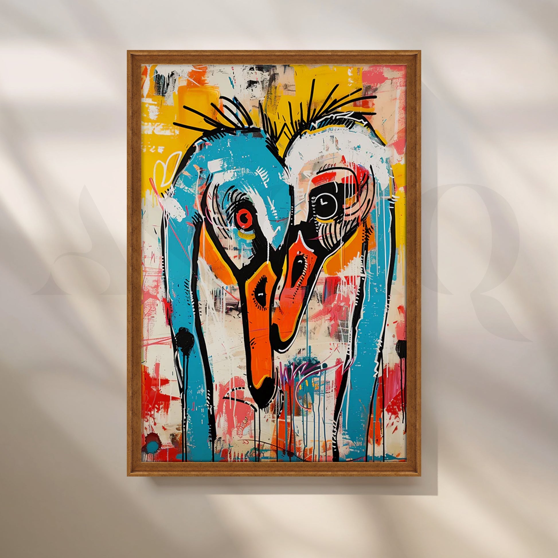 Street-art energy meets fine art: two stylized cranes pop in teal, tangerine, red, and sunshine yellow with expressive drips and graphic lines. A striking abstract canvas painting for studios, dining rooms, or lofts—bold modern wall art that energizes creative spaces and anchors contemporary décor.