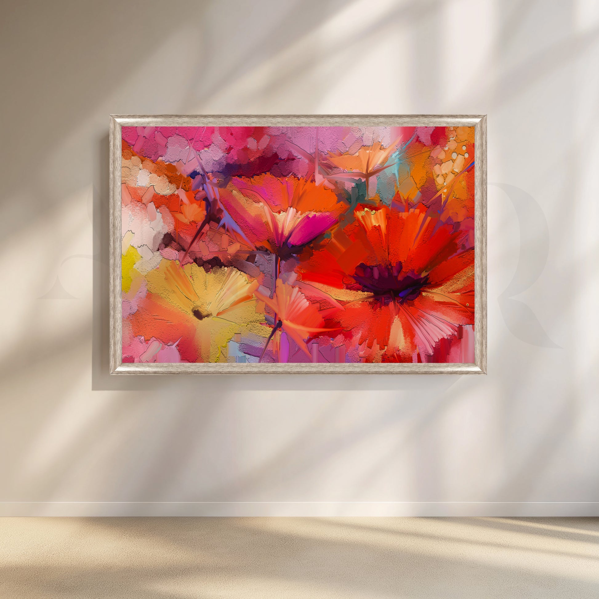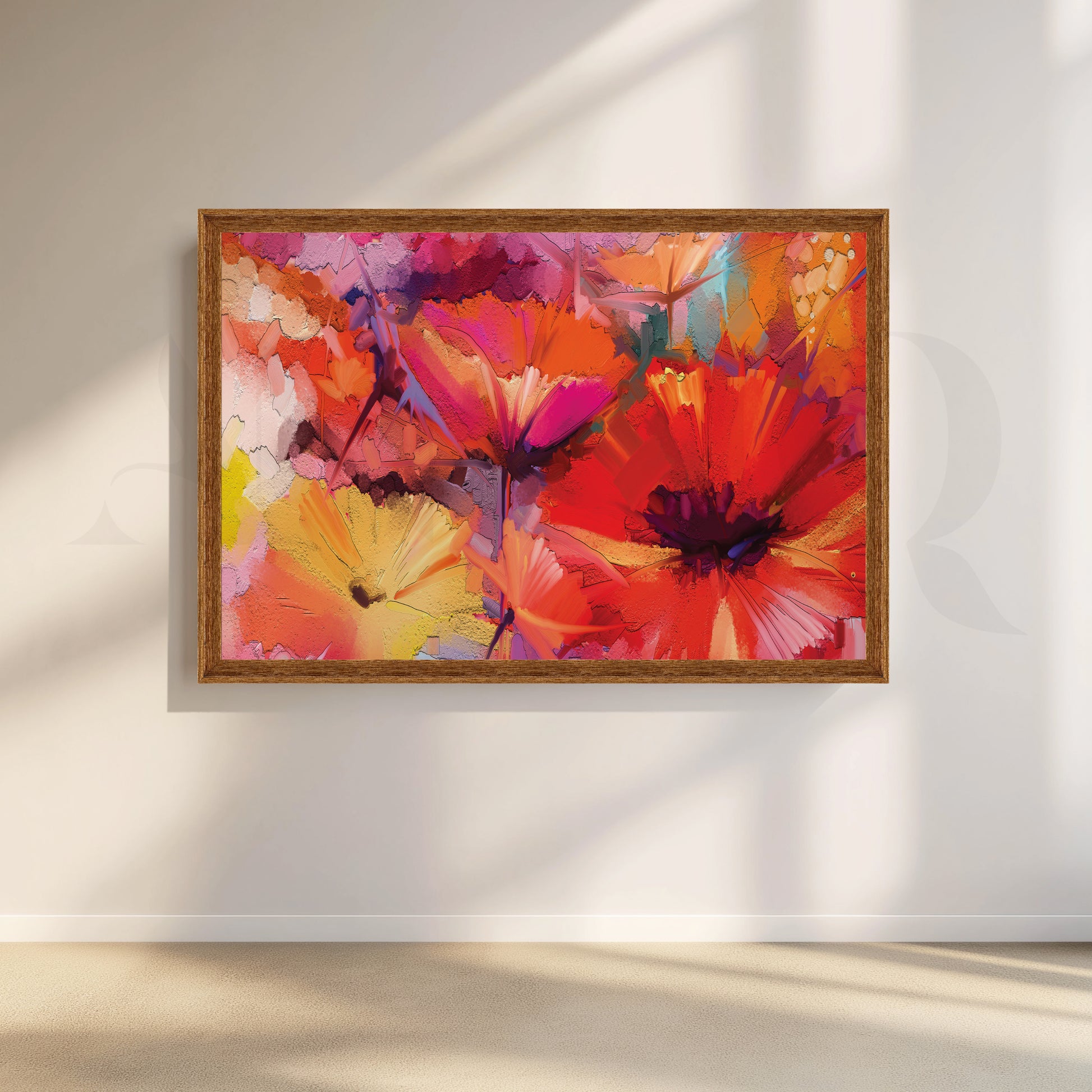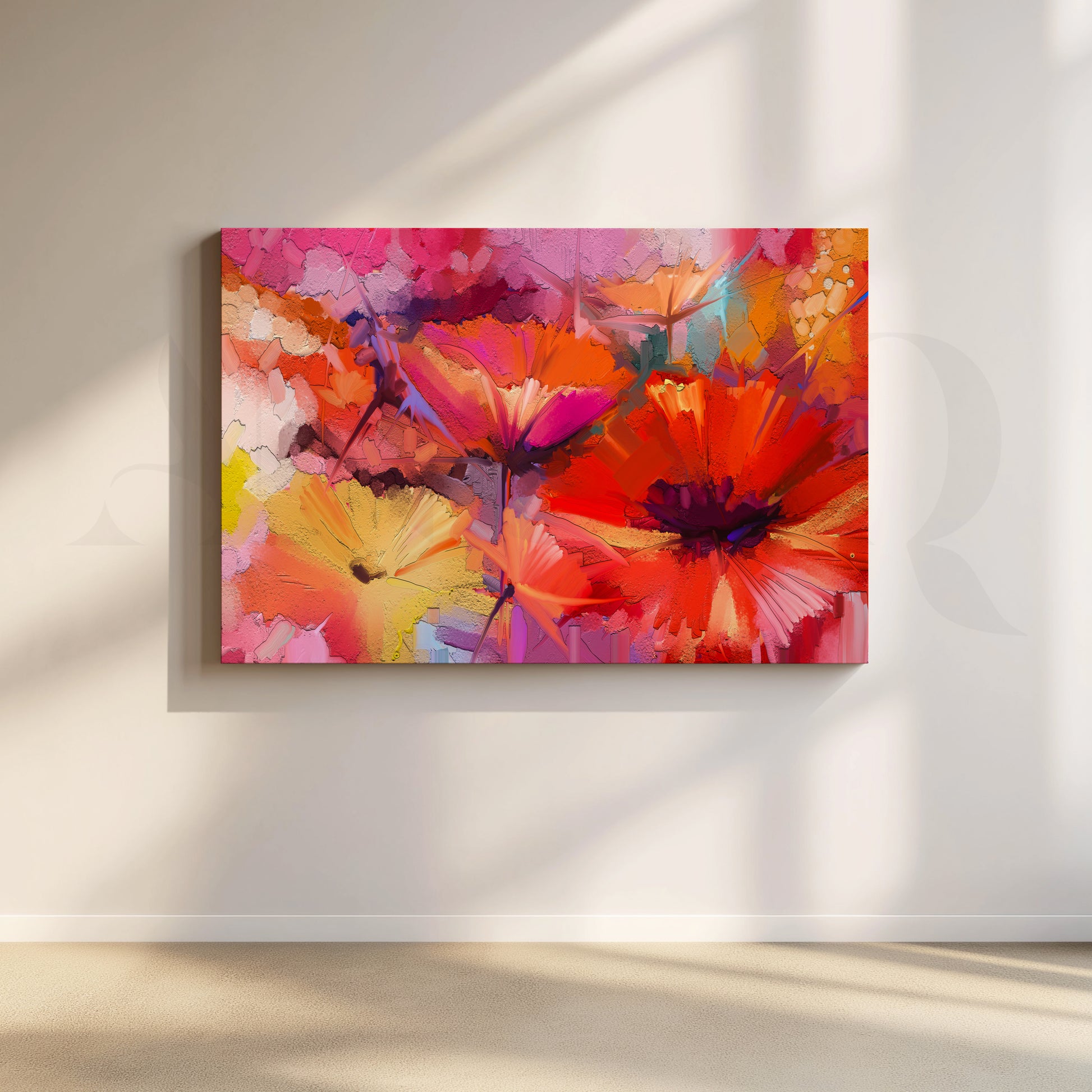 Dive into the world of vibrant classic floral abstract canvas art print with bursting hues of red, orange and yellow color, captures the essence of blooming flowers expressively. Perfect for adding colors and contemporary flair to any space.