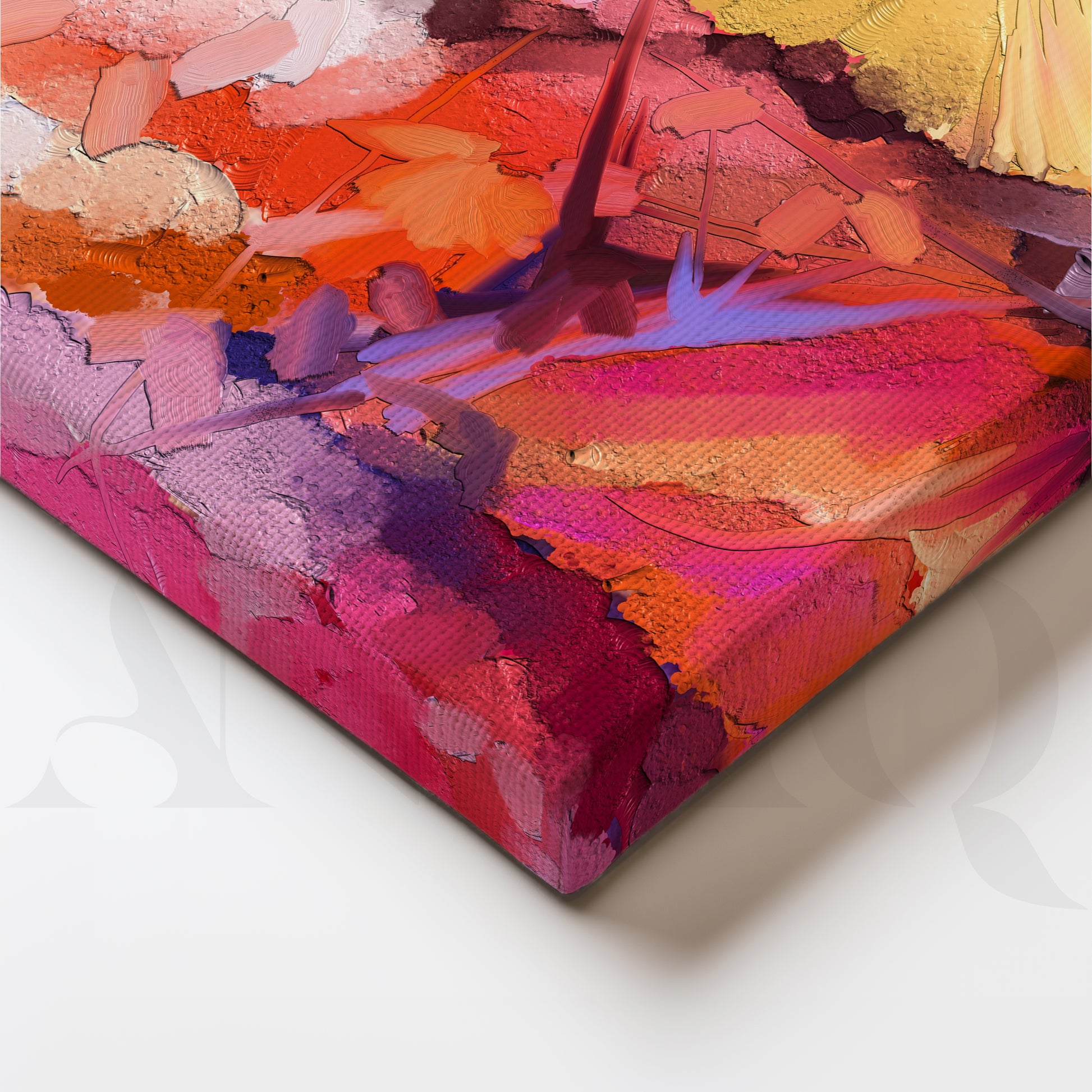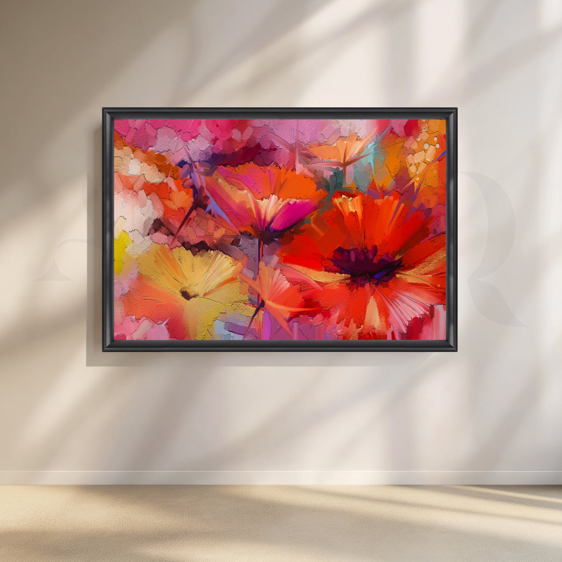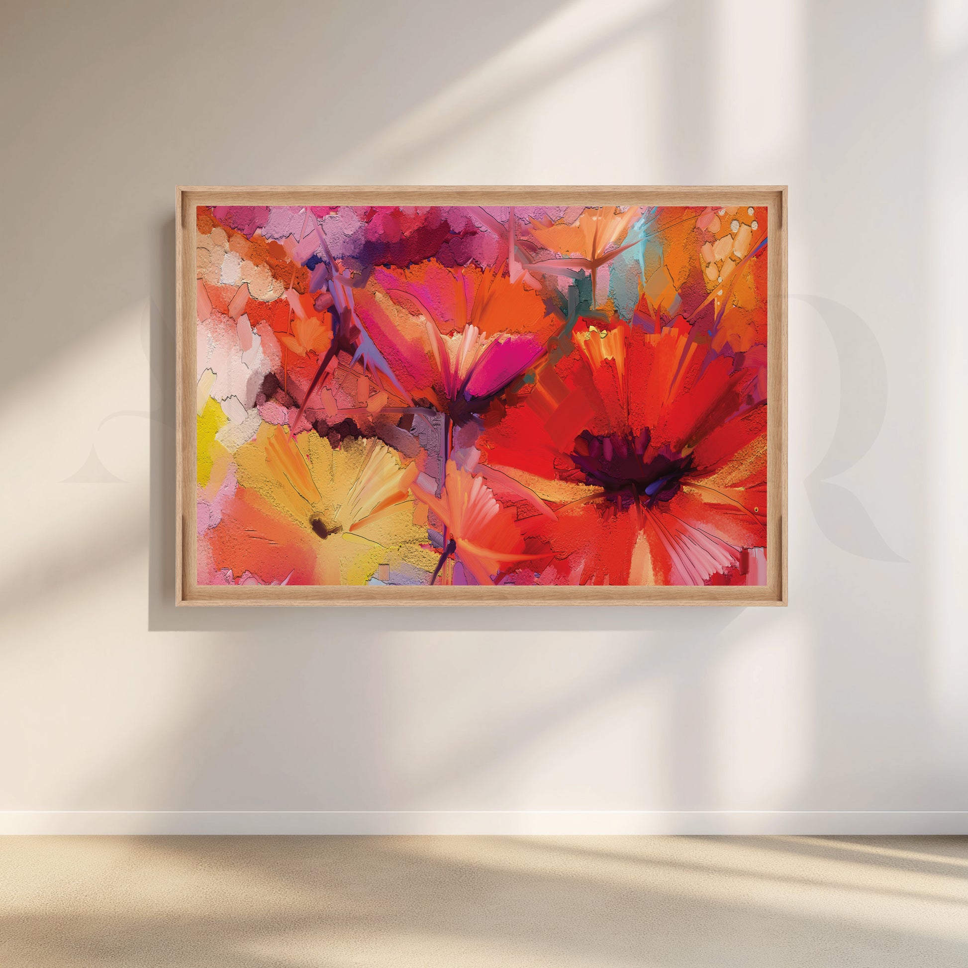 Dive into the world of vibrant classic floral abstract canvas art print with bursting hues of red, orange and yellow color, captures the essence of blooming flowers expressively. Perfect for adding colors and contemporary flair to any space.