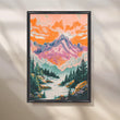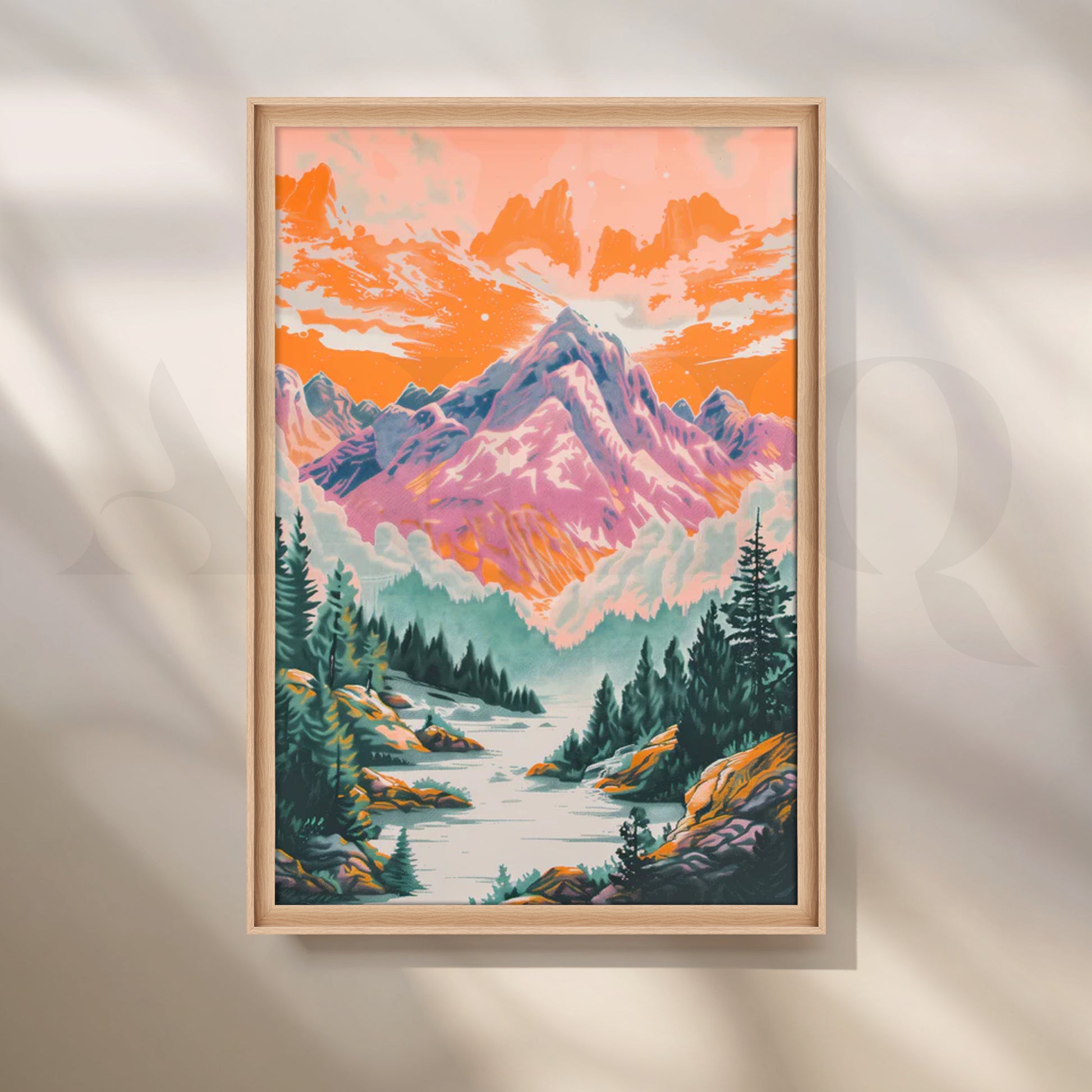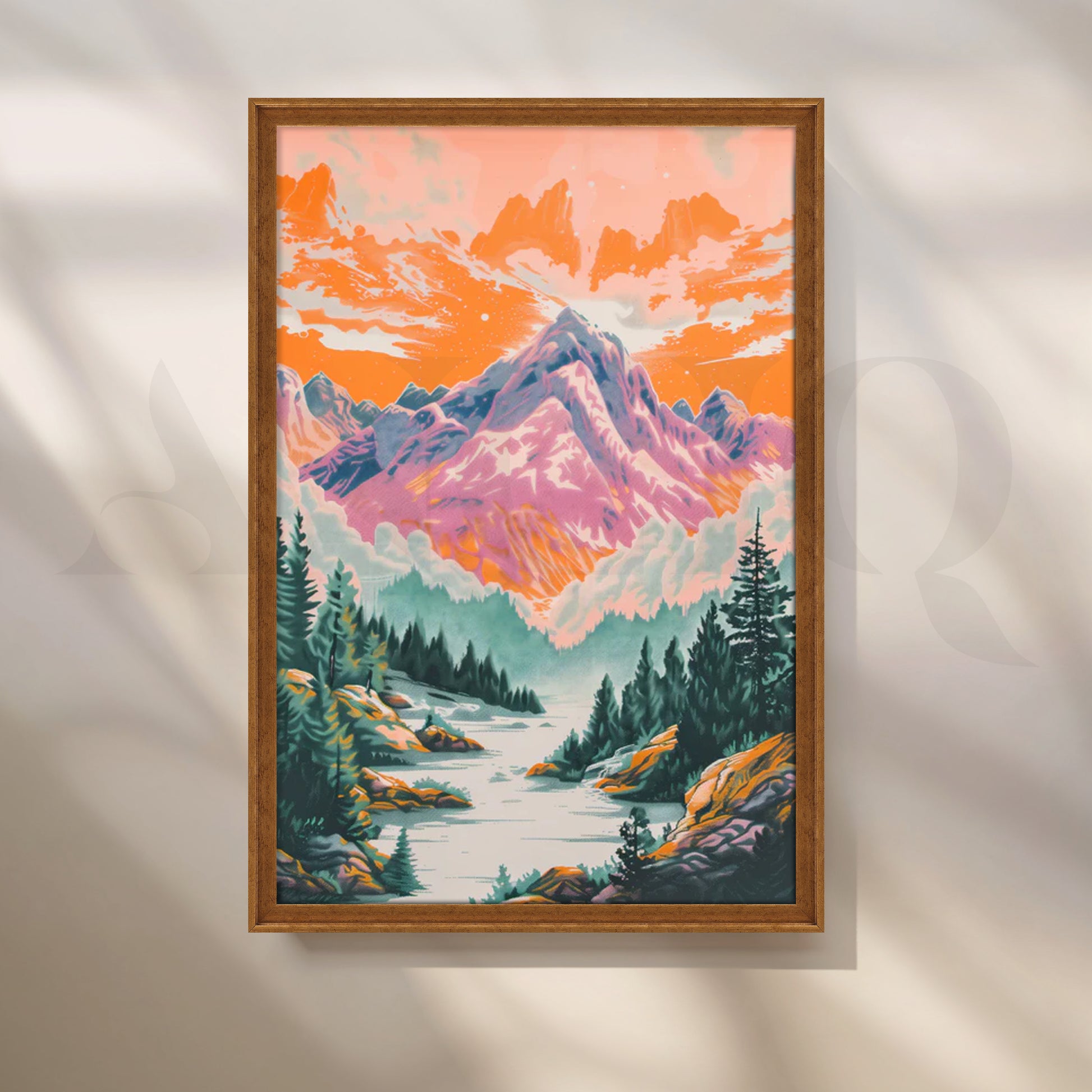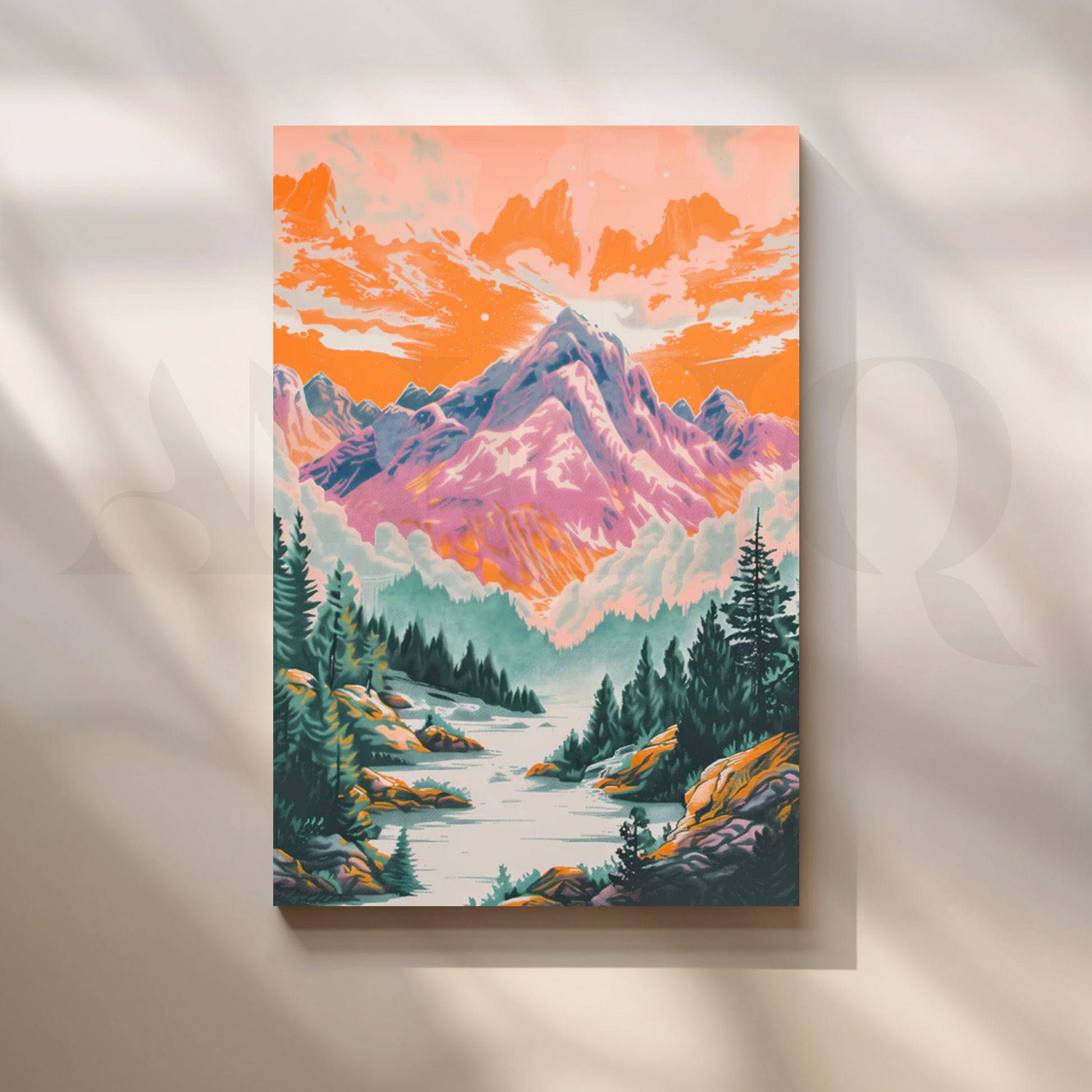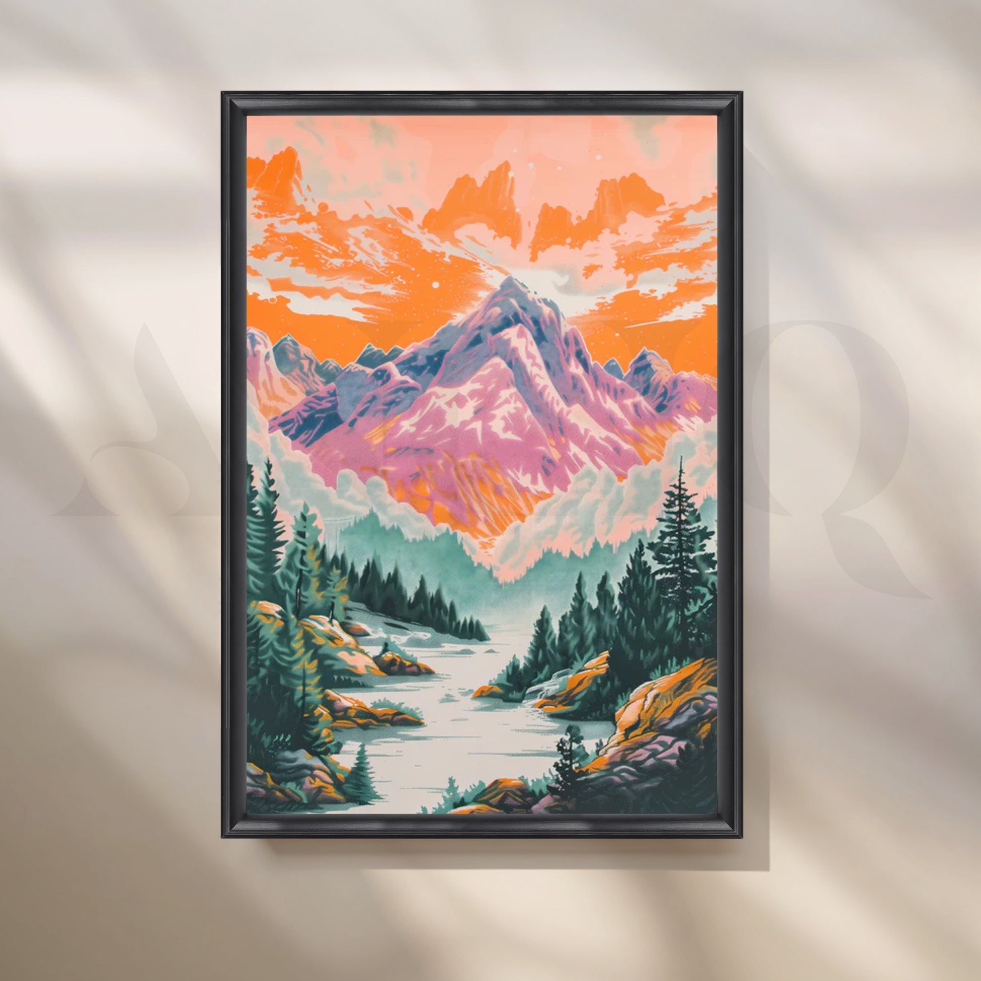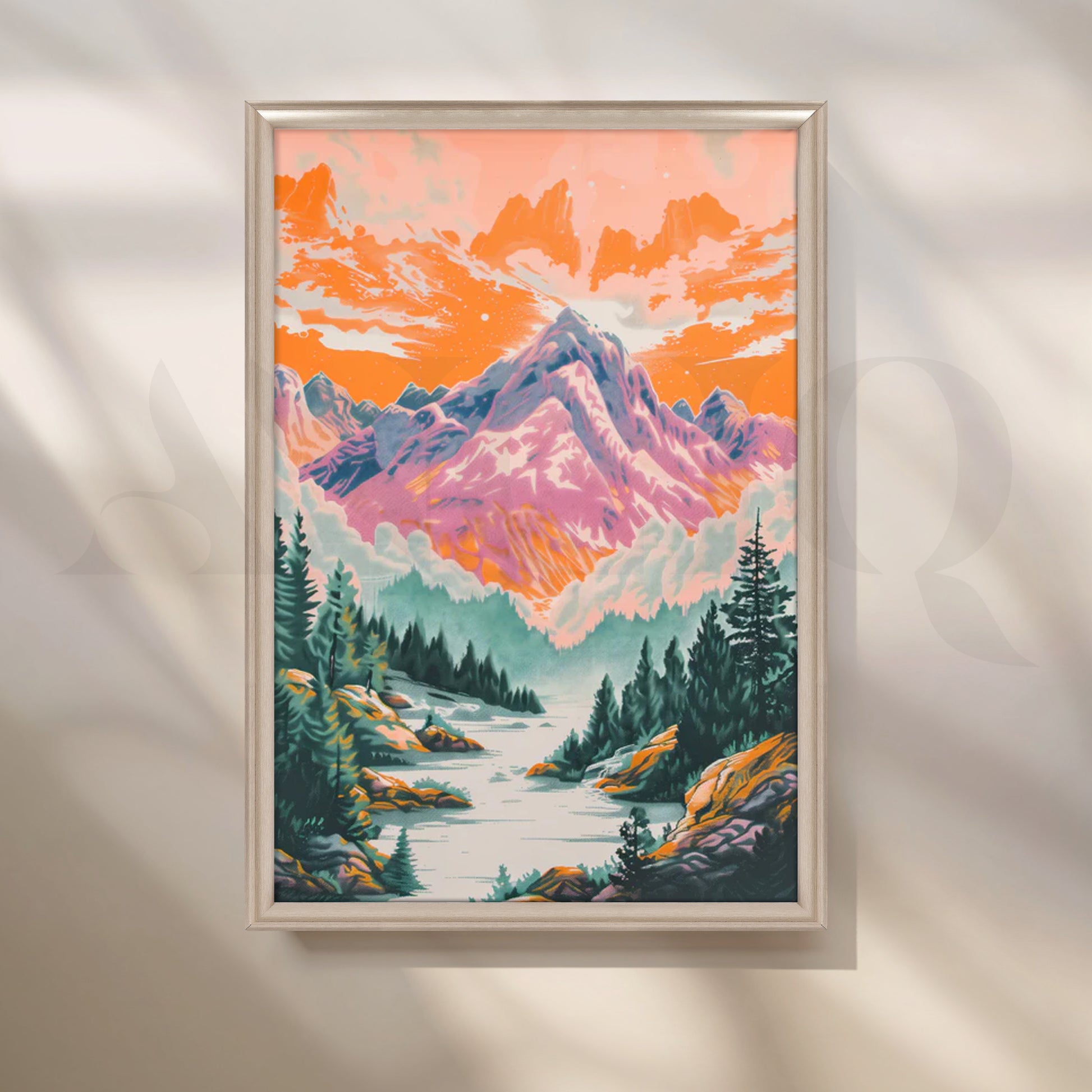 The Vivid Mountain Landscape Wall Poster captures a breathtaking alpine view with glowing pink peaks, vibrant orange skies, and lush green forests. This dynamic design transforms your space with a bold yet calming natural aesthetic, making it a perfect centerpiece for a bohemian-inspired home.