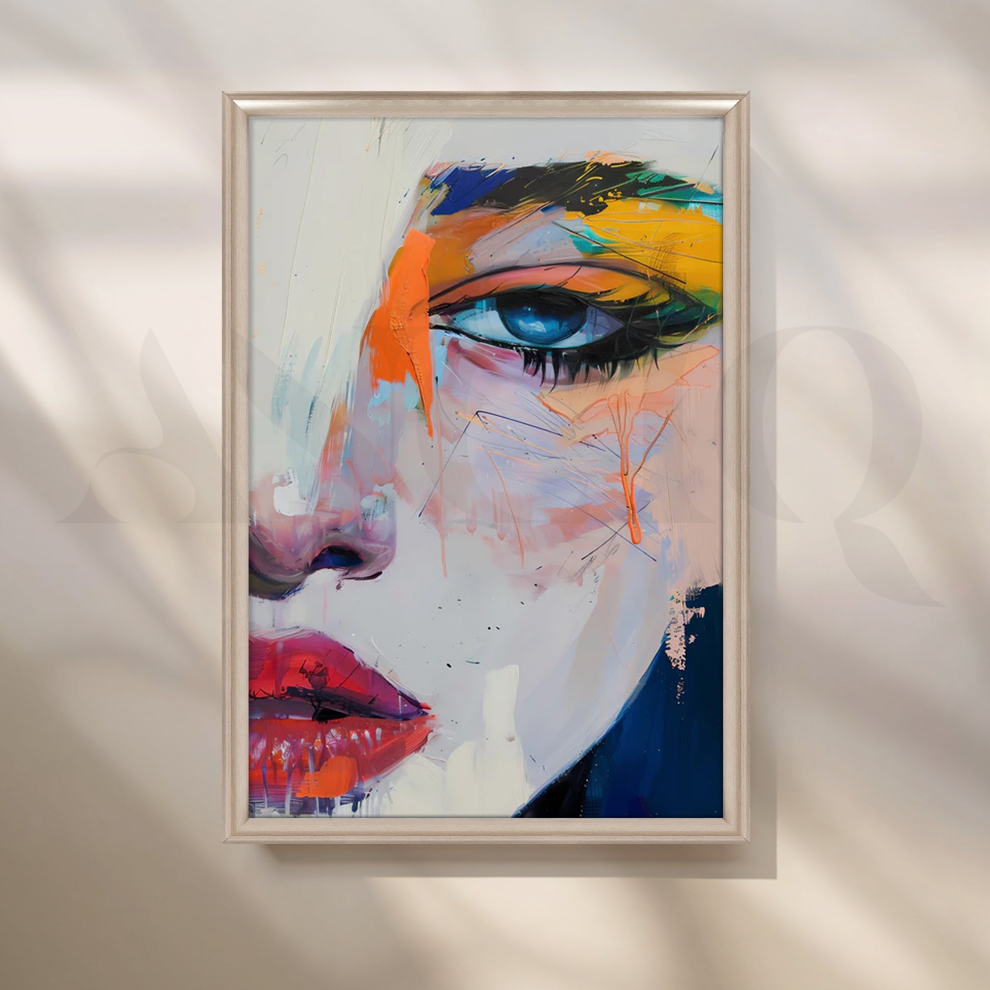 “Vivid Gaze” is a striking abstract portrait canvas that zooms in on a single eye and luscious red lips, layered with palette-knife textures and expressive brushstrokes in cobalt, teal, mustard, tangerine, blush, and crisp white. This contemporary wall art brings a fashion-forward, emotive vibe to any space—perfect as large living room art, a bold office focal point, or chic bedroom décor. Designed for shoppers seeking modern wall art, abstract portrait canvas painting, textured canvas art, and colorful contemporary home décor, this piece adds instant drama and gallery style to minimalist, boho, and modern interiors alike.
