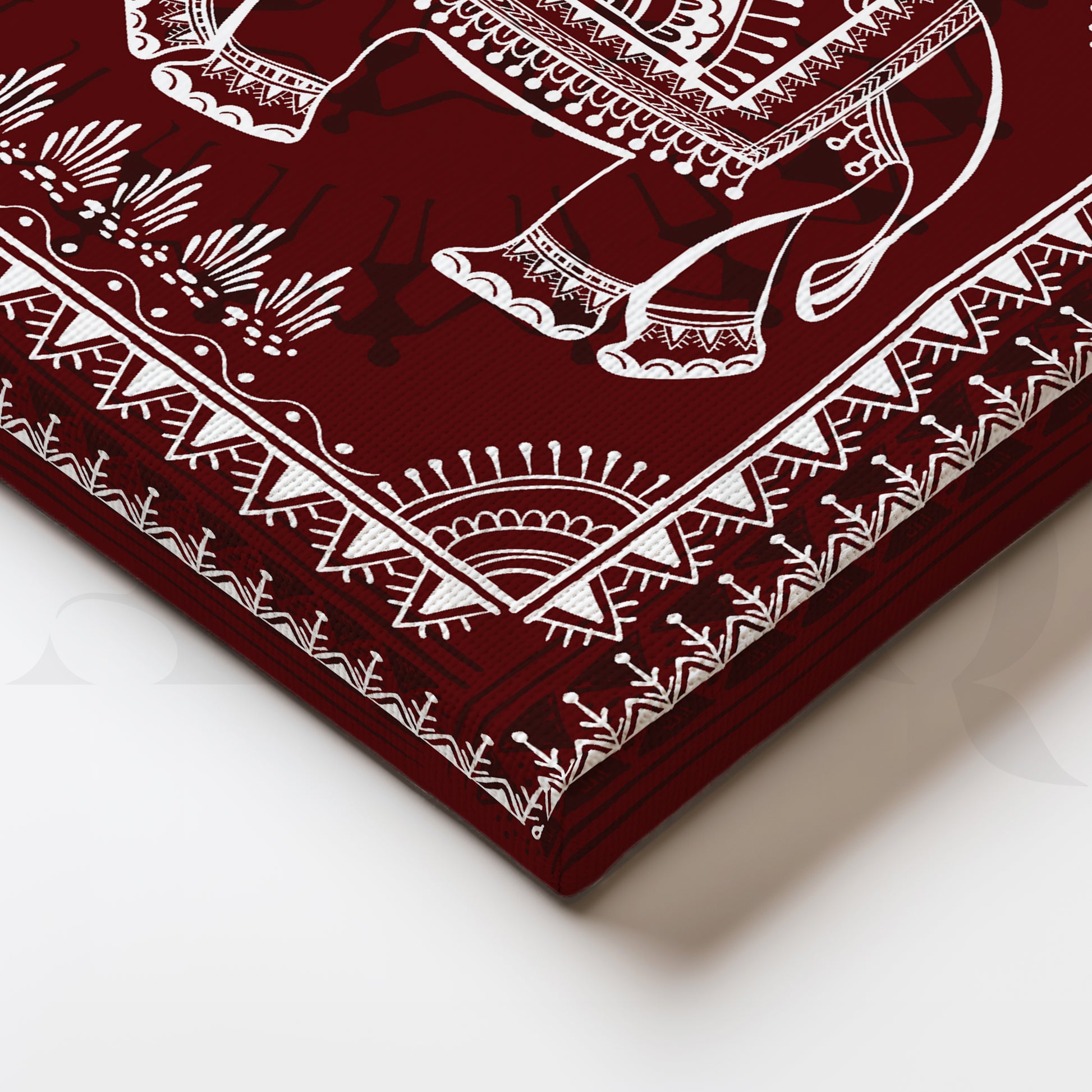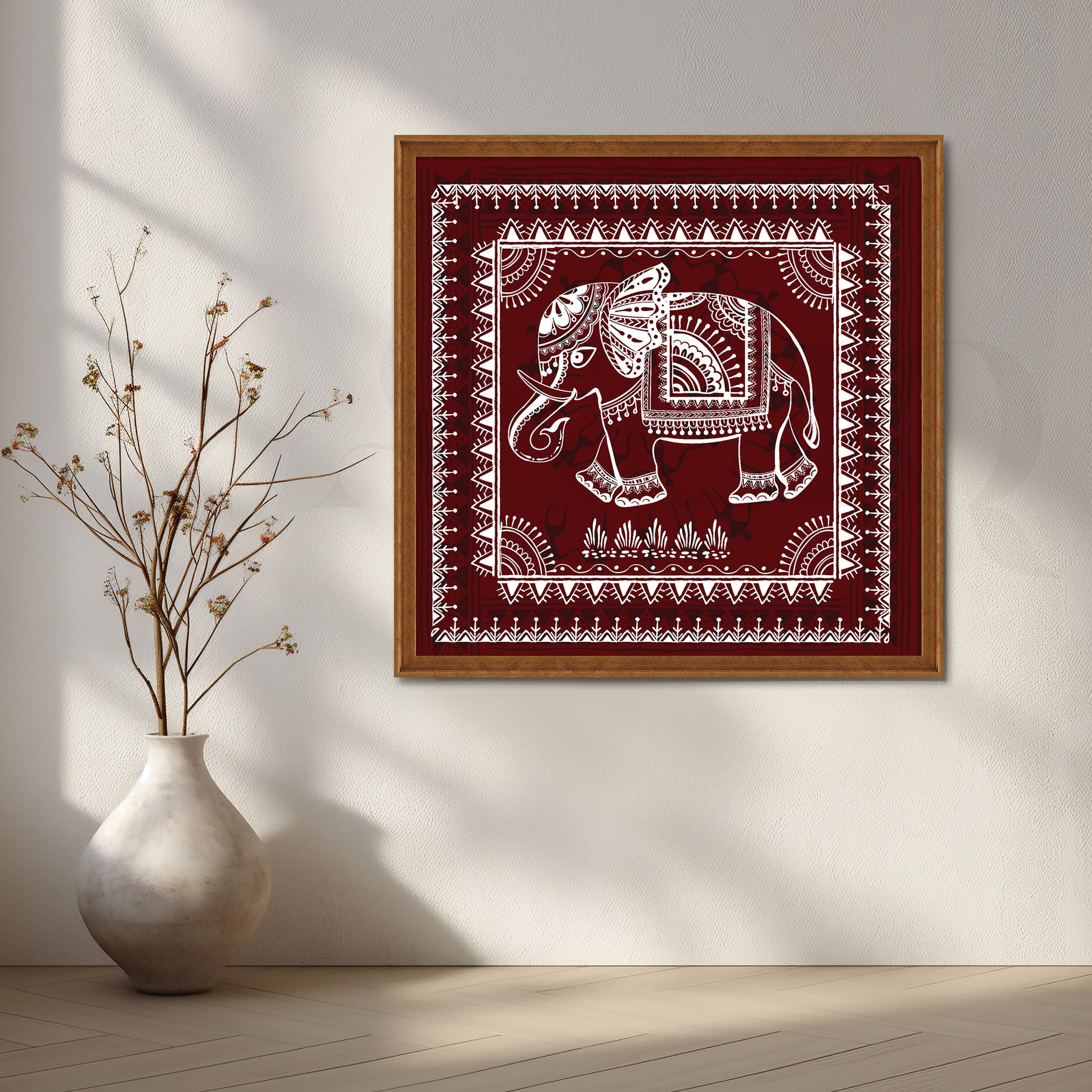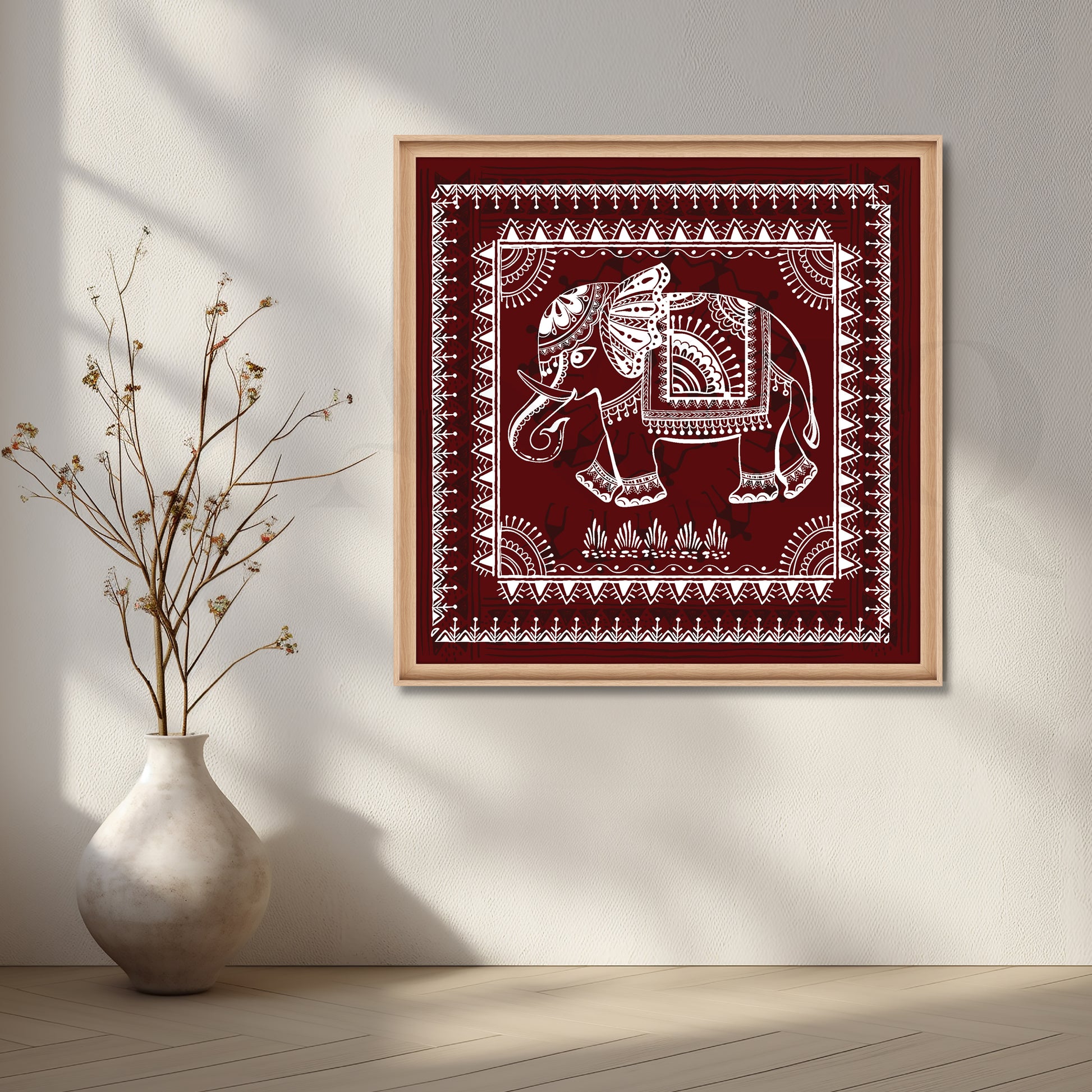This eye-catching illustration features a regal elephant in profile, its trunk raised high in a bold and confident pose. Geometric Flair: Striking geometric shapes in teal, yellow, and orange adorn the elephant's back, adding a touch of contemporary style and visual interest. Pop of Color: The rich red background, patterned with white foliage, creates a vibrant contrast and a dynamic backdrop for the majestic elephant. Wildly Stylish: This unique piece is a perfect conversation starter, ideal for those who appreciate modern art with a touch of whimsy. Bring the Jungle Indoors: Transform your space with this captivating elephant illustration, adding a touch of the wild and wonderful to your décor.
