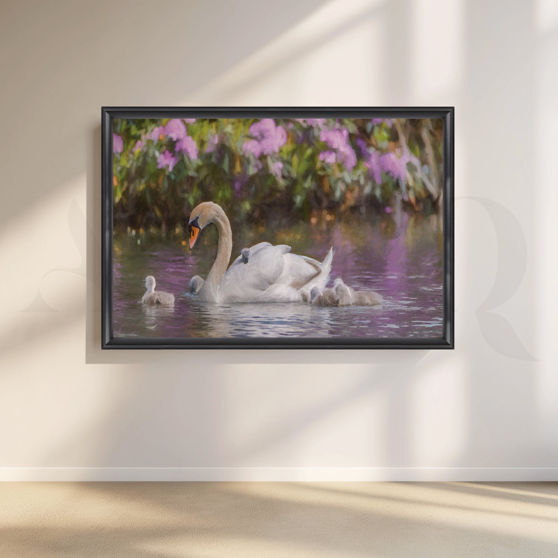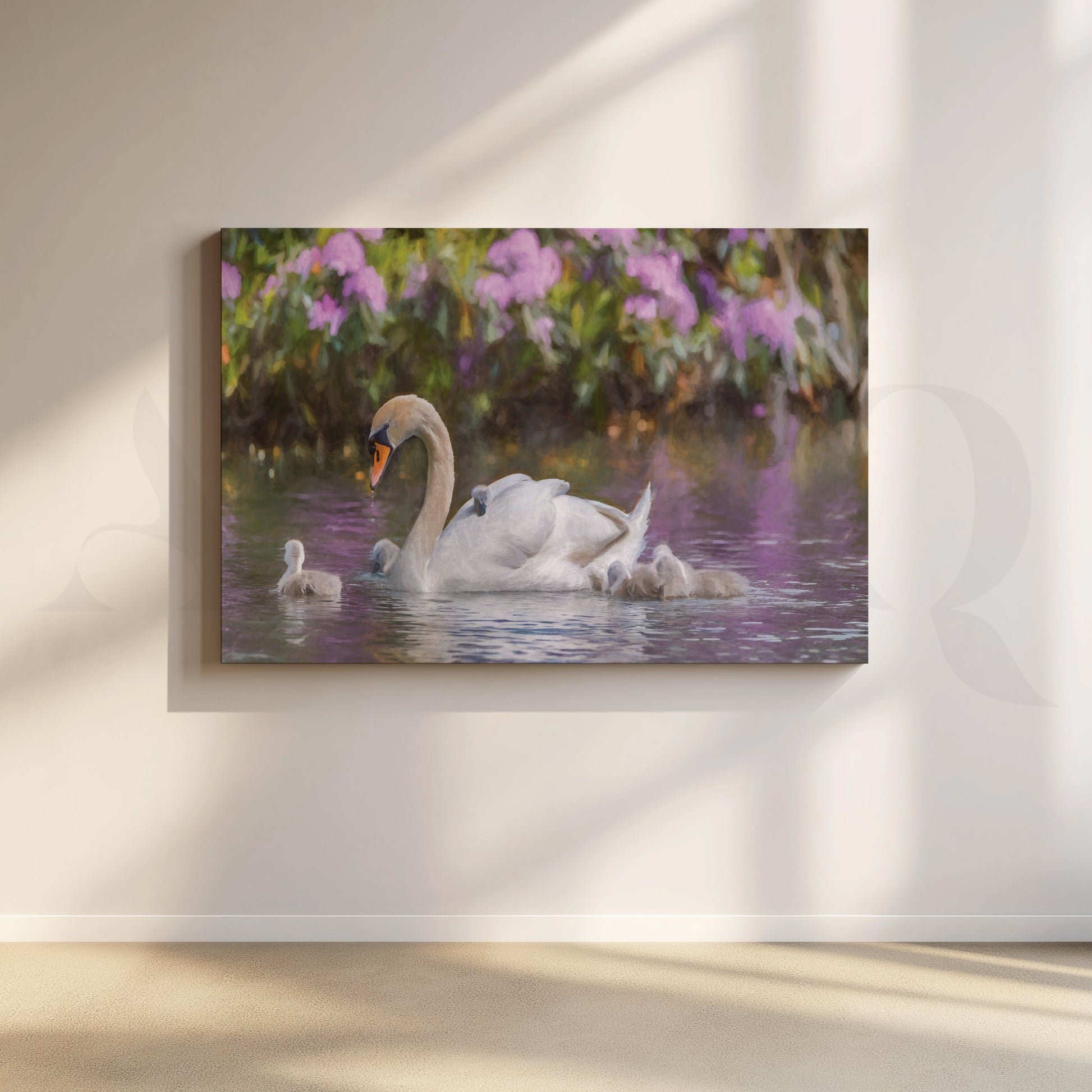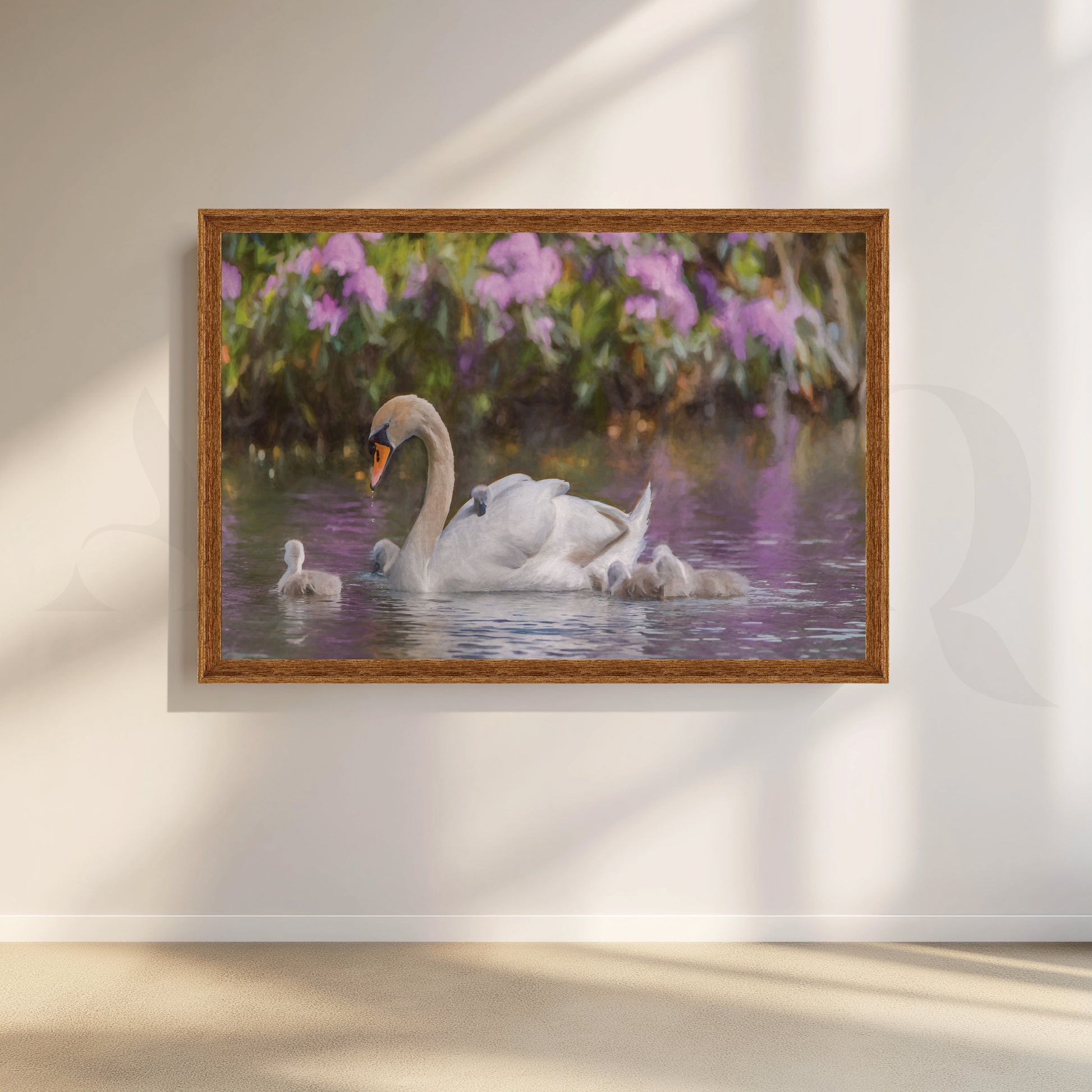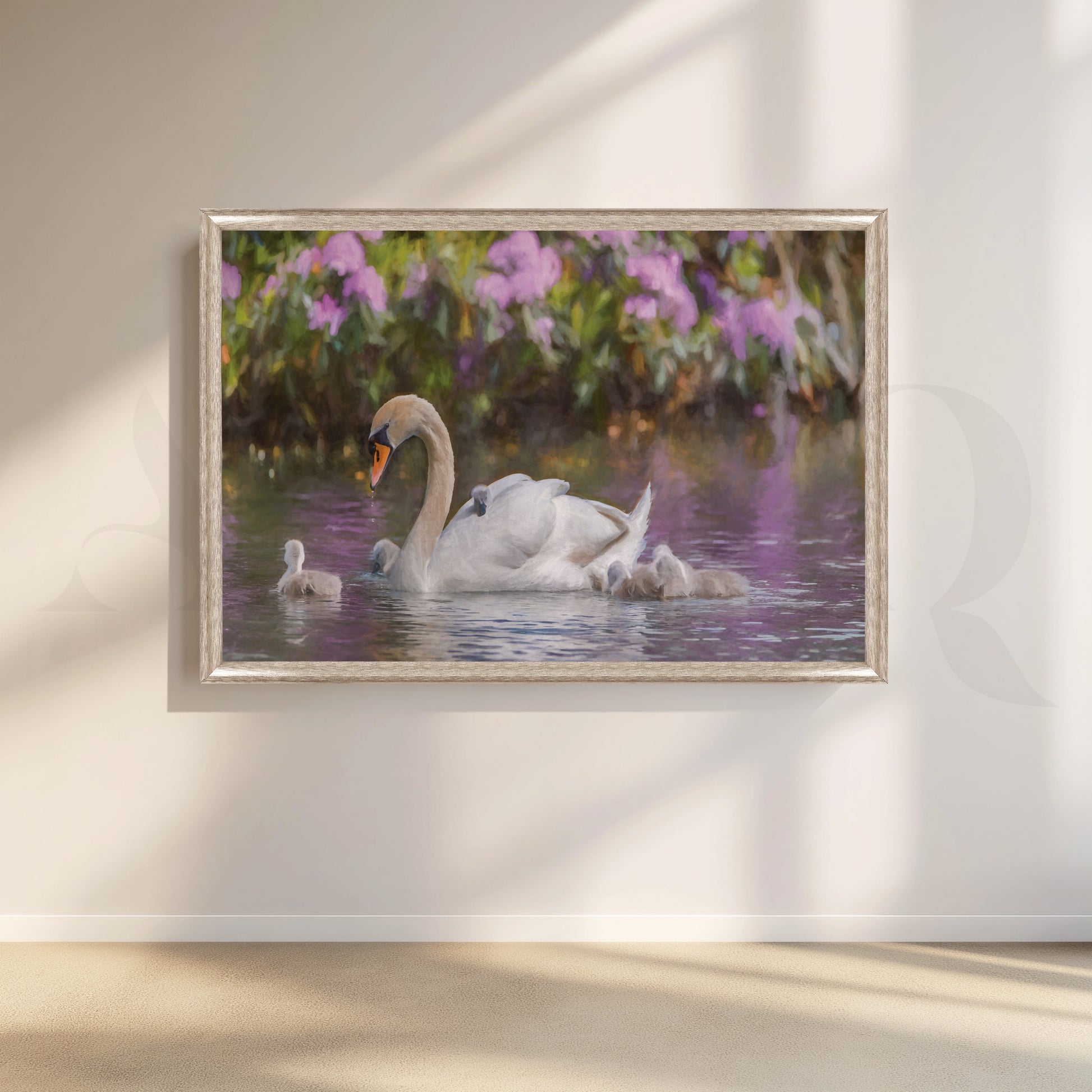 Immerse yourself in tranquility. This captivating landscape features a graceful white swan, her cygnets nestled close, gliding across a vibrant tapestry of water lilies. Brushstrokes dance with light, capturing the serenity of a perfect summer day.