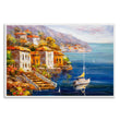 This vibrant canvas painting shows a colorful harbor. A sailboat with a white sail lies on a turquoise sea, while colorful houses line the shore. This piece would add a beautiful beach view to any home.