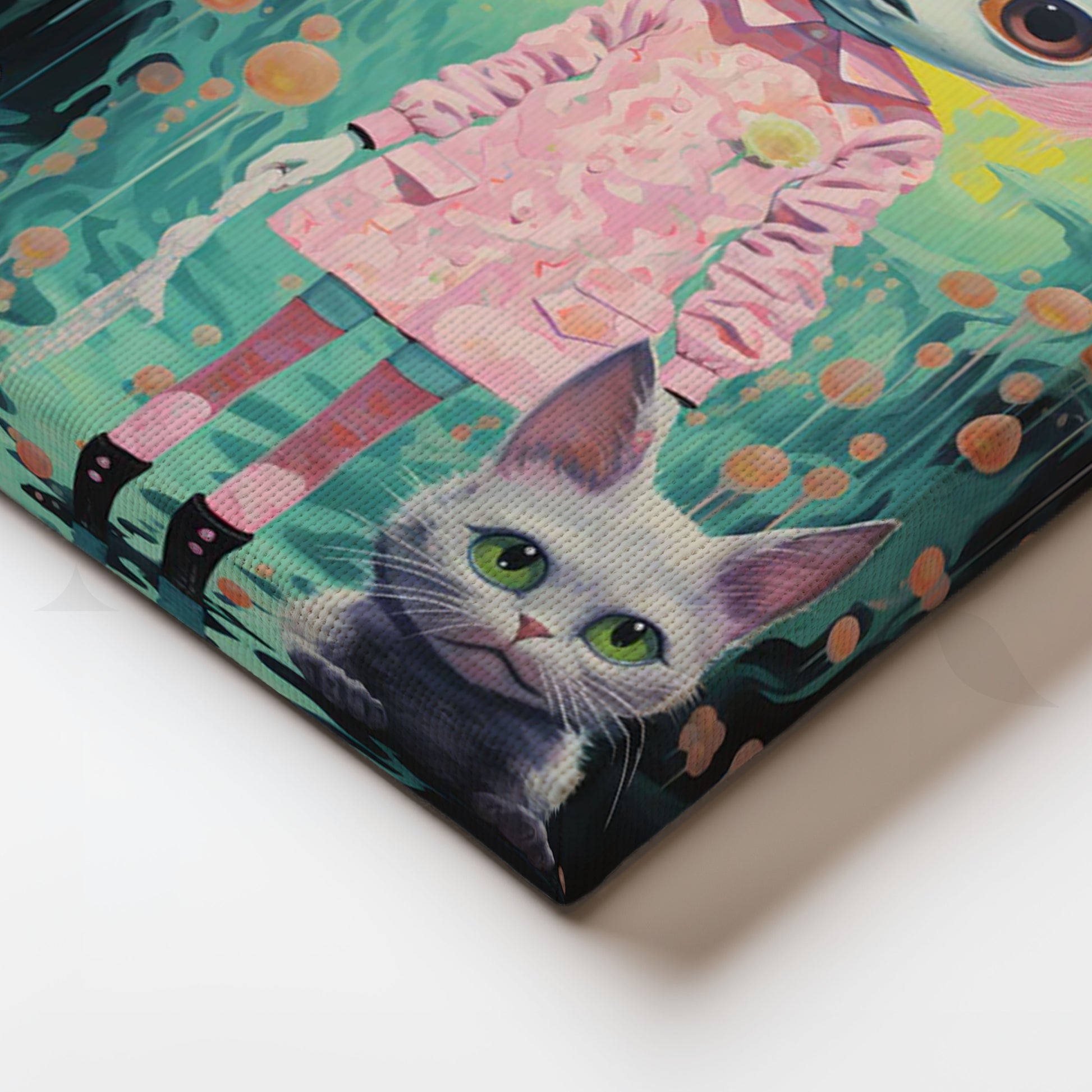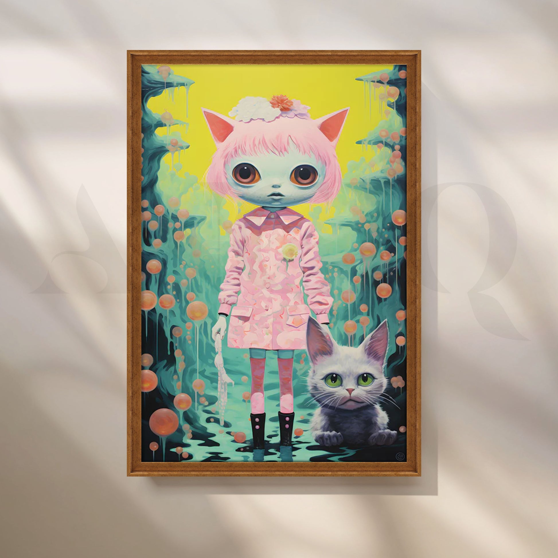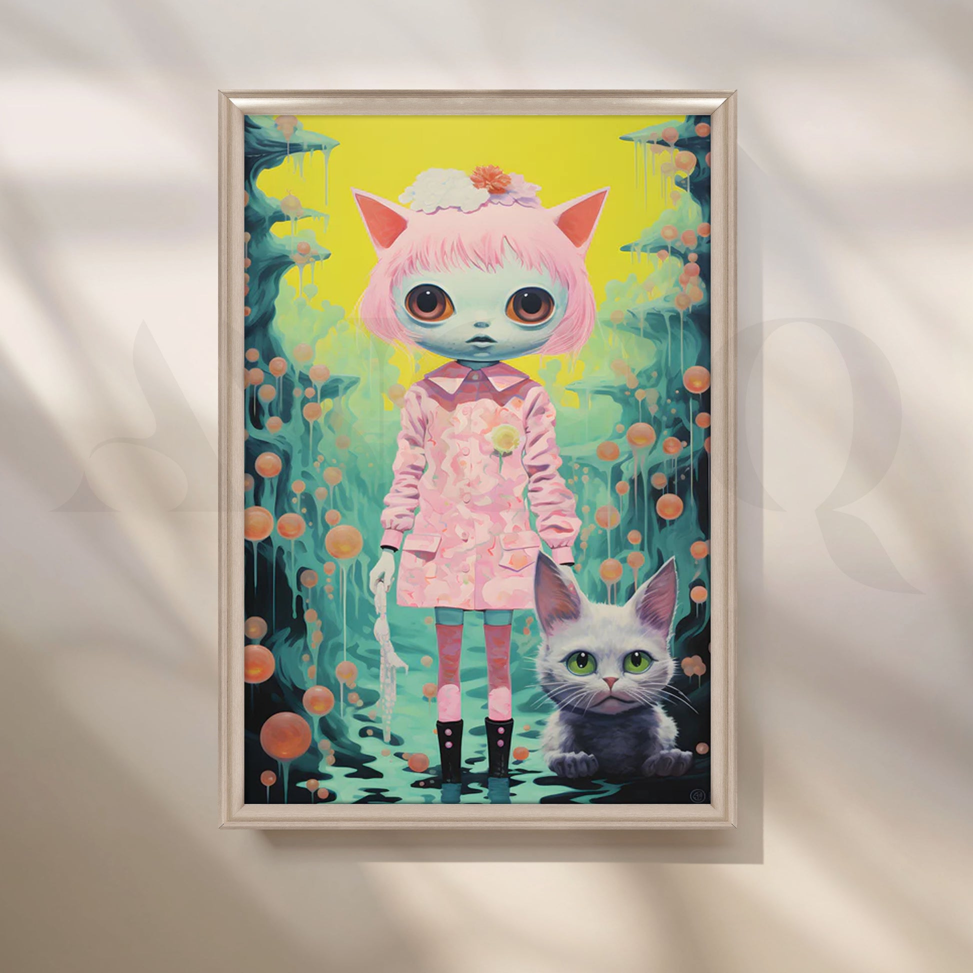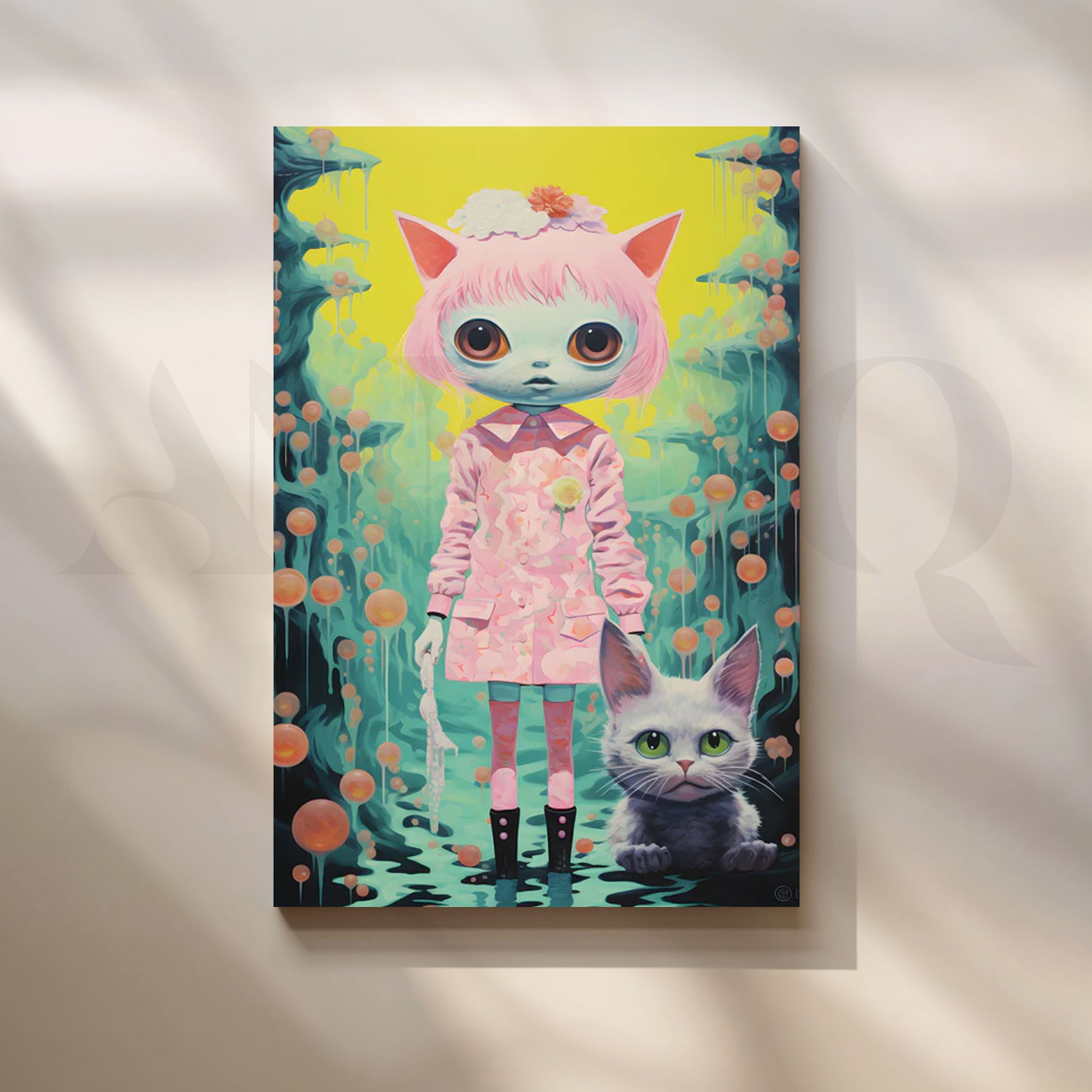 op-surreal kawaii artwork of a big-eyed cat-girl in a pink dress with kitty ears, standing beside her cute cat against a neon yellow and teal fantasy backdrop with floating orbs and drip details. This pastel, anime-inspired piece adds playful whimsy to bedrooms, kids’ rooms, nurseries and art studios. Keywords: kawaii wall art, anime cat girl poster, pop surrealism canvas, big-eyes art, pastel pink décor, cute cat artwork, otaku room decor, teen bedroom wall art, whimsical fantasy painting.