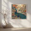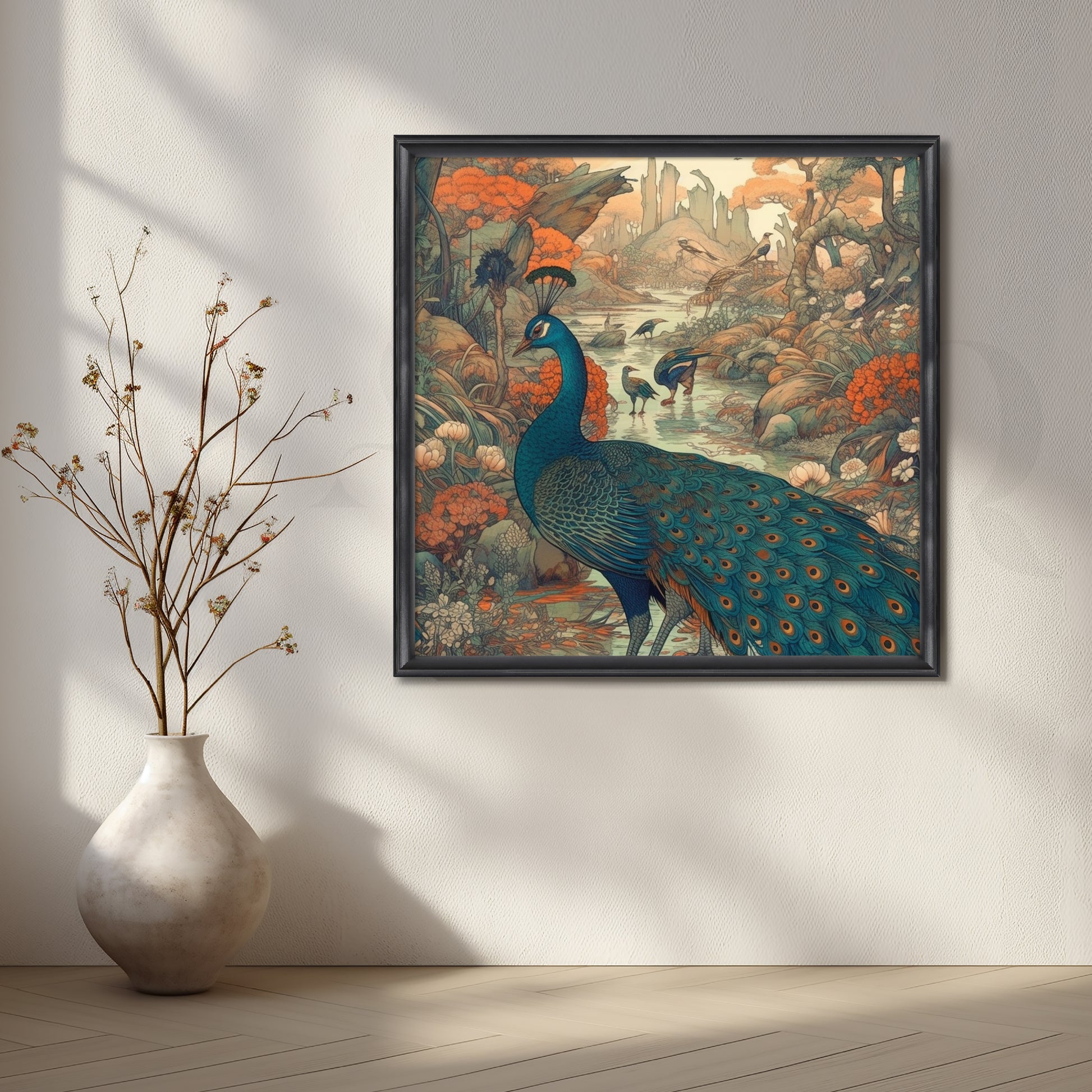 Anciq’s Whispering Peacocks by the Stream canvas artwork is a symphony of nature’s elegance. A regal peacock stands amidst a dreamy forest filled with warm autumnal tones, as other birds wade gently through a flowing stream.