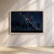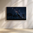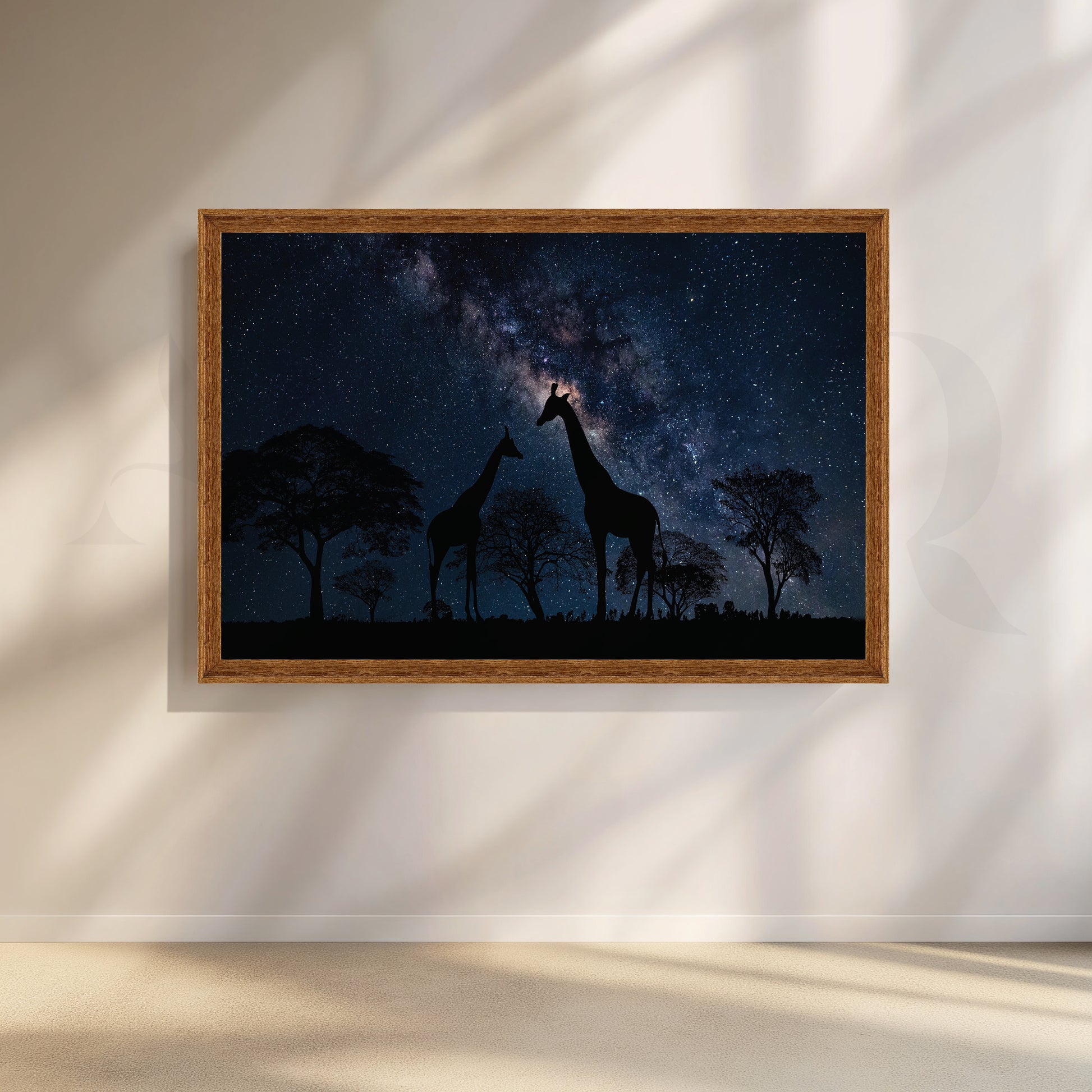 Bring the splendor of the desert into your home with this stunning canvas painting. Two giraffes stand tall under a stunning night sky filled with millions of twinkling stars. The image of the acacia tree adds drama to the scene. This high quality canvas will surely be a conversation starter and loveable artwork for years to come.