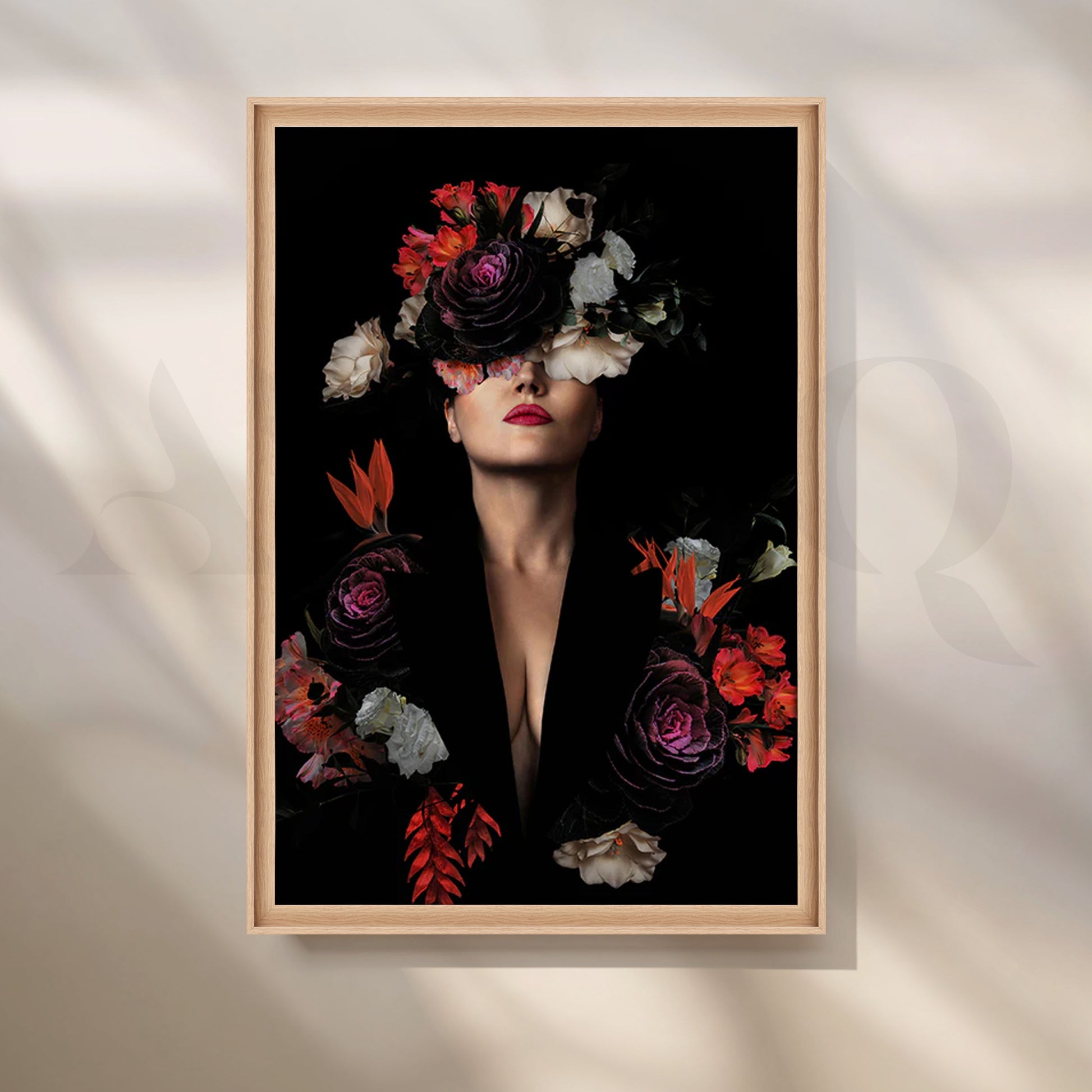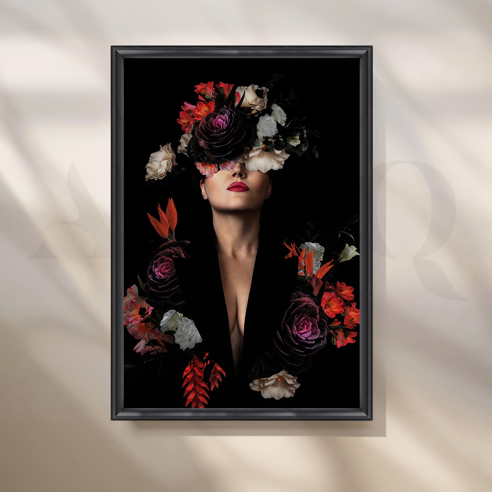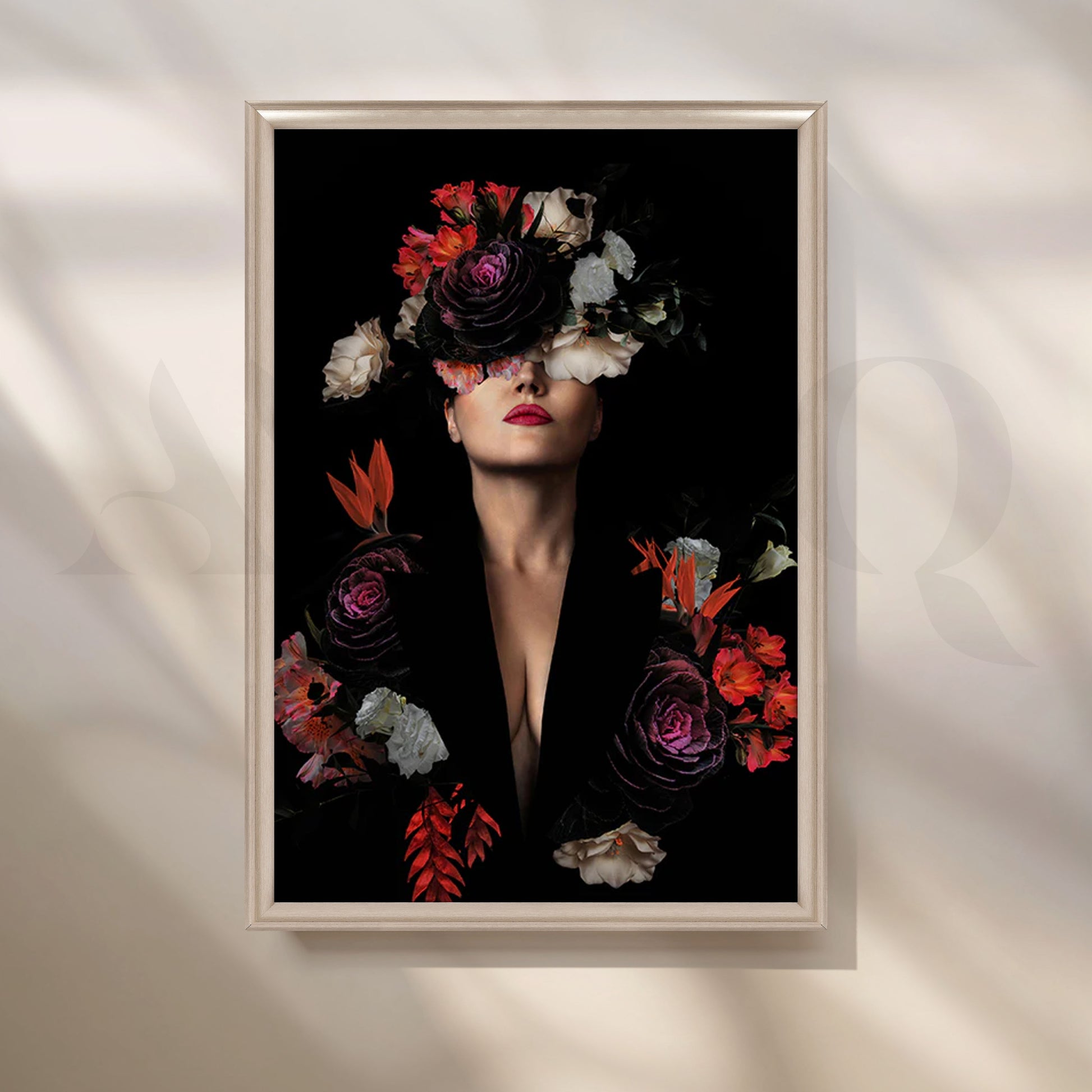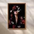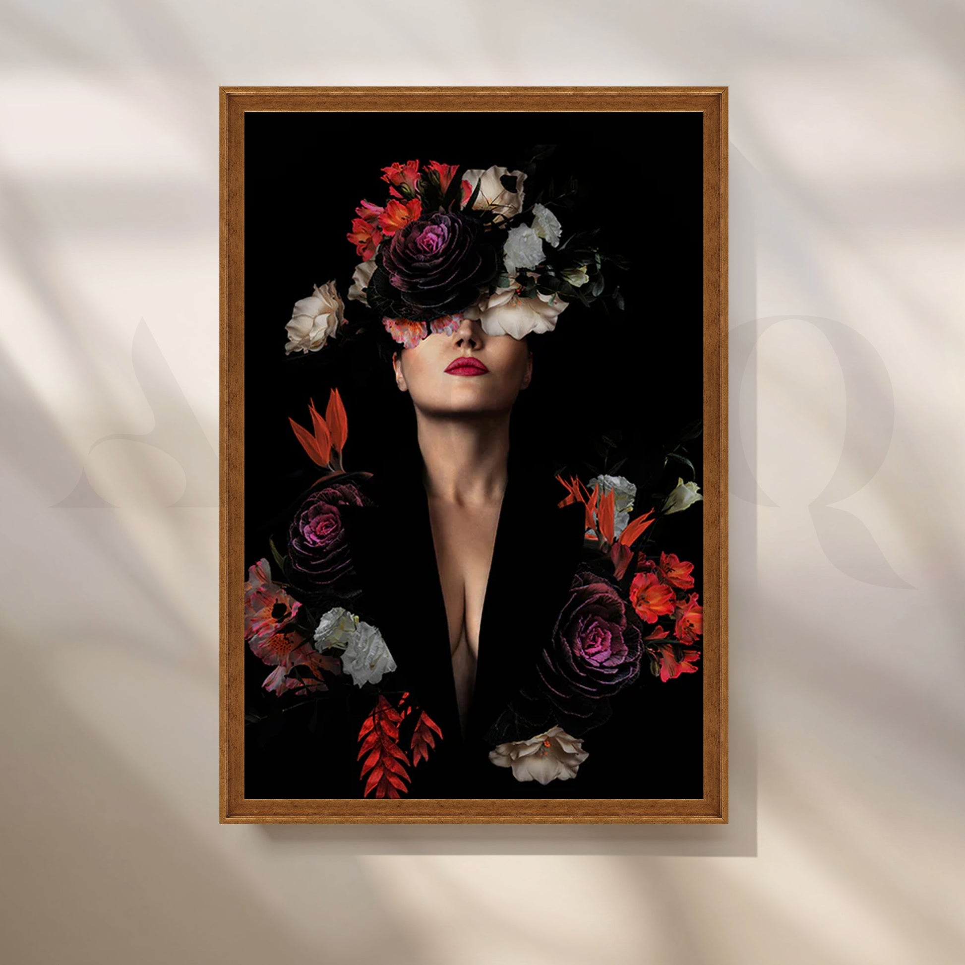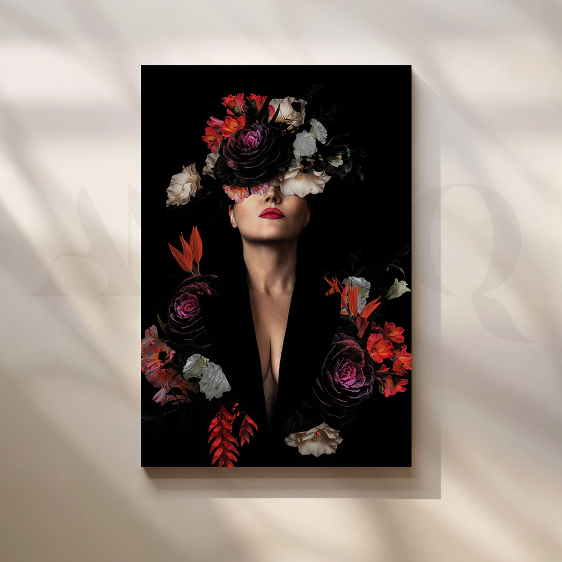 A couture-inspired portrait on a deep black ground: a poised figure in a plunging tuxedo jacket crowned with a lush floral halo—velvety roses, ivory blooms, fiery birds-of-paradise, and autumnal foliage. High-contrast lighting and rich jewel tones (plum, carmine, coral) create moody glamour with a modern, editorial edge. A striking statement for bedrooms, dressing rooms, boutique lobbies, salons, and luxe living spaces. Keywords: dark floral wall art, fashion portrait canvas, moody botanical decor, black background art print, femme fatale artwork, dramatic statement piece, floral crown painting, modern glam wall decor, editorial art for bedroom, luxury gallery canvas.