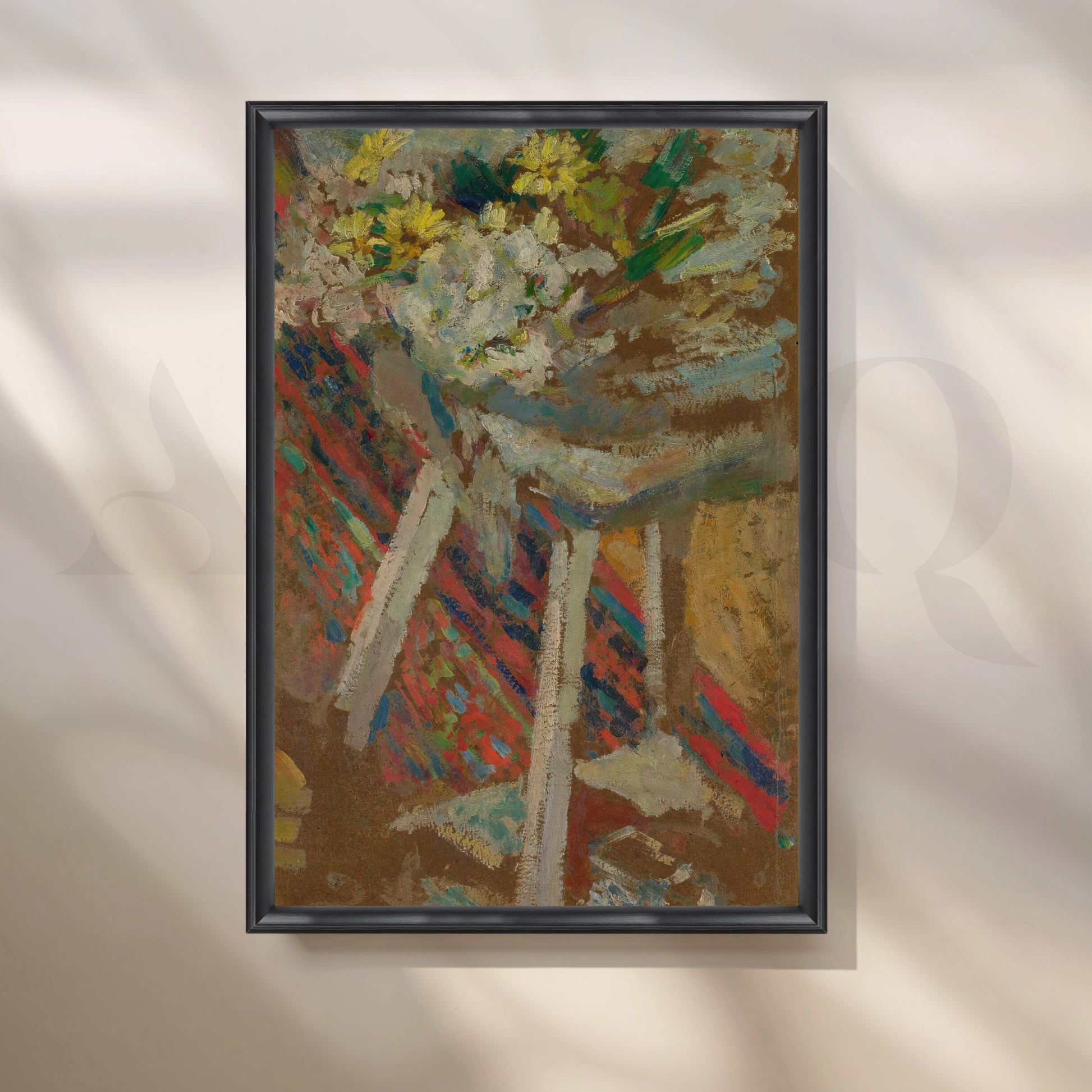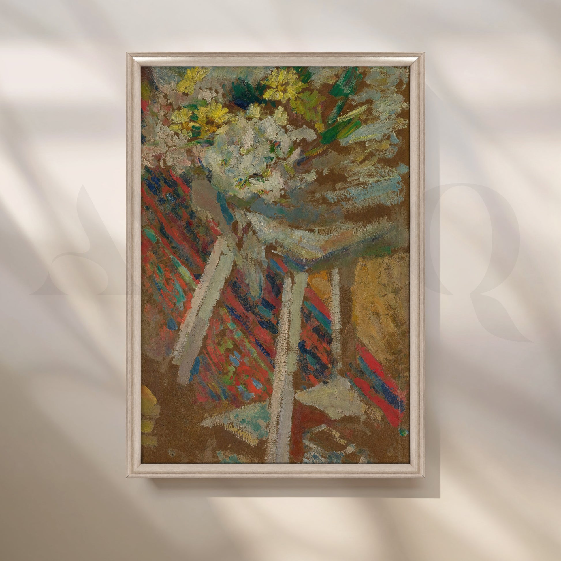 A lush, painterly close-up of garden blooms bursts with textured strokes—cream hydrangeas, yellow daisies and fresh greens against a warm, rustic ground. This expressive floral still life brightens dining spaces, breakfast nooks, entryways and farmhouse kitchens. Keywords: floral canvas wall art, impressionist bouquet painting, rustic kitchen decor, colorful dining room art, textured flowers print, cottagecore decor.
