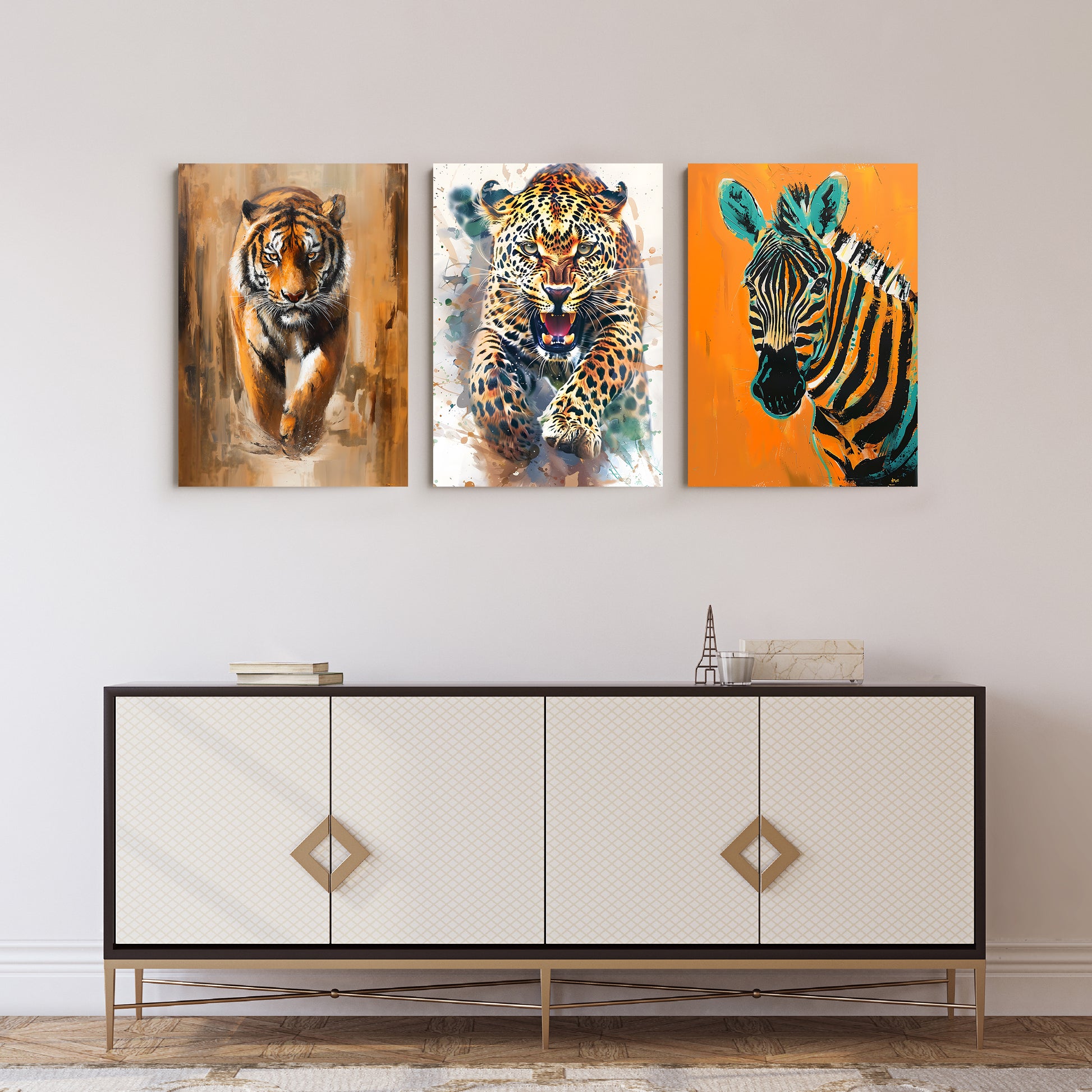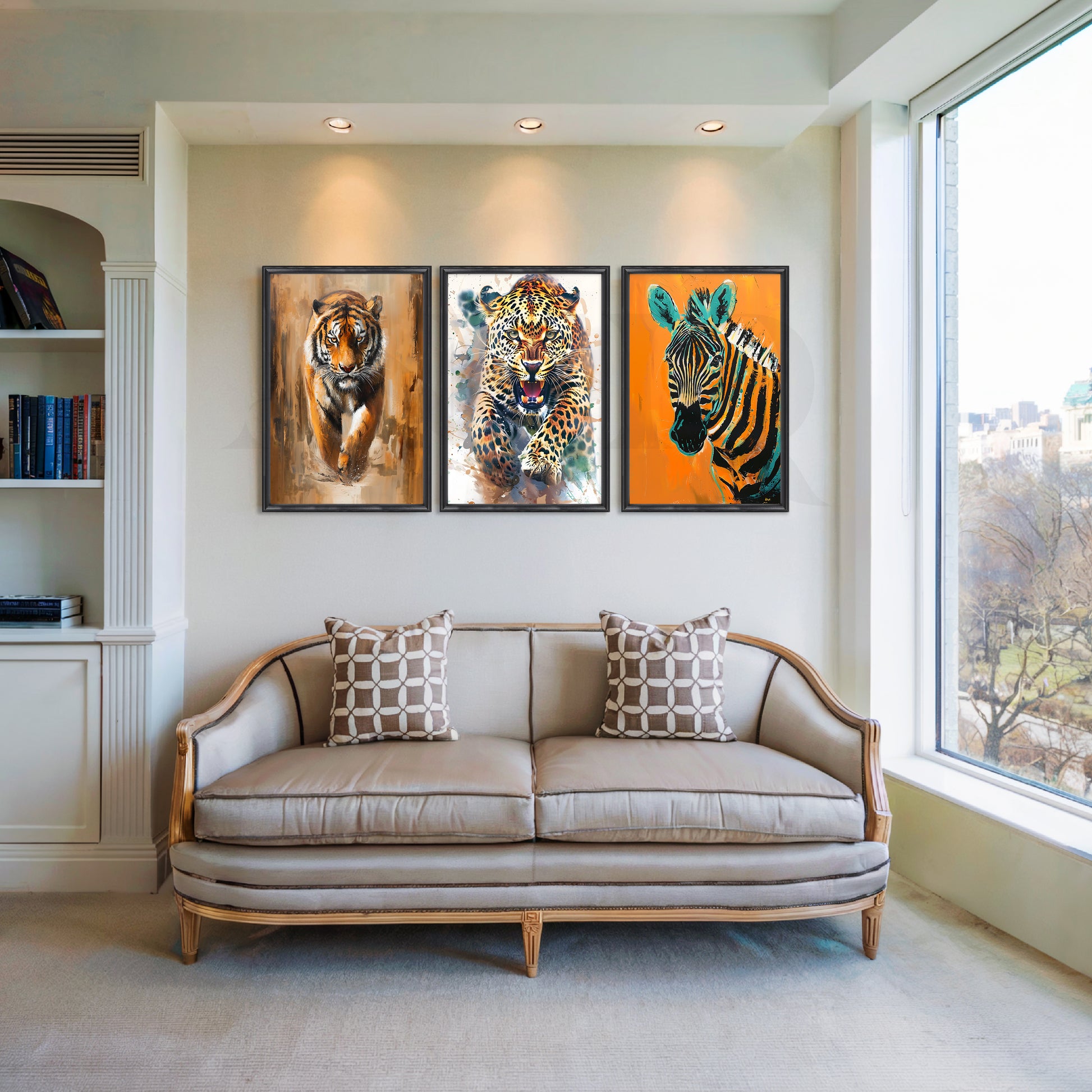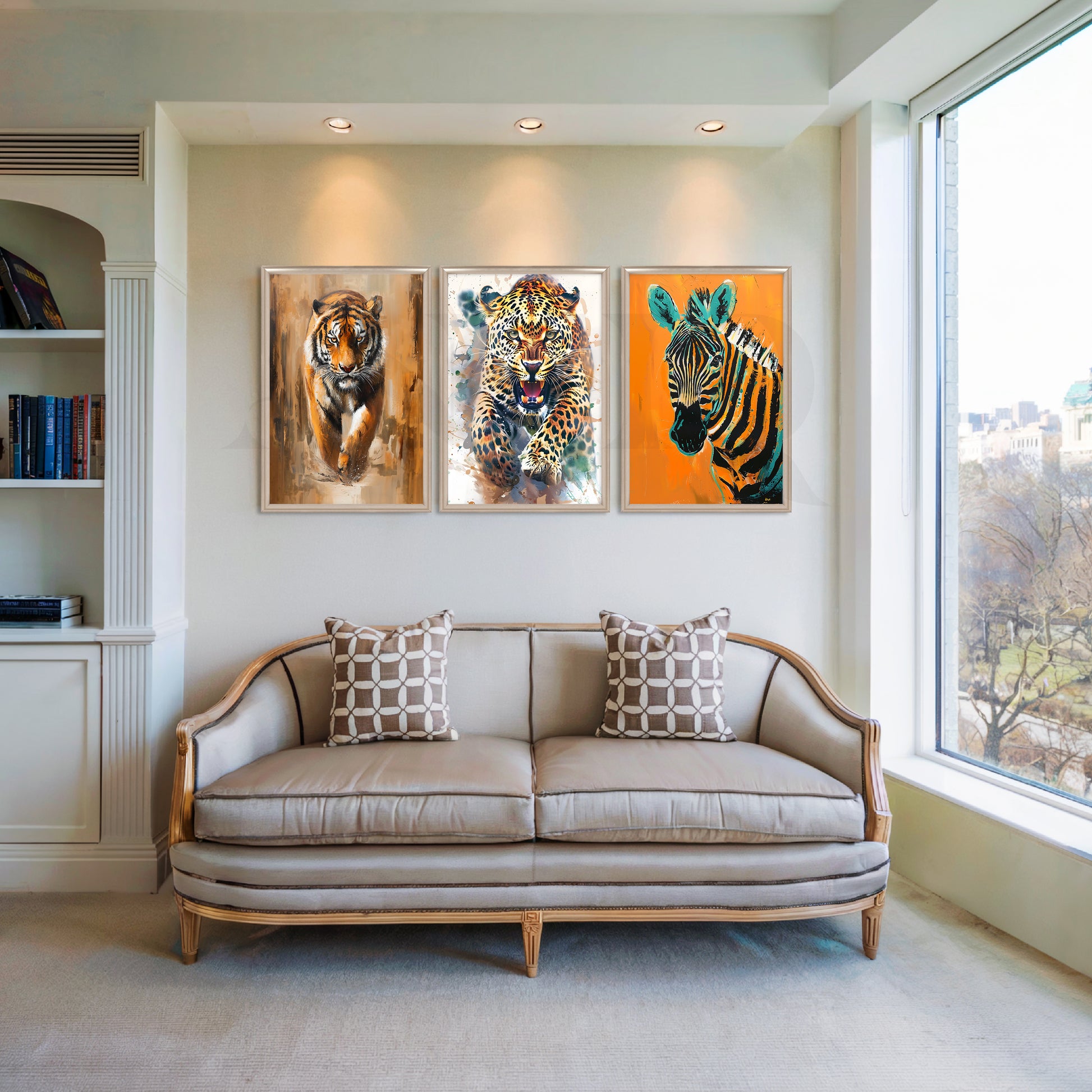 Anciq ‘Wild Kingdom’ Gallery Wall showcases the raw power of nature through striking portraits of a tiger, leopard, and zebra. Perfect for living rooms, offices, or study spaces, this 3-piece animal art set brings strength and vitality to your décor. Ideal for wildlife wall art or modern animal-themed interiors.