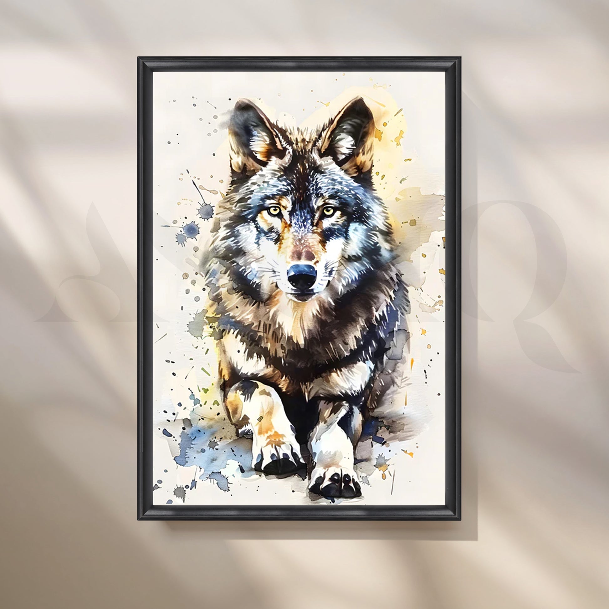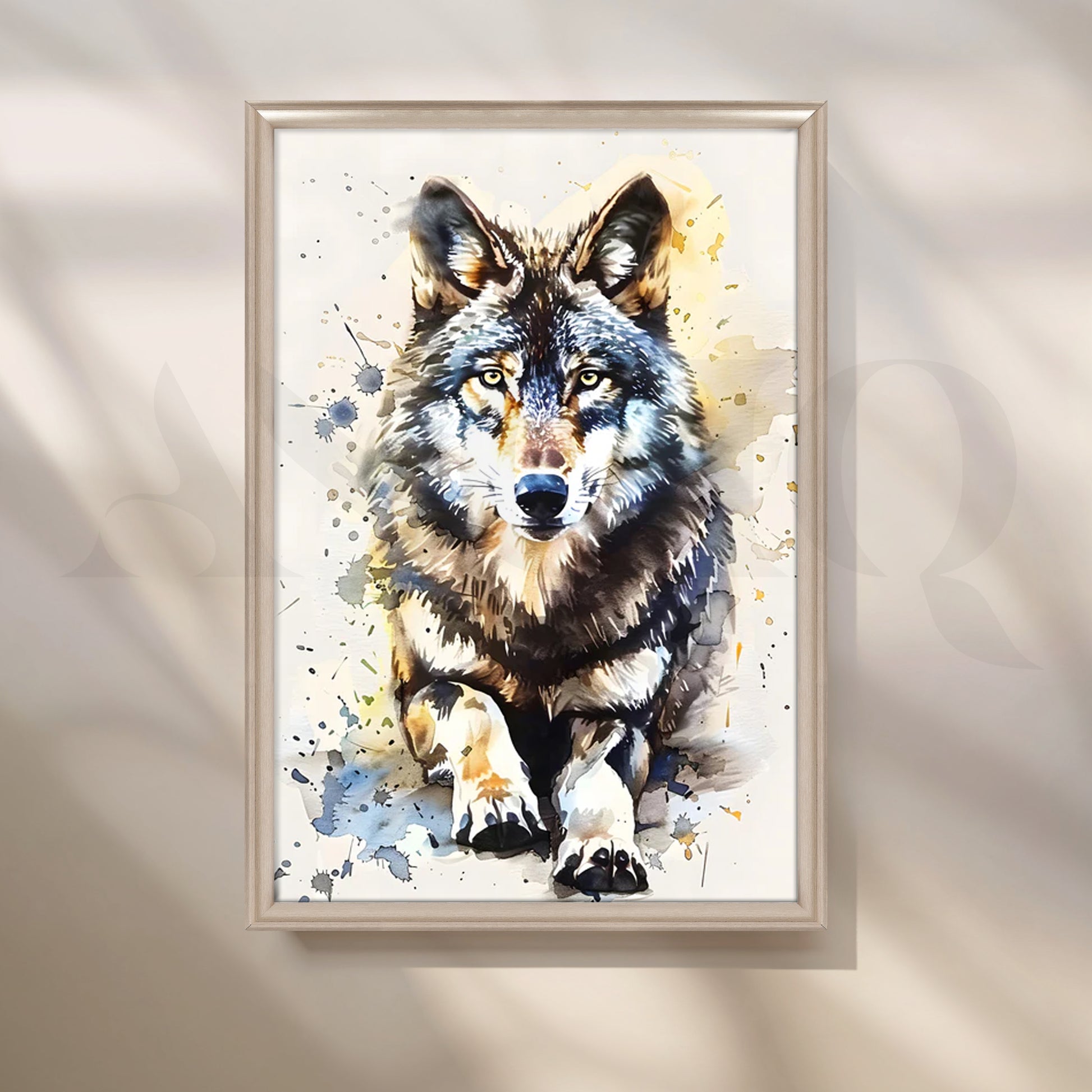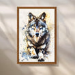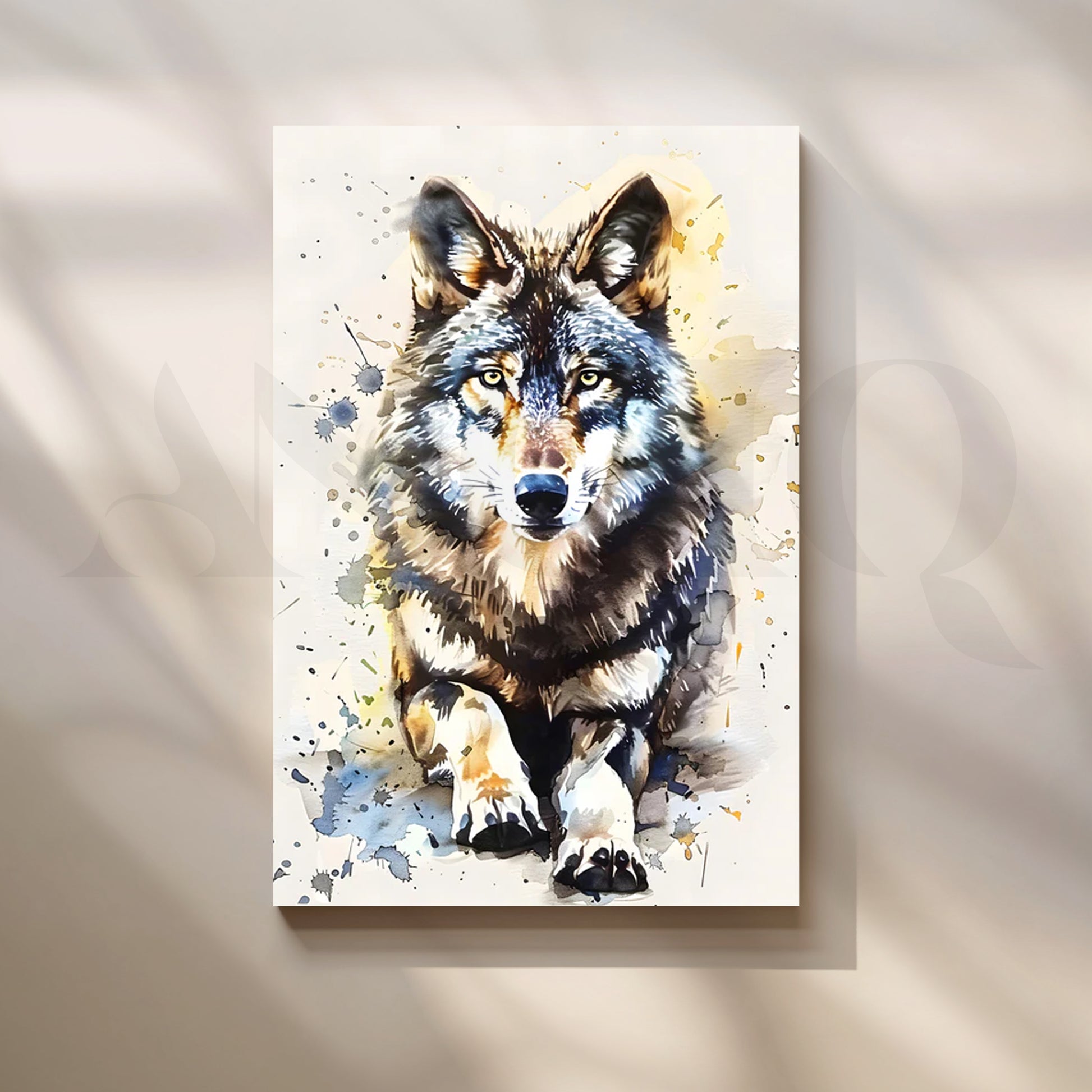 Commanding and calm, this modern wall art features a majestic wolf rendered in watercolor splashes—cool greys, inky blacks, and soft neutrals—perfect for a sleek office or study. The detailed gaze and painterly drips add movement and depth, making it a standout animal canvas painting for a gallery wall. Style it as large living room art, office décor, or entryway statement; works with minimalist, Scandinavian, and rustic-modern interiors searching for bold wildlife art.