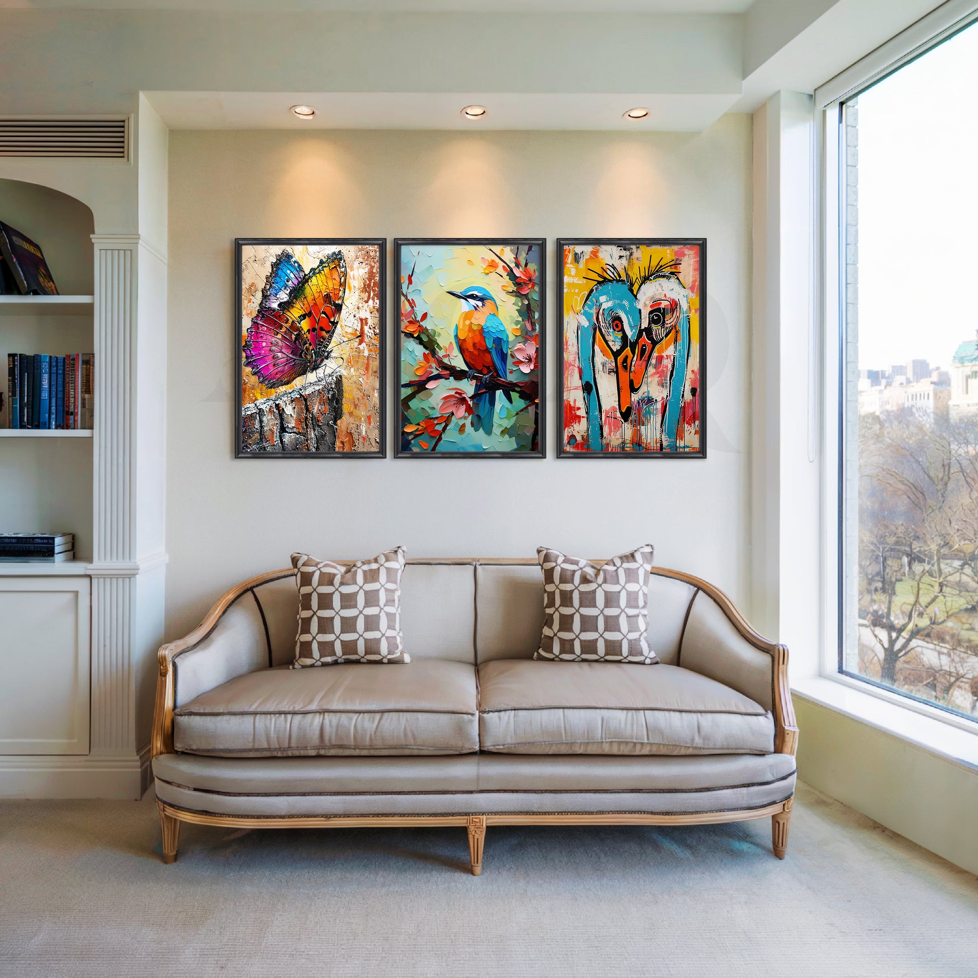 Anciq ‘Wings of Wonder’ Gallery Wall captures the beauty of nature with a butterfly, bird, and abstract creature in vibrant hues. Perfect for living rooms, hallways, or lounges, this 3-piece set brings colour and curiosity to your décor. Ideal for nature-inspired wall art lovers.
