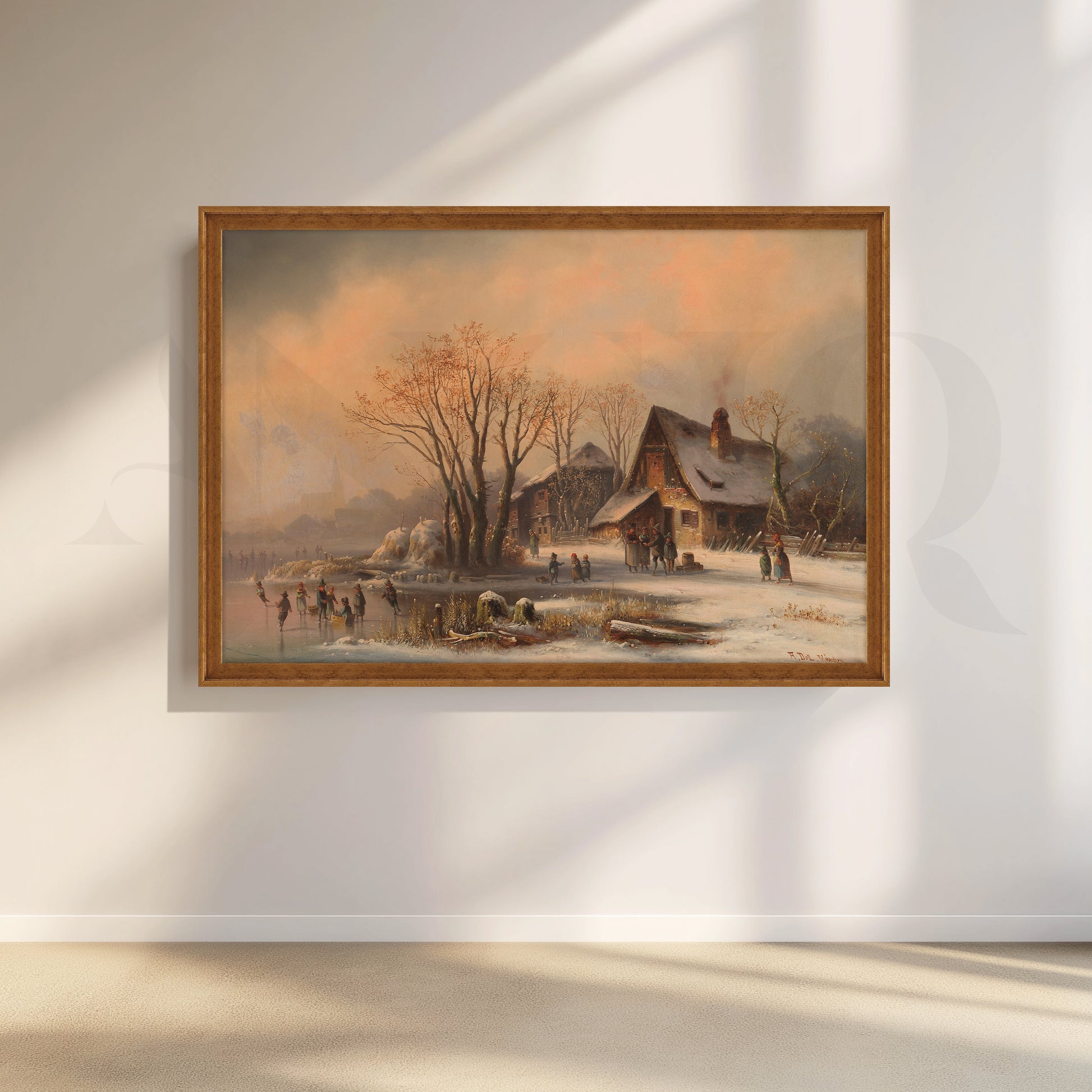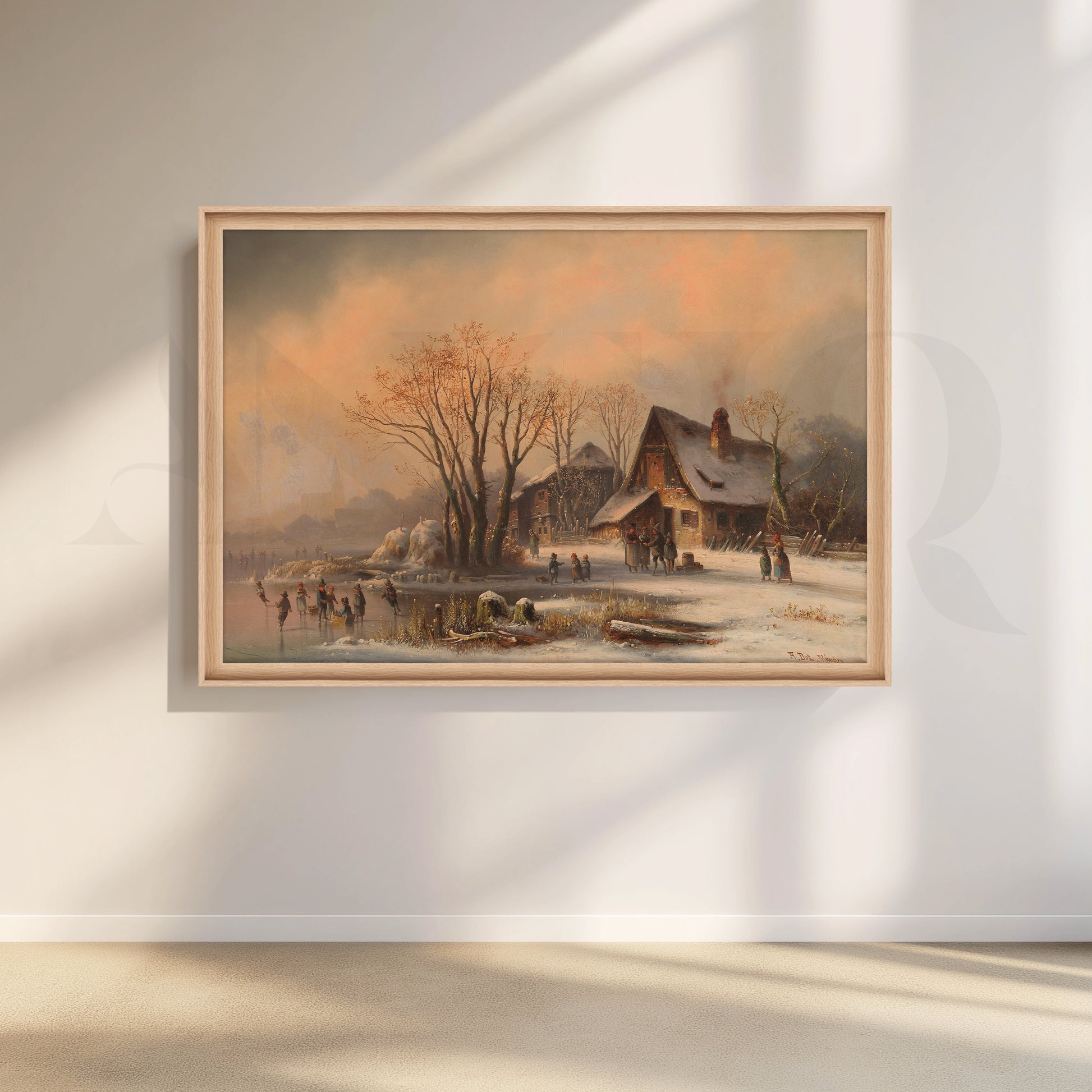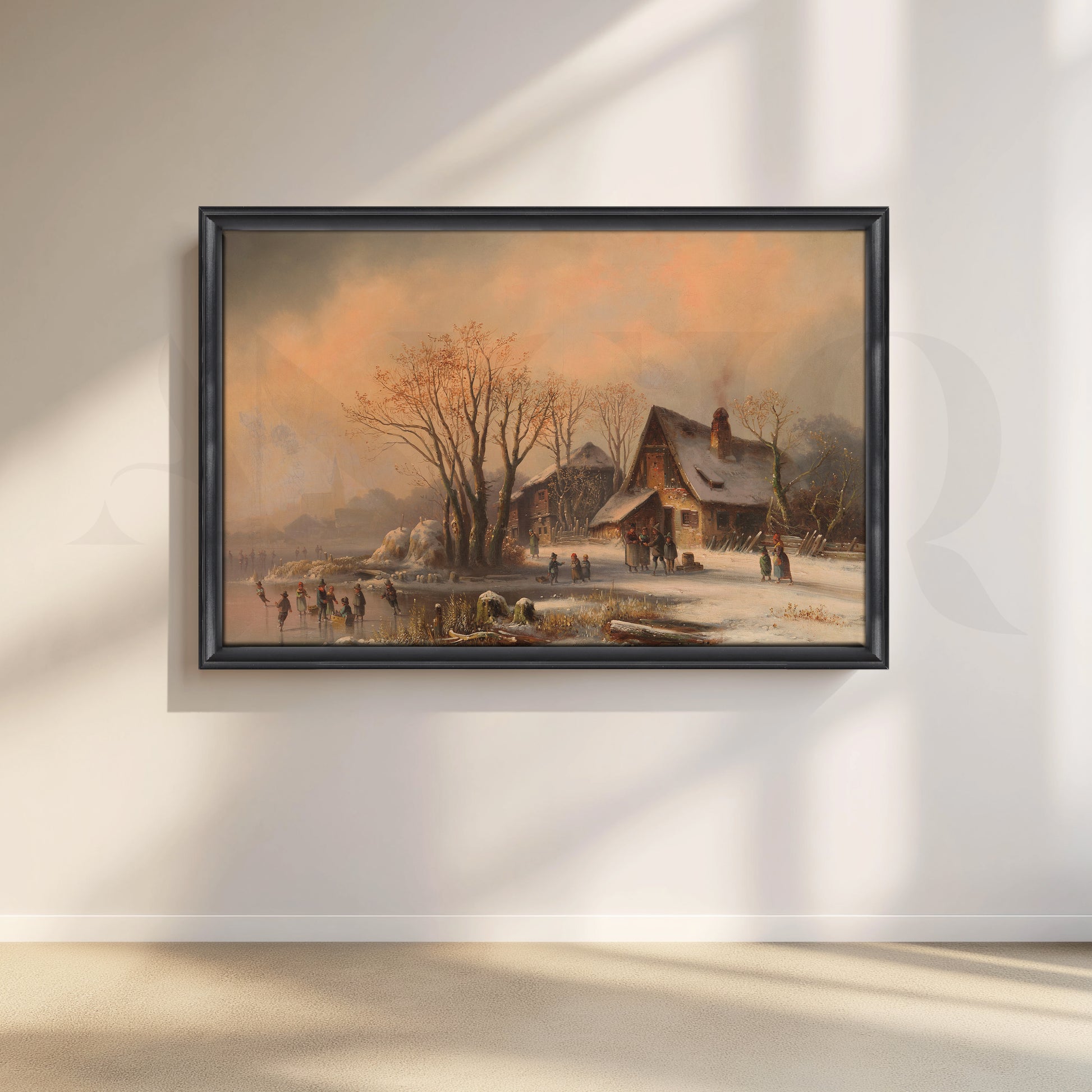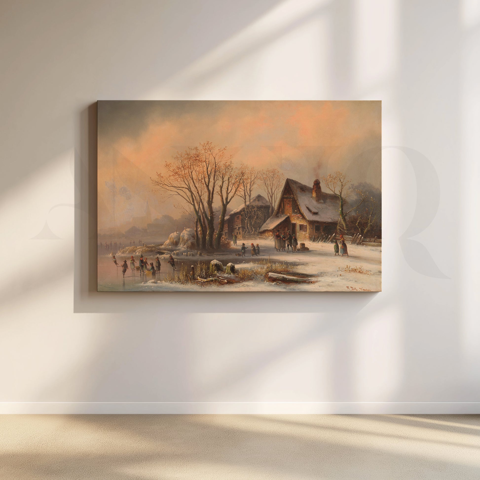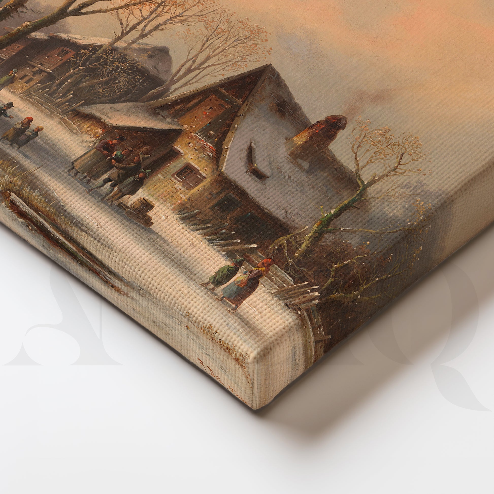 This winter cottage ice rink canvas artwork depicts skaters on a frozen pond beside snow-covered houses at sunset. Perfect as cozy living room wall décor, it adds festive winter ambience, nostalgic village charm and soft golden light, making it a beautiful seasonal focal piece for classic and modern homes.