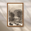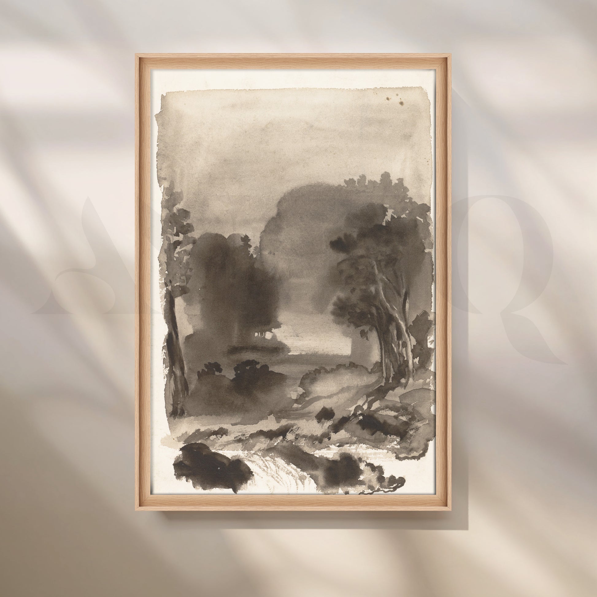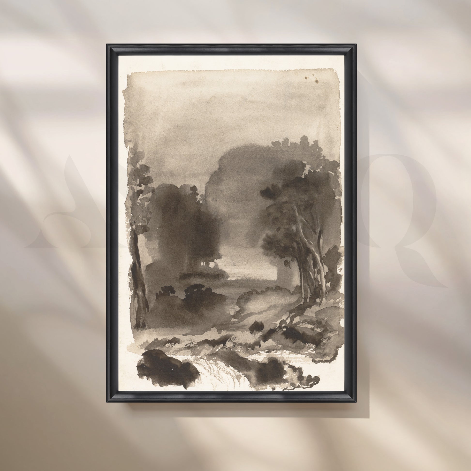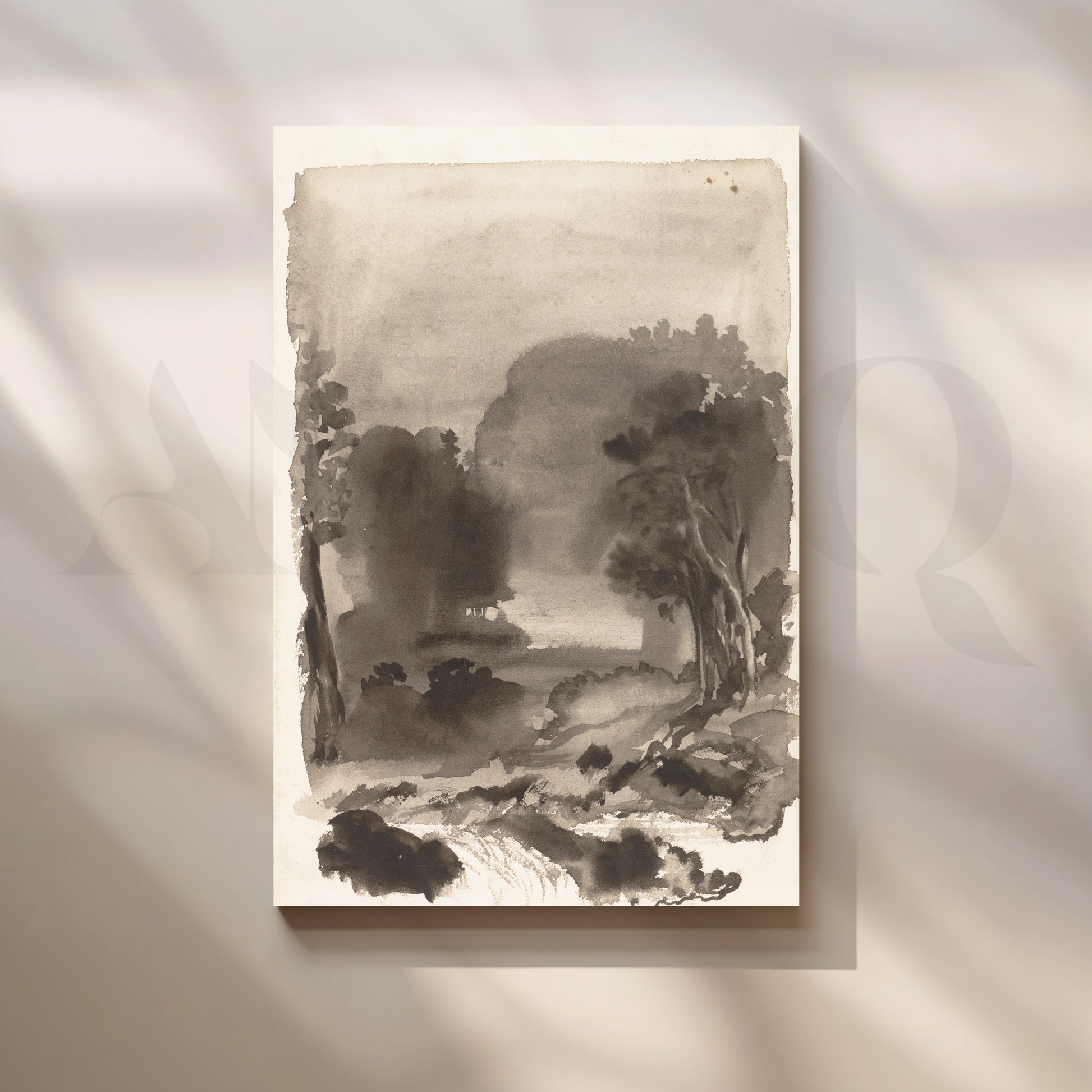 Monochrome ink-wash trees dissolve into atmospheric fog, echoing classic East-Asian brushwork. A meditative landscape perfect for reading corners, meditation areas and minimalist interiors. Keywords: ink wash painting, black and white landscape art, zen wall décor, Japanese style canvas, minimalist artwork, calming home print.