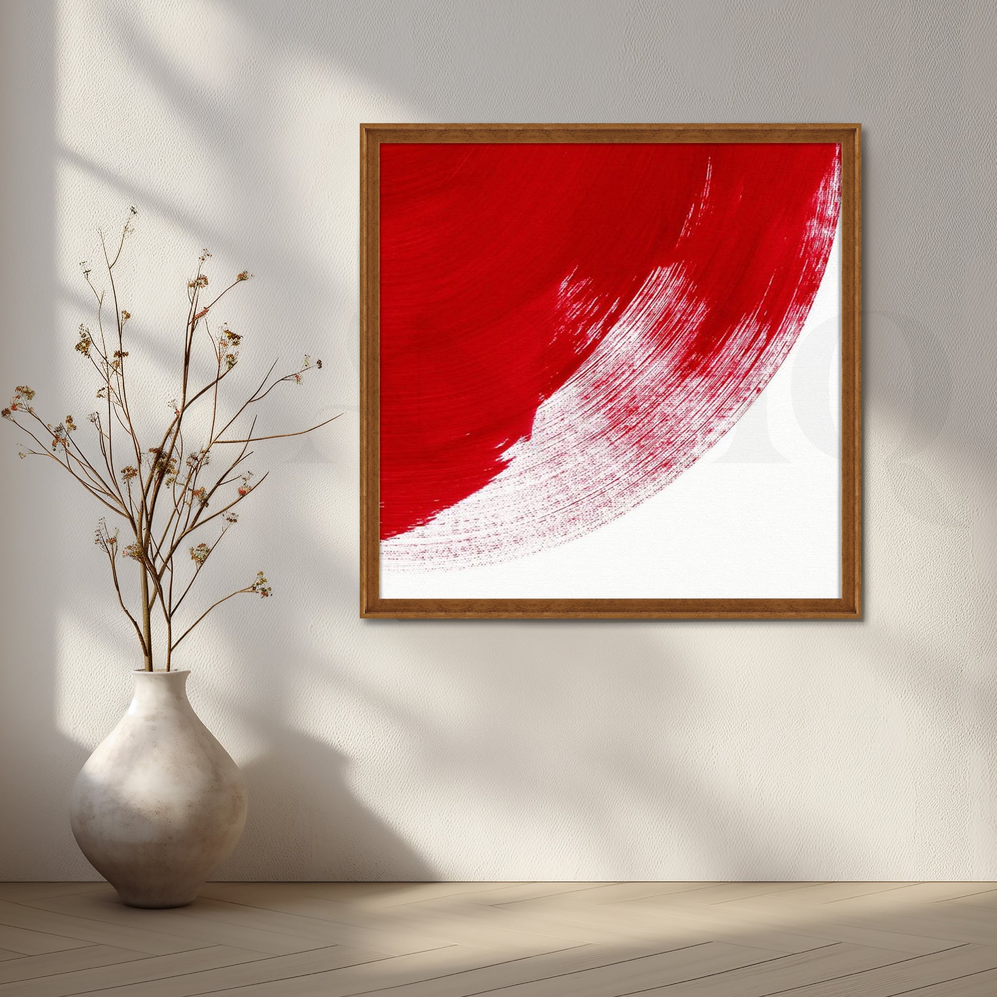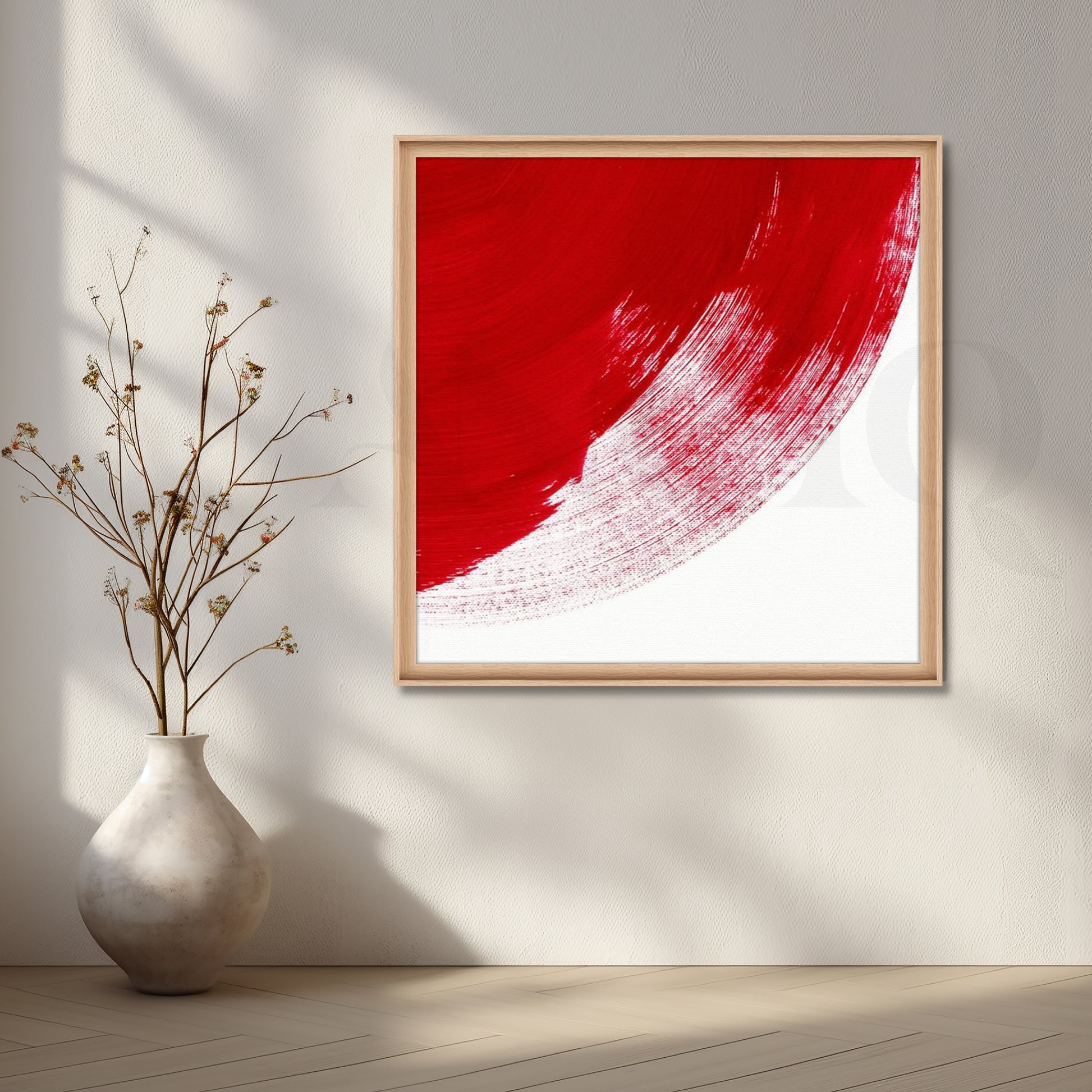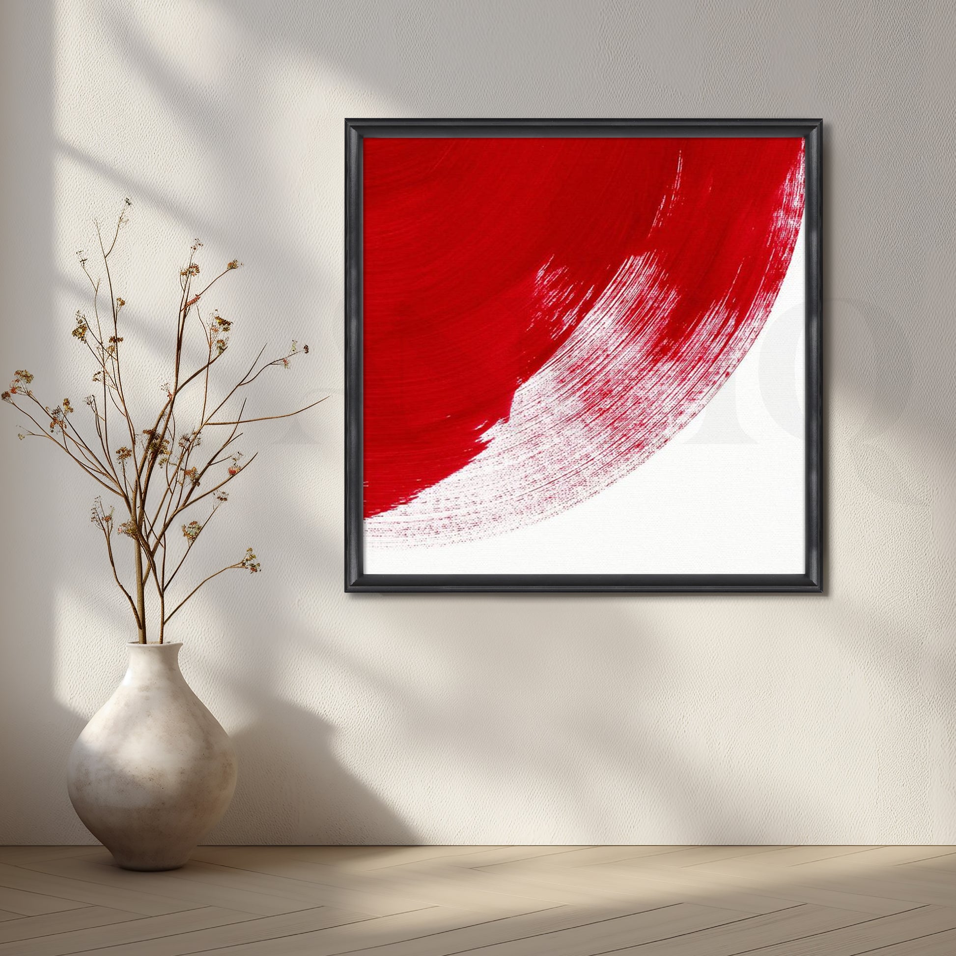 A single sweeping red brushstroke arcs over crisp white, balancing motion and quiet in pure minimalism. Ideal for contemporary foyers, corridors, and gallery-style spaces that favor clean design and Japanese-inspired aesthetics. Keywords: minimalist red painting, abstract brush stroke art, modern entryway wall art, zen canvas, Japanese minimal decor, white red artwork.